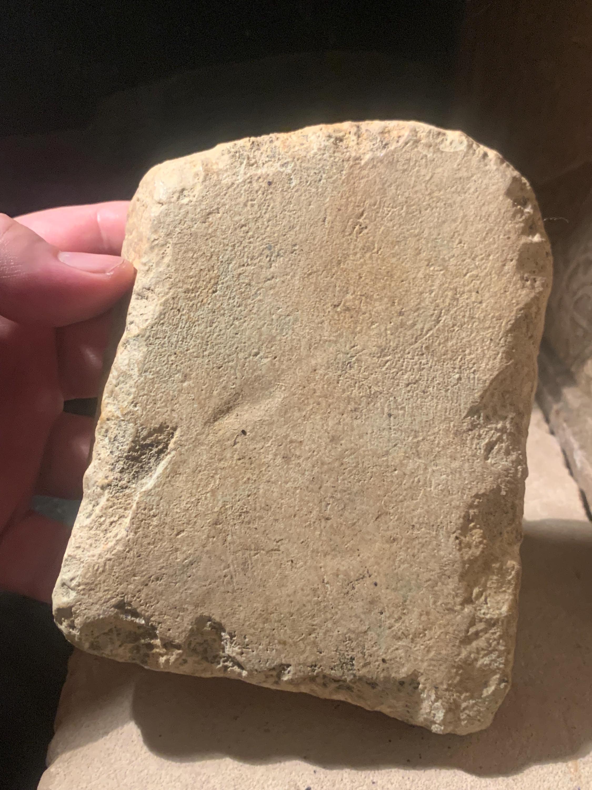 Made of a strong composition stone this fragment has a light ochre colouration with a realistic patina.