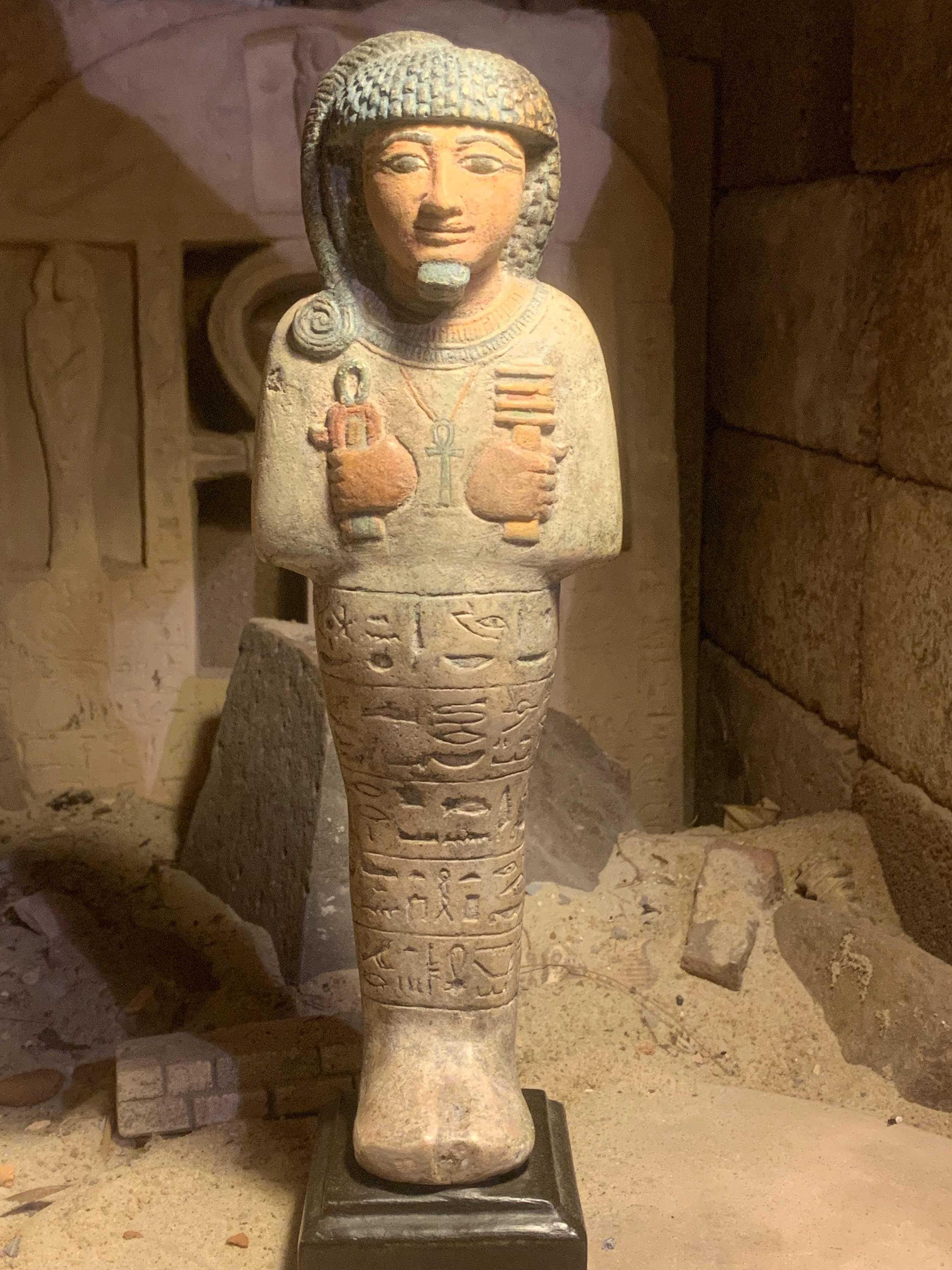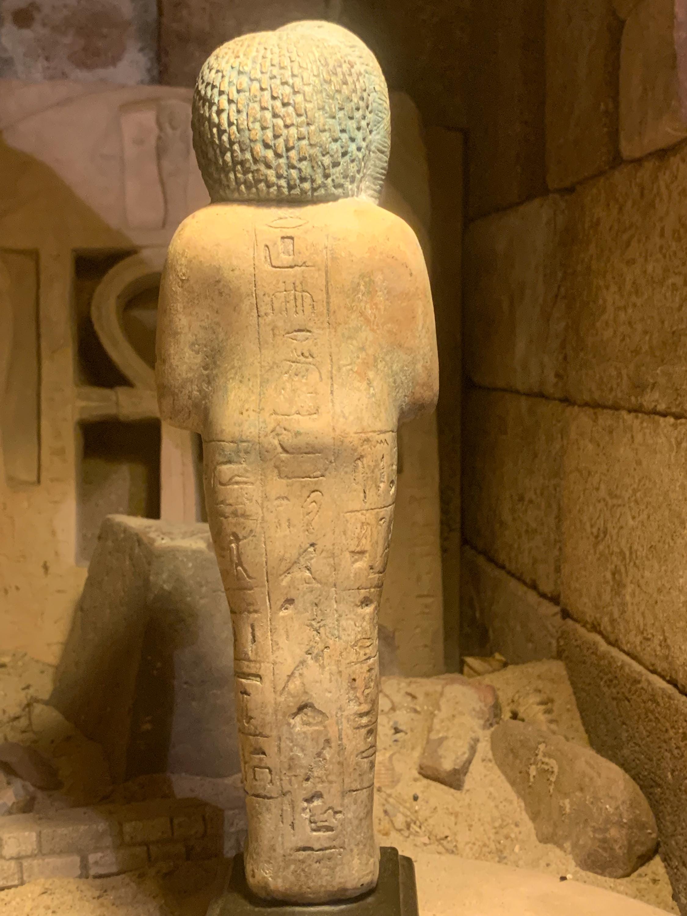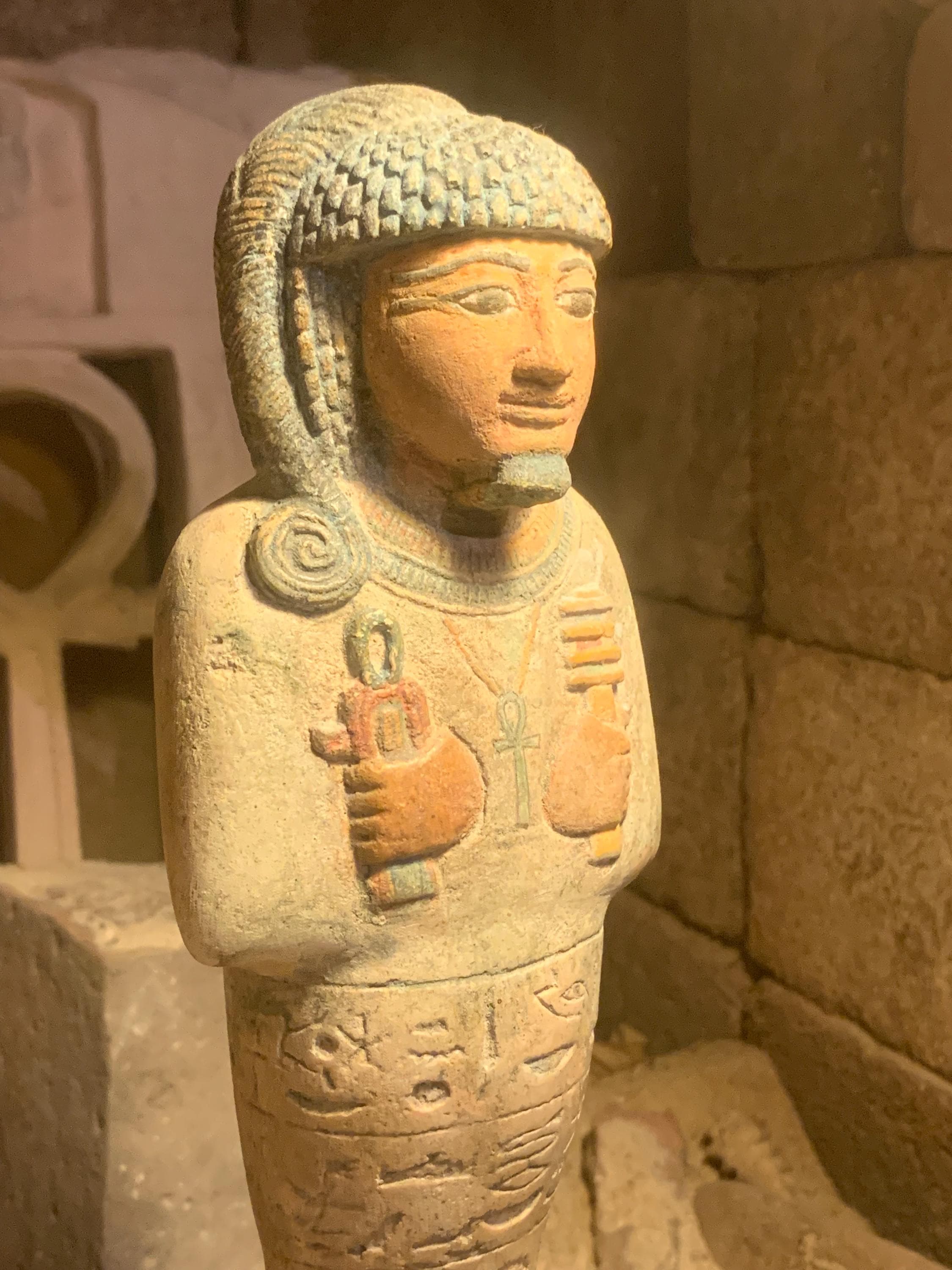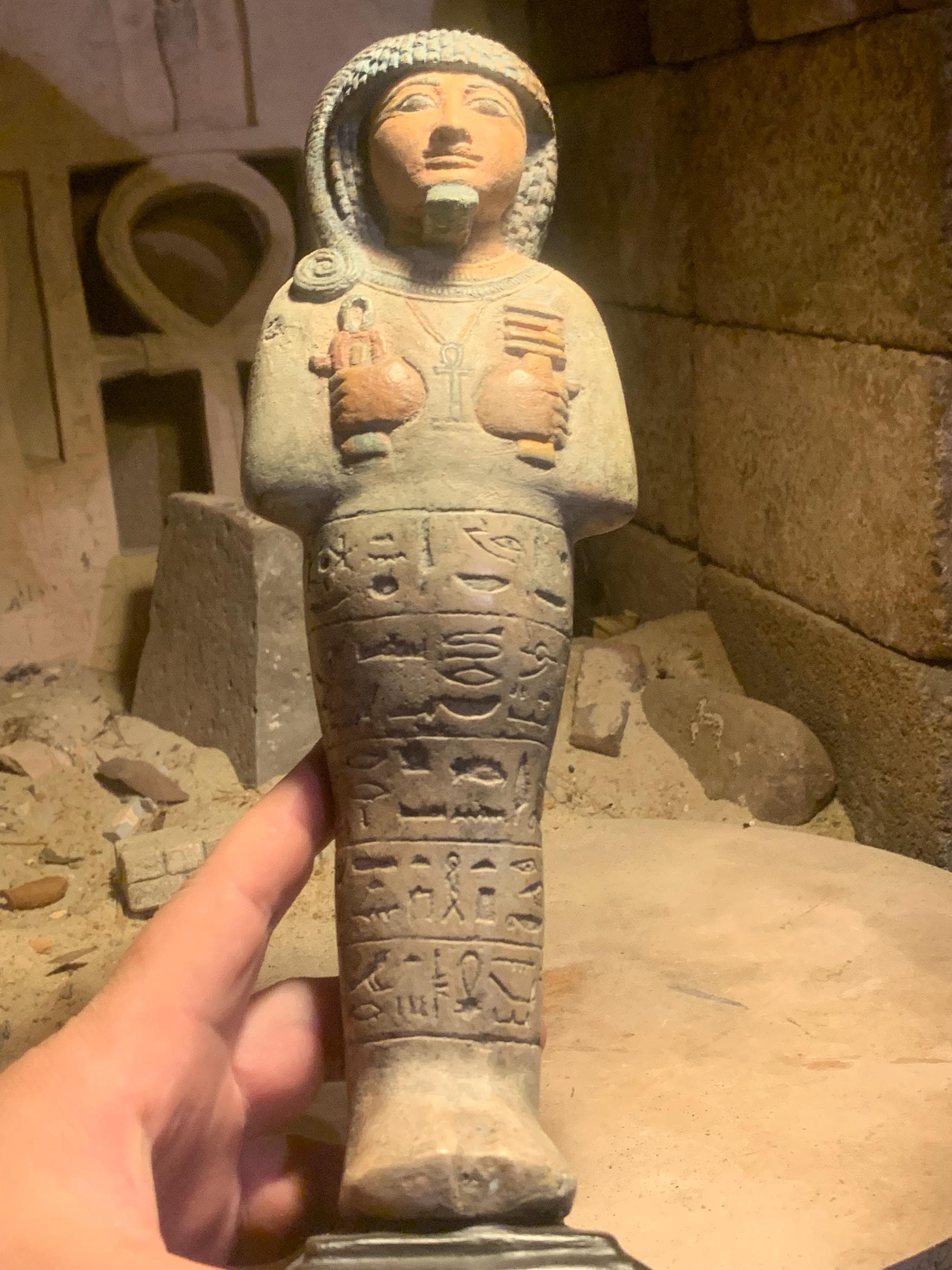 Ushabtis were placed in a a wall niche and presided over the burial. These Ushabtis were of a similar shape and design to the one on offer which originates from this burial complex.