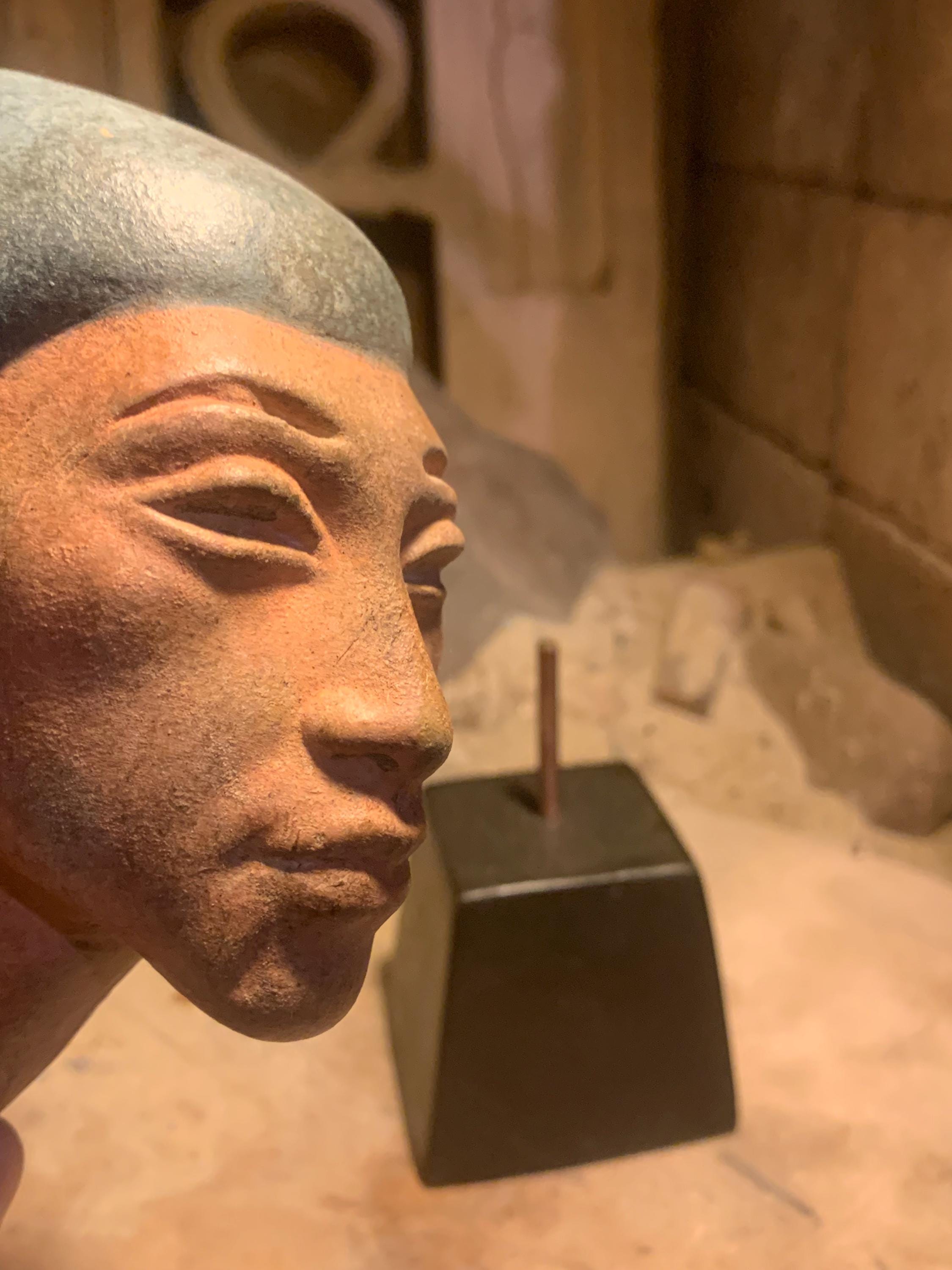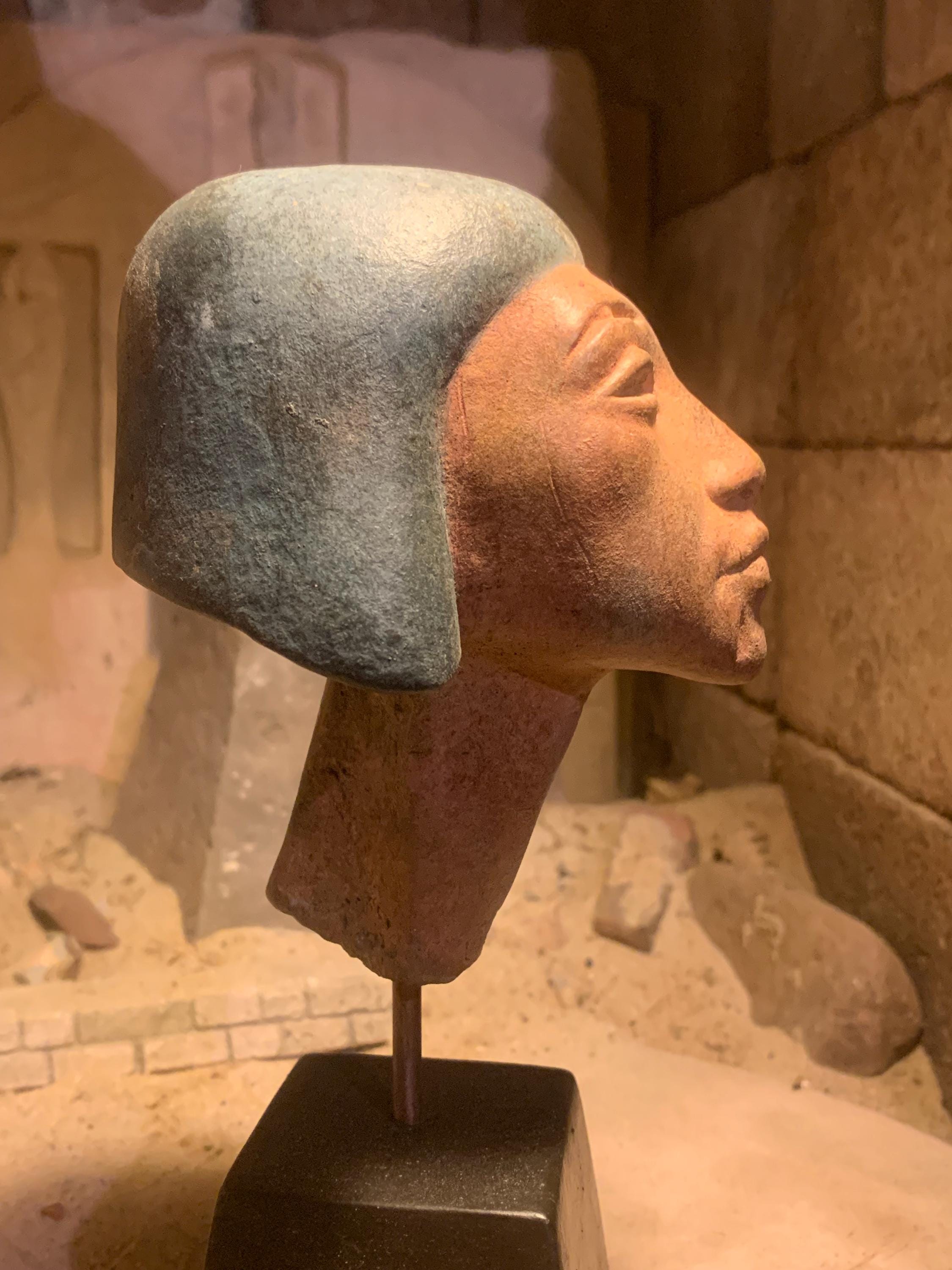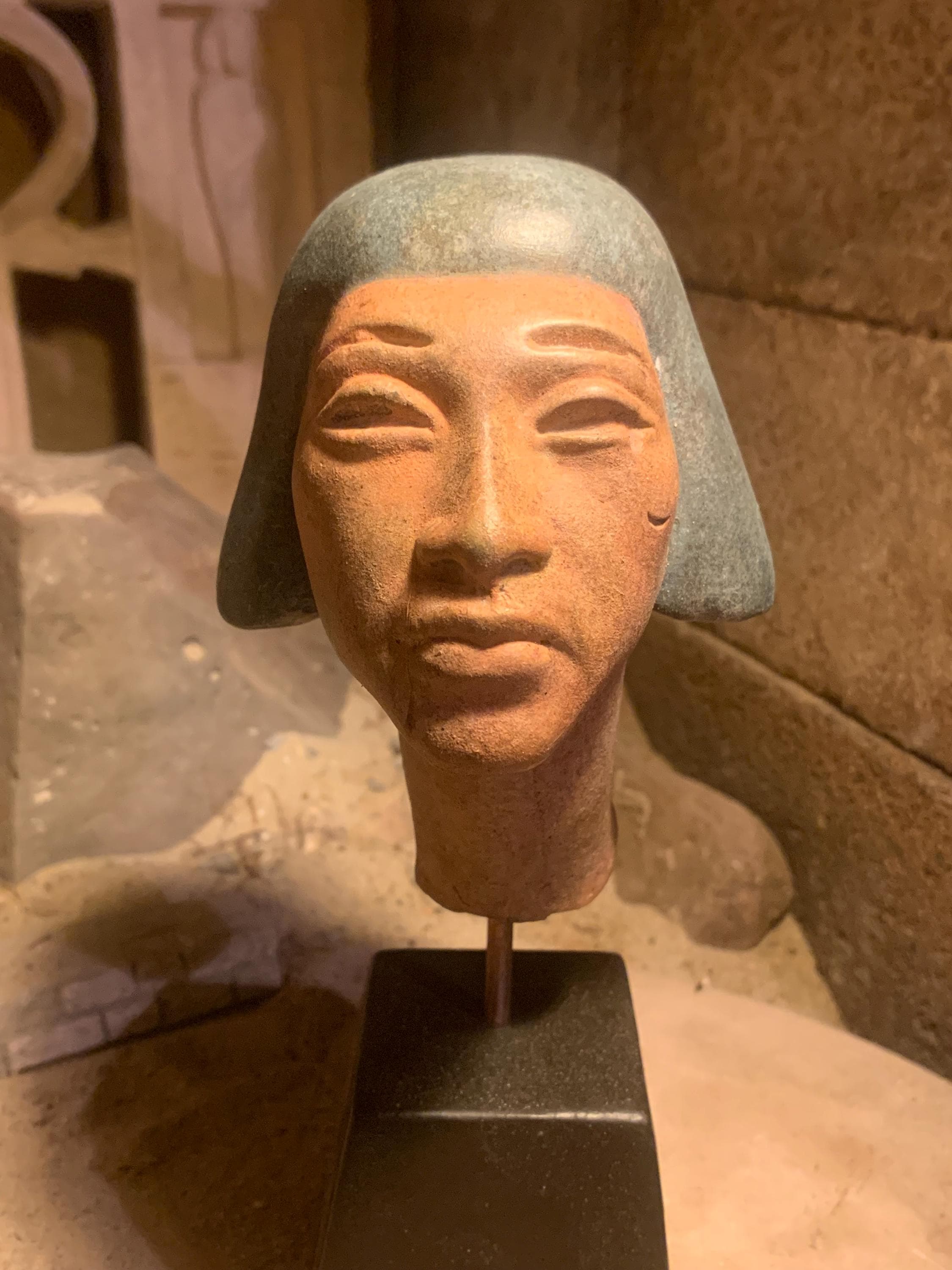 The identity of the portrait can't be specifically attributed to Akhenaten himself, as evidence of a uraeus cobra on the forehead cannot be traced. Nor are the bands that would support the cobra, present here. This particular wig is also something Akhenaten is never shown wearing but perhaps in private, a simple wig such as this would not be out of place. A king can't wear a crown all of the time.