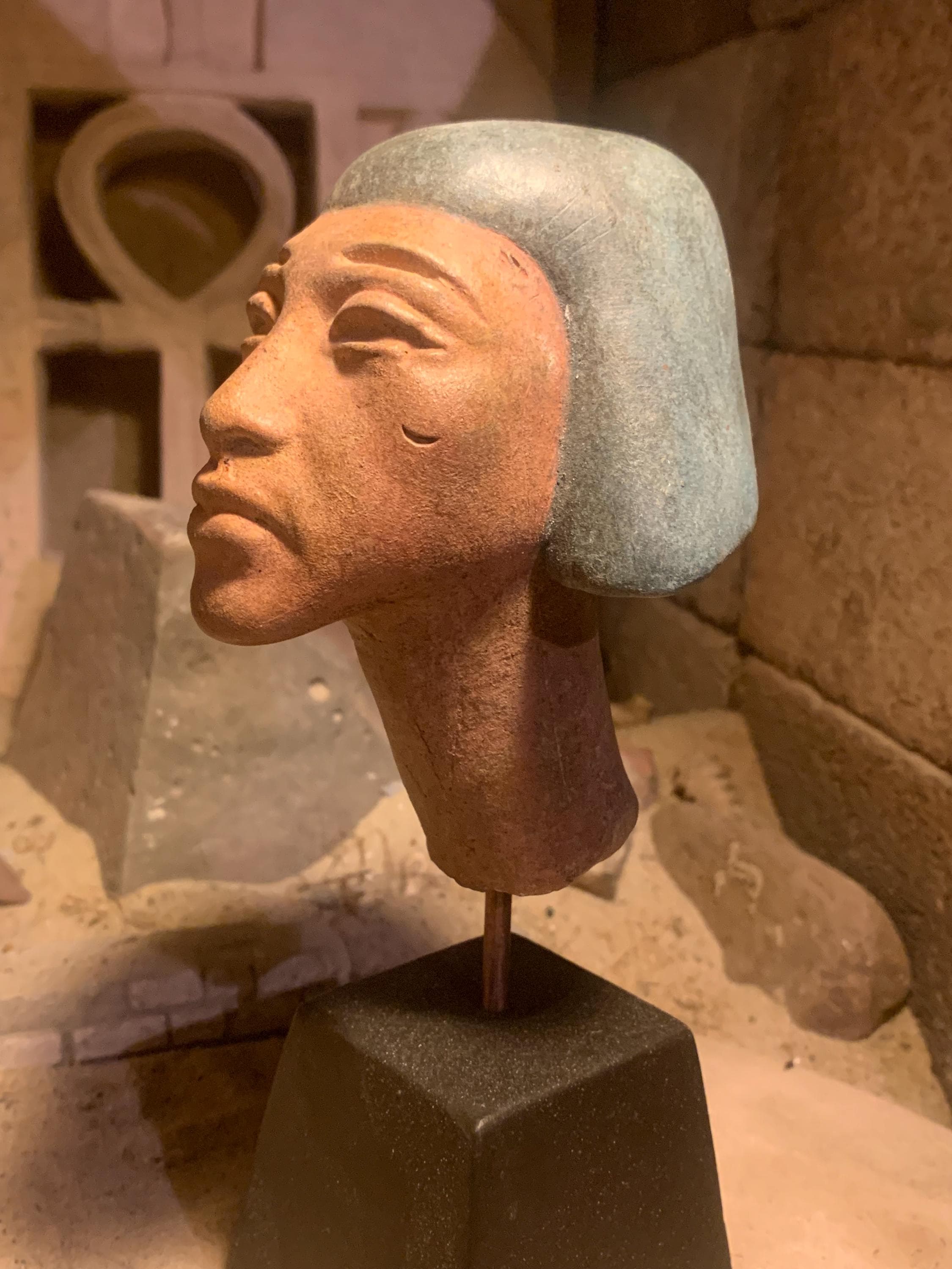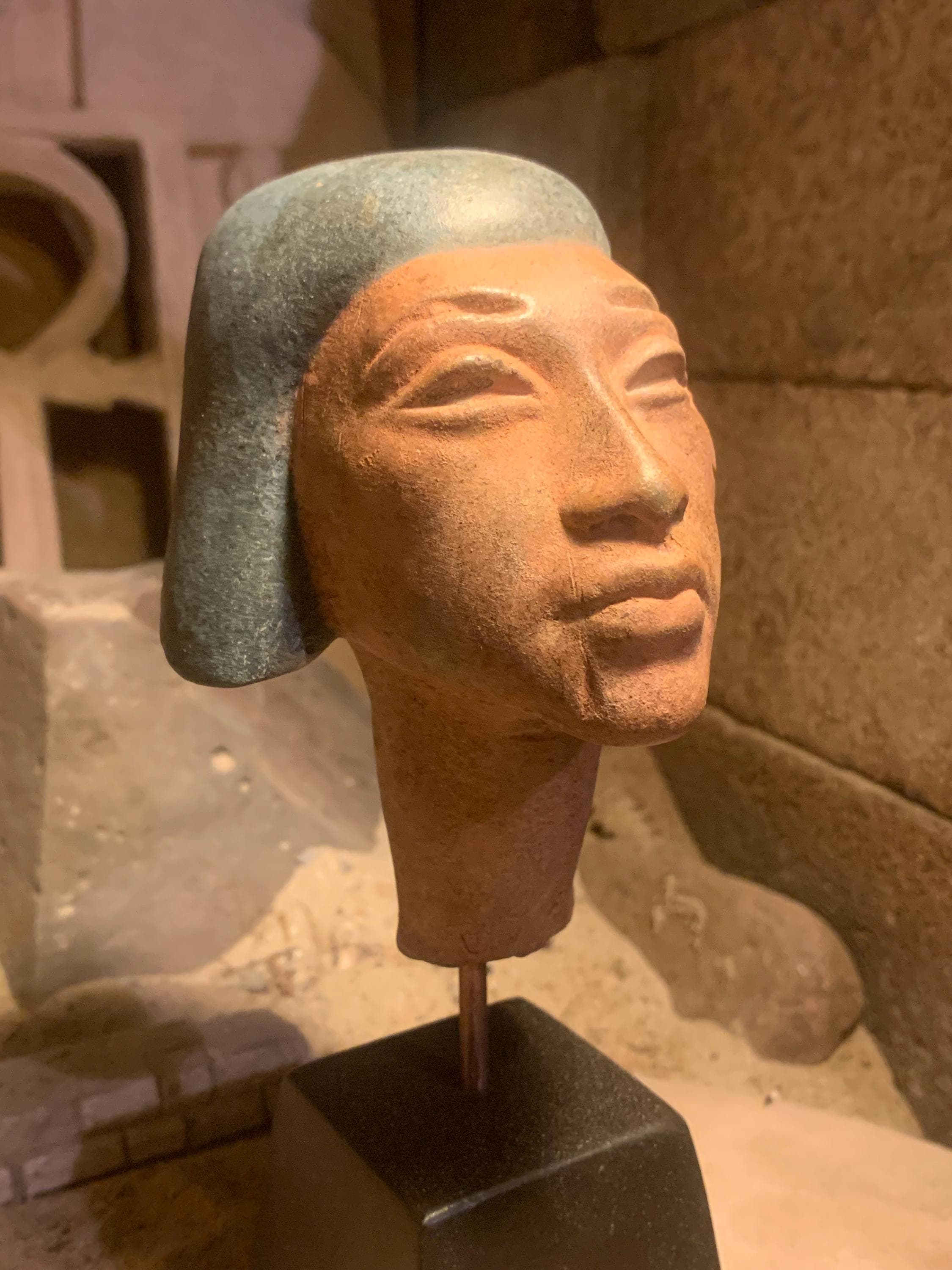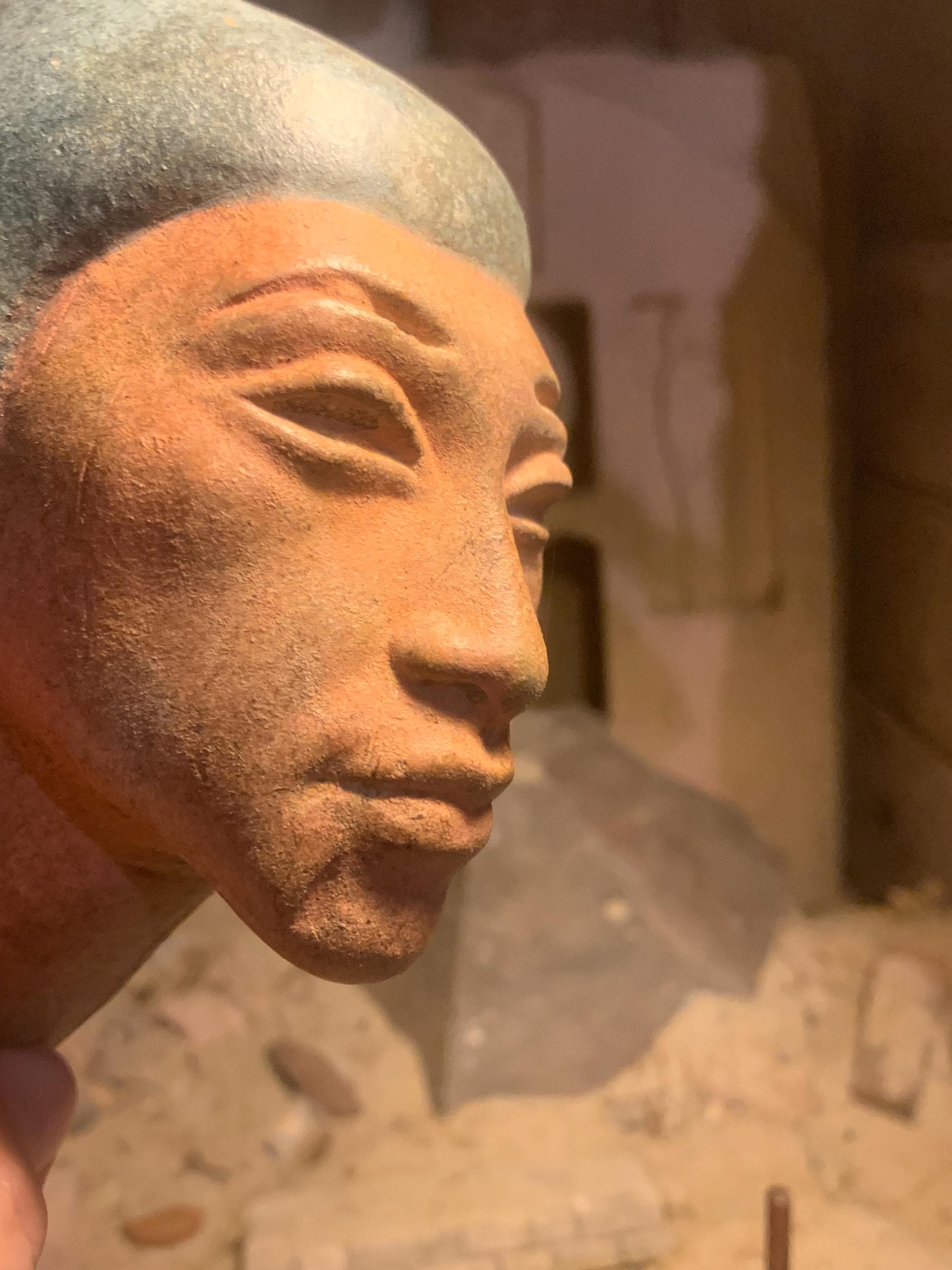 The identity of the portrait can't be specifically attributed to Akhenaten himself, as evidence of a uraeus cobra on the forehead cannot be traced. Nor are the bands that would support the cobra, present here. This particular wig is also something Akhenaten is never shown wearing but perhaps in private, a simple wig such as this would not be out of place. A king can't wear a crown all of the time.