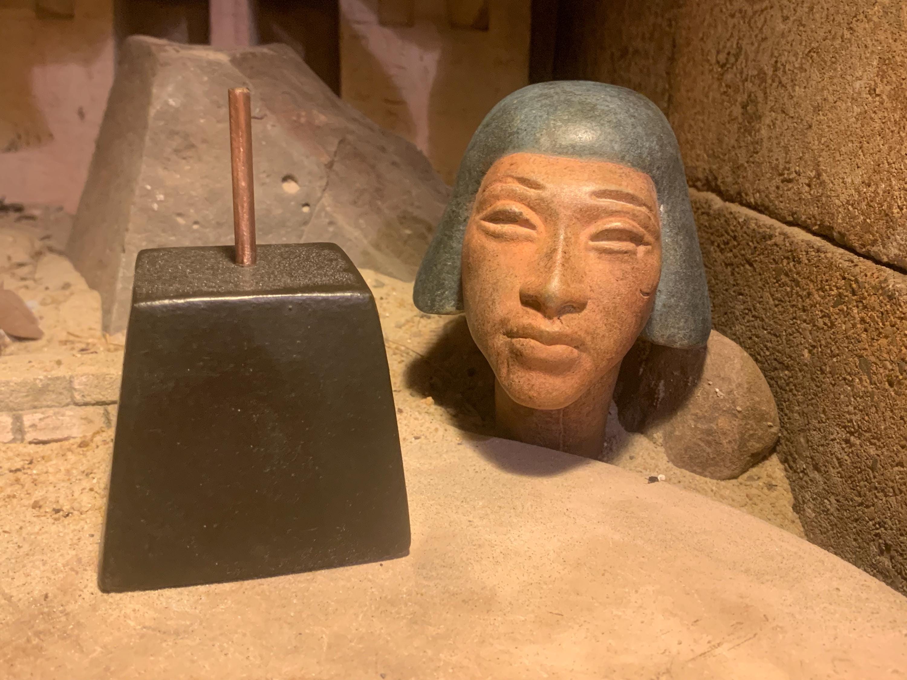 On offer here for the first time is a rare replica of King Akhenaten as a stylised figurehead that would have been joined to a harp or the arms of an elaborate chair. Made of a limestone and quartzite composition stone the piece has been textured and coloured to recreate the appearance of the original fragment. It is mounted on a removable felt based stand.