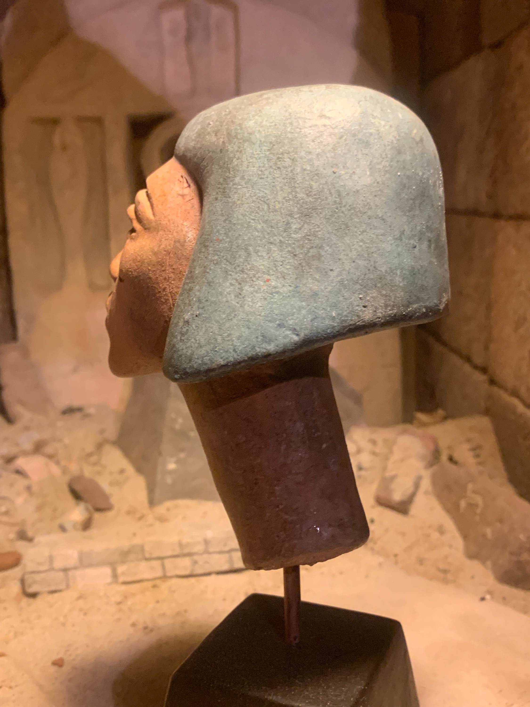 The face certainly looks like Akhenaten and it was quite common to infuse the official facial style of the reigning monarch into the applied arts. If indeed it was an instrument, it may have been played in the court of the king as the quality of the features are exceptional and made to be seen.
