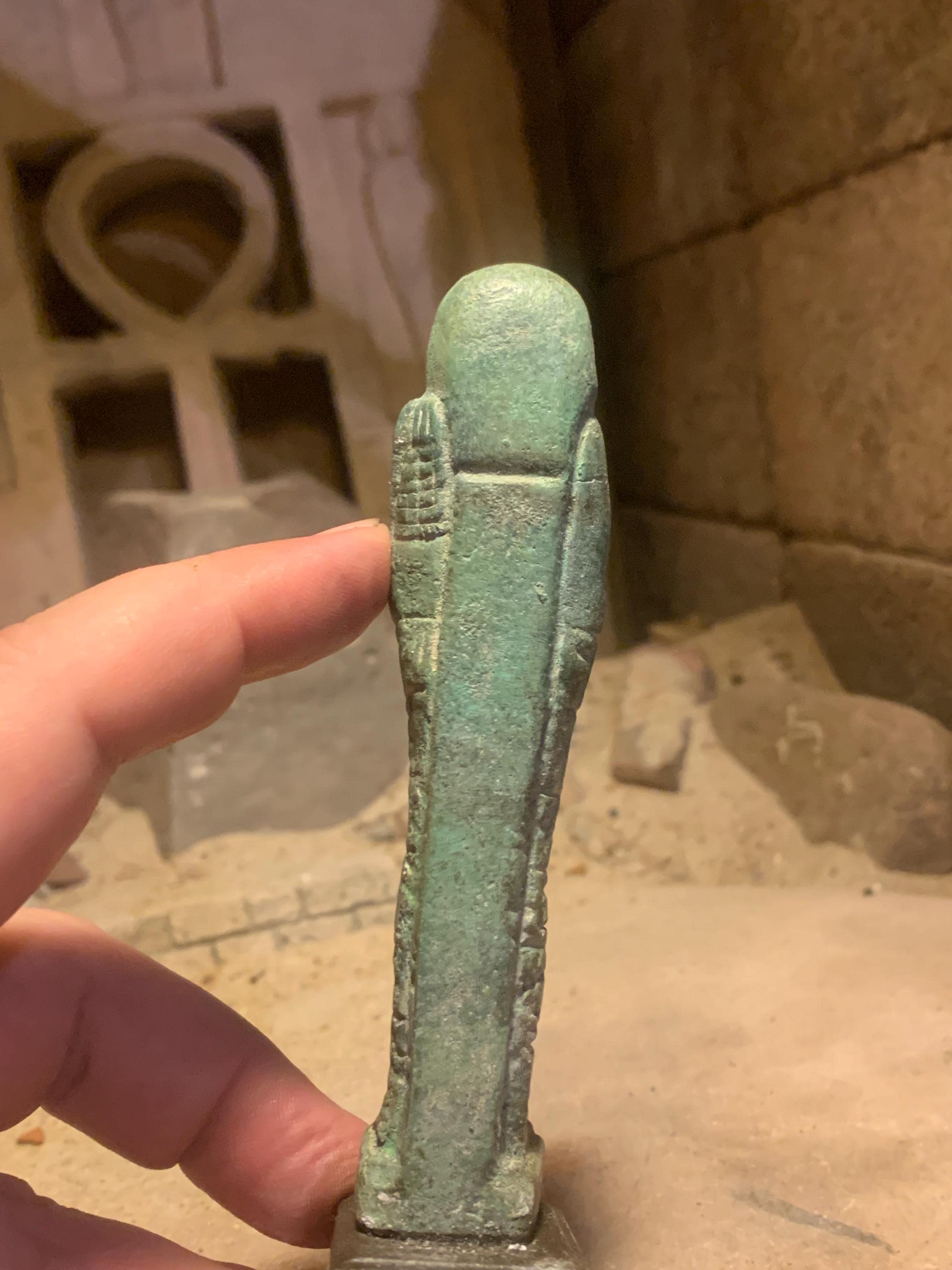 It clutches two farming implements that would have been put to good use in the afterlife as well as a bag of seeds for planting thrown over the shoulder. You can just make out the segments of the seed bag looking at the back view photograph hanging off the left shoulder.