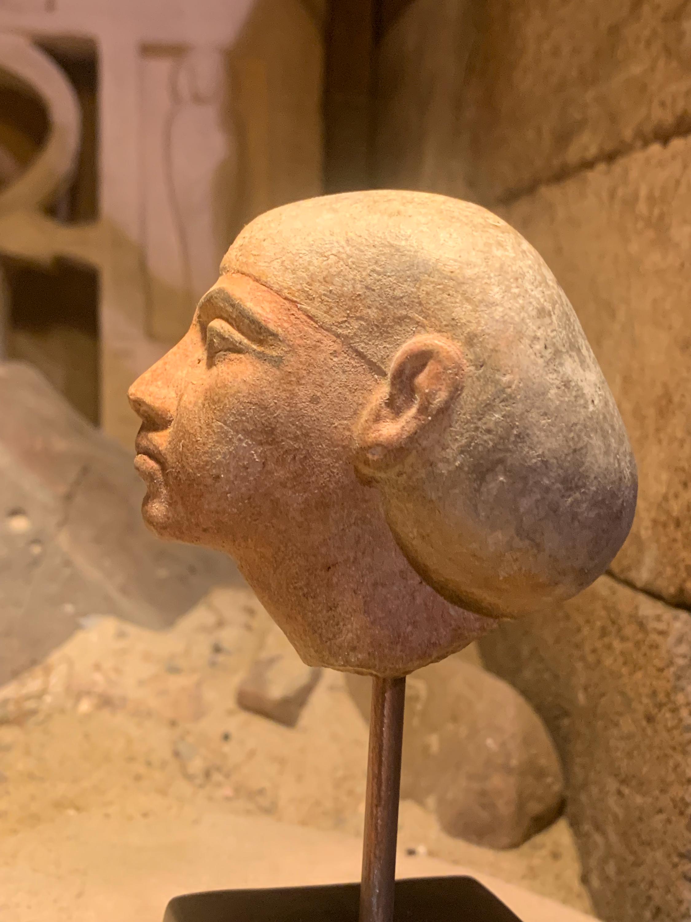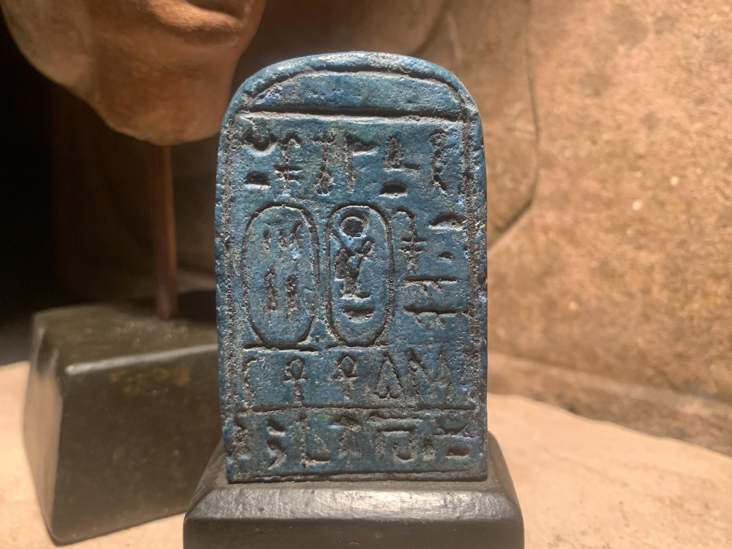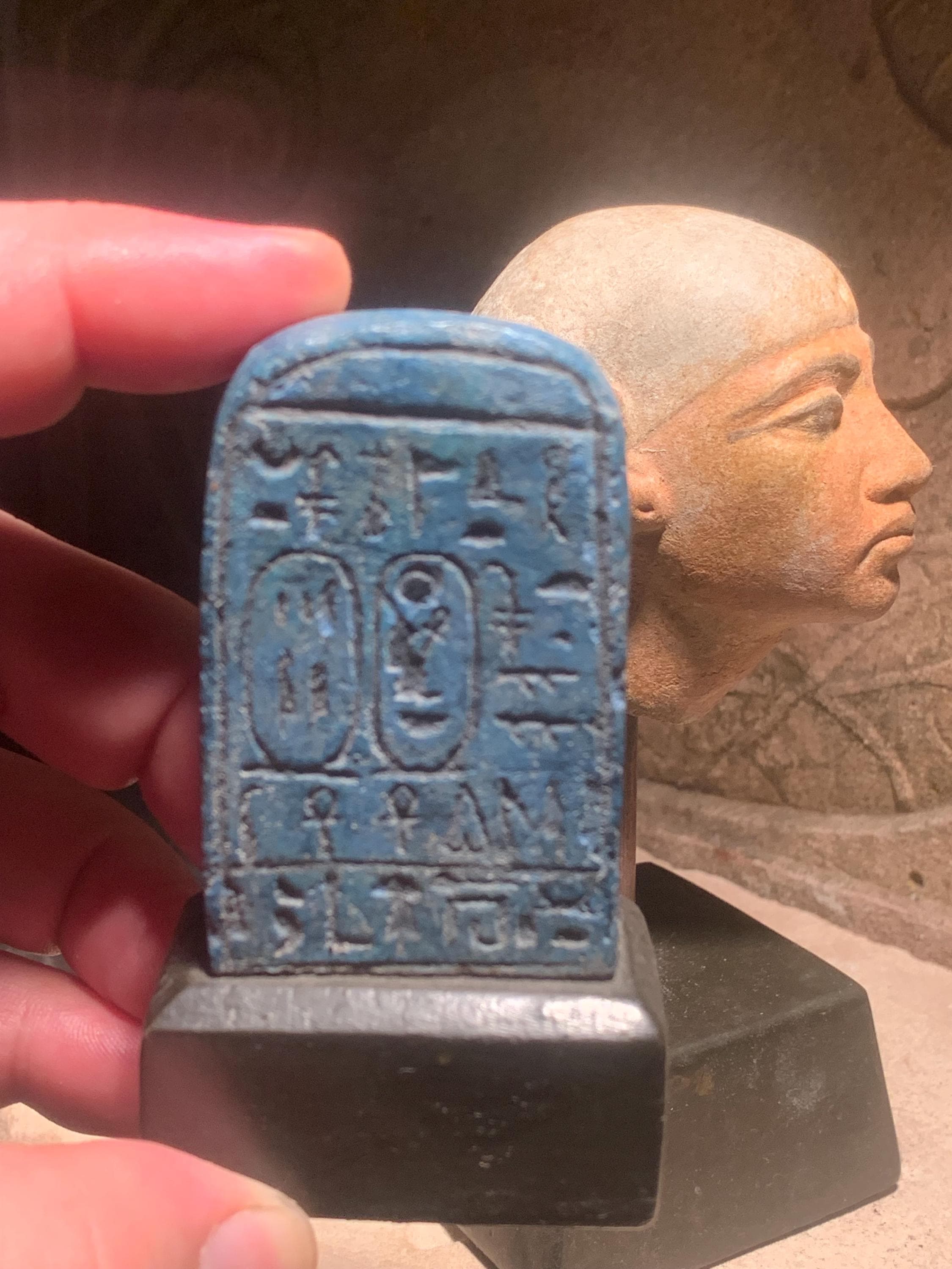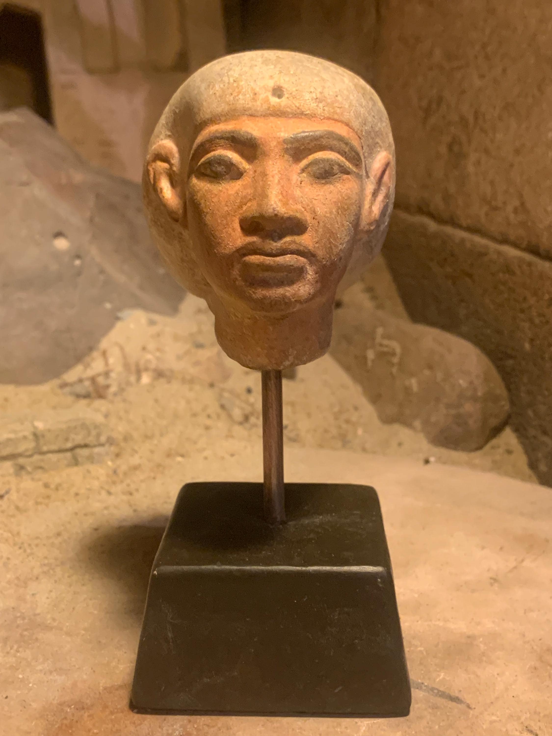 Made of a limestone and quartzite composition stone with carefully hand painted details replicating tones of the original fragment. It is mounted on a felt lined base and responds very well to overhead lighting. A simple desk lamp has been used in these photos and the contours of the face are the most striking feature of this particular representation of Queen Tiye.