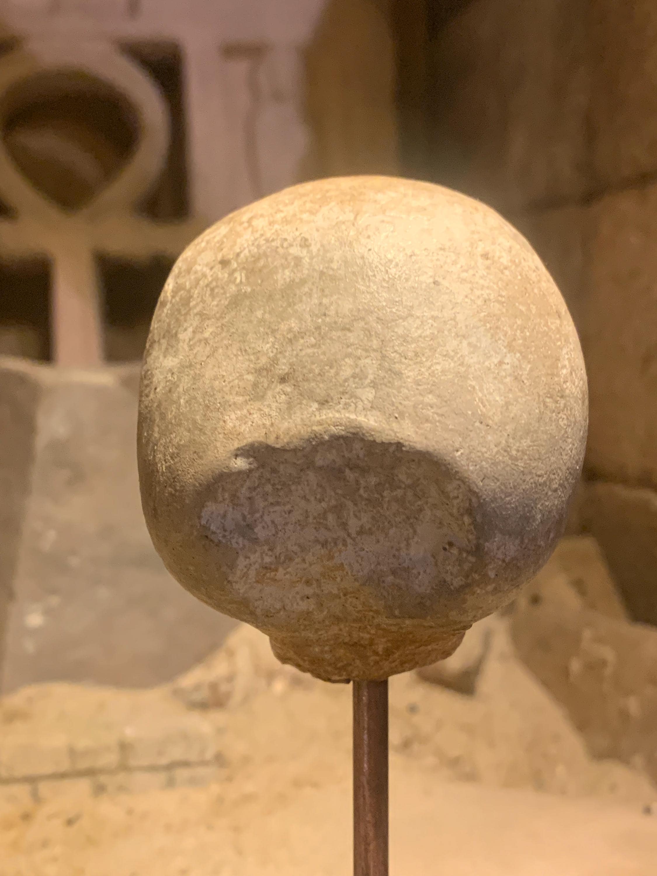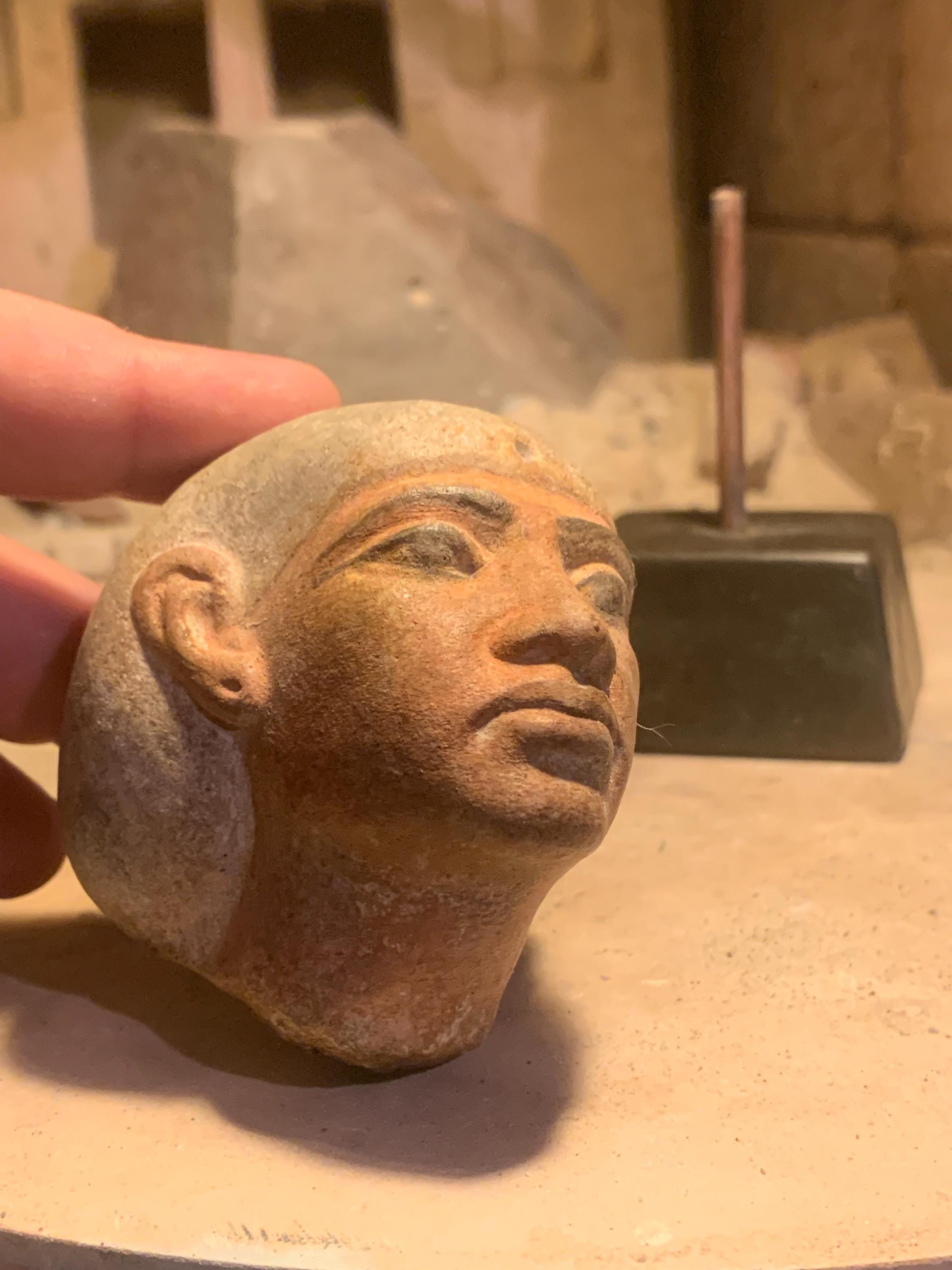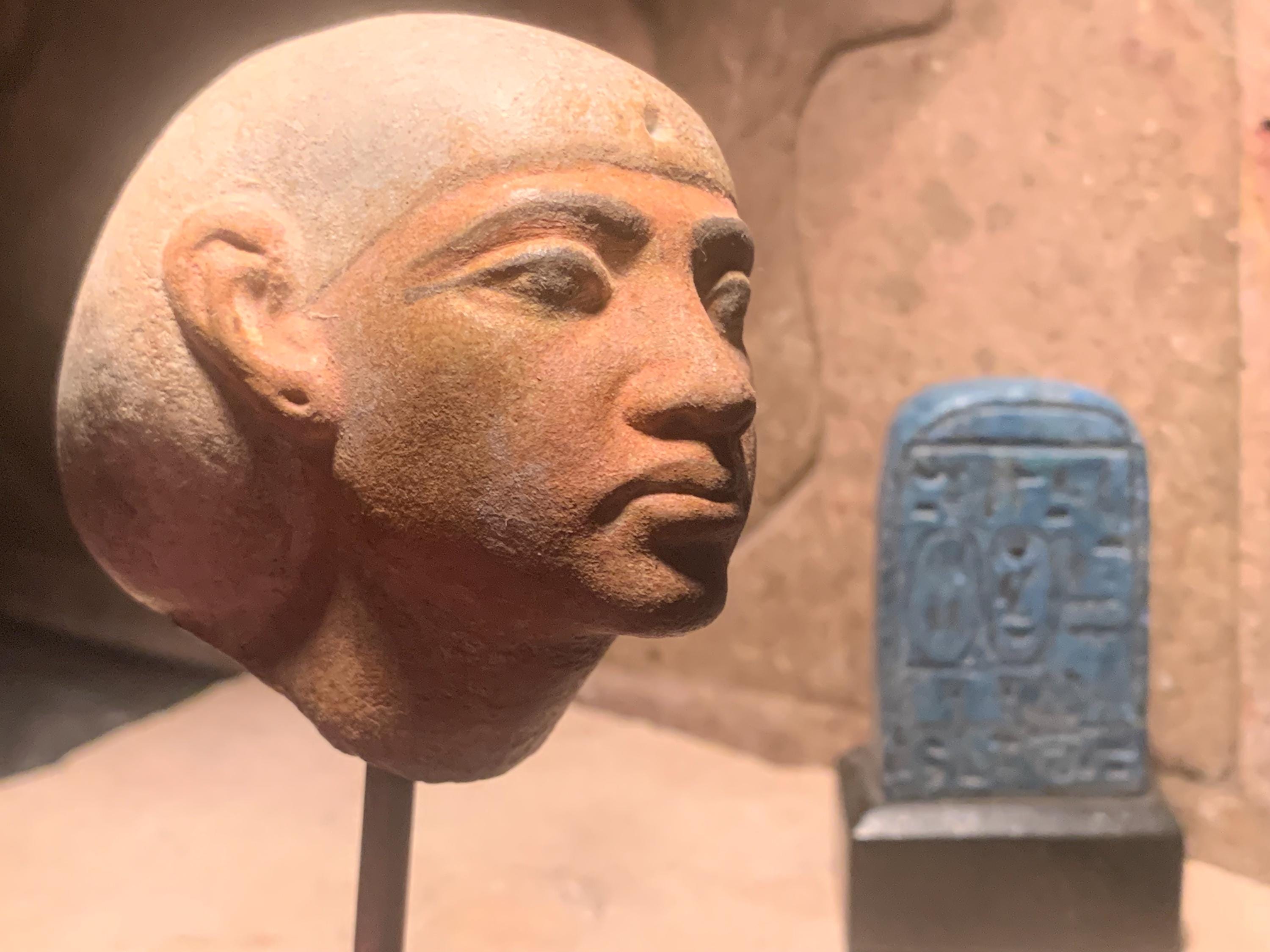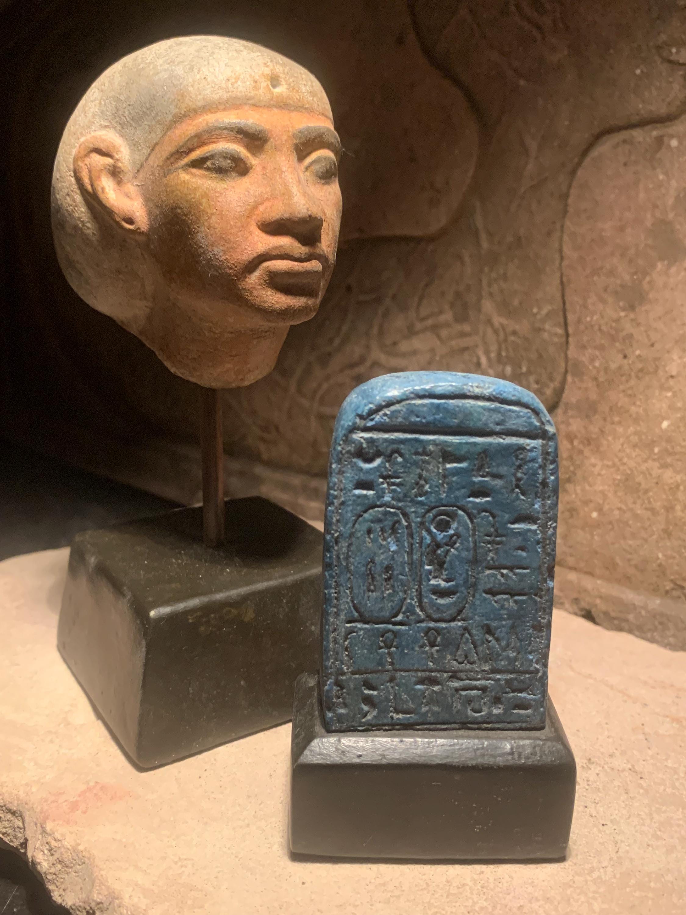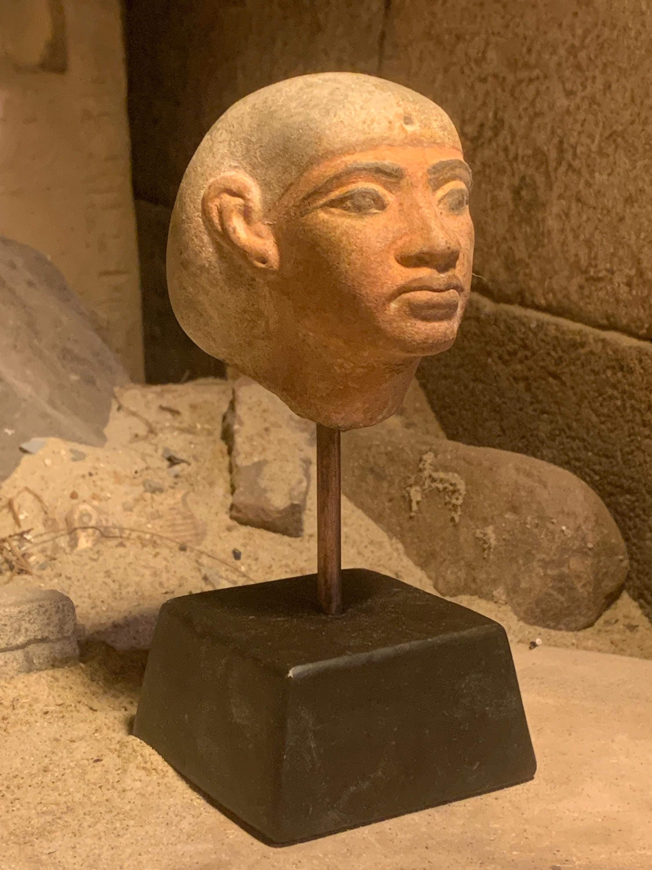 Made of a limestone and quartzite composition stone with carefully hand painted details replicating tones of the original fragment. It is mounted on a felt lined base and responds very well to overhead lighting. A simple desk lamp has been used in these photos and the contours of the face are the most striking feature of this particular representation of Queen Tiye.