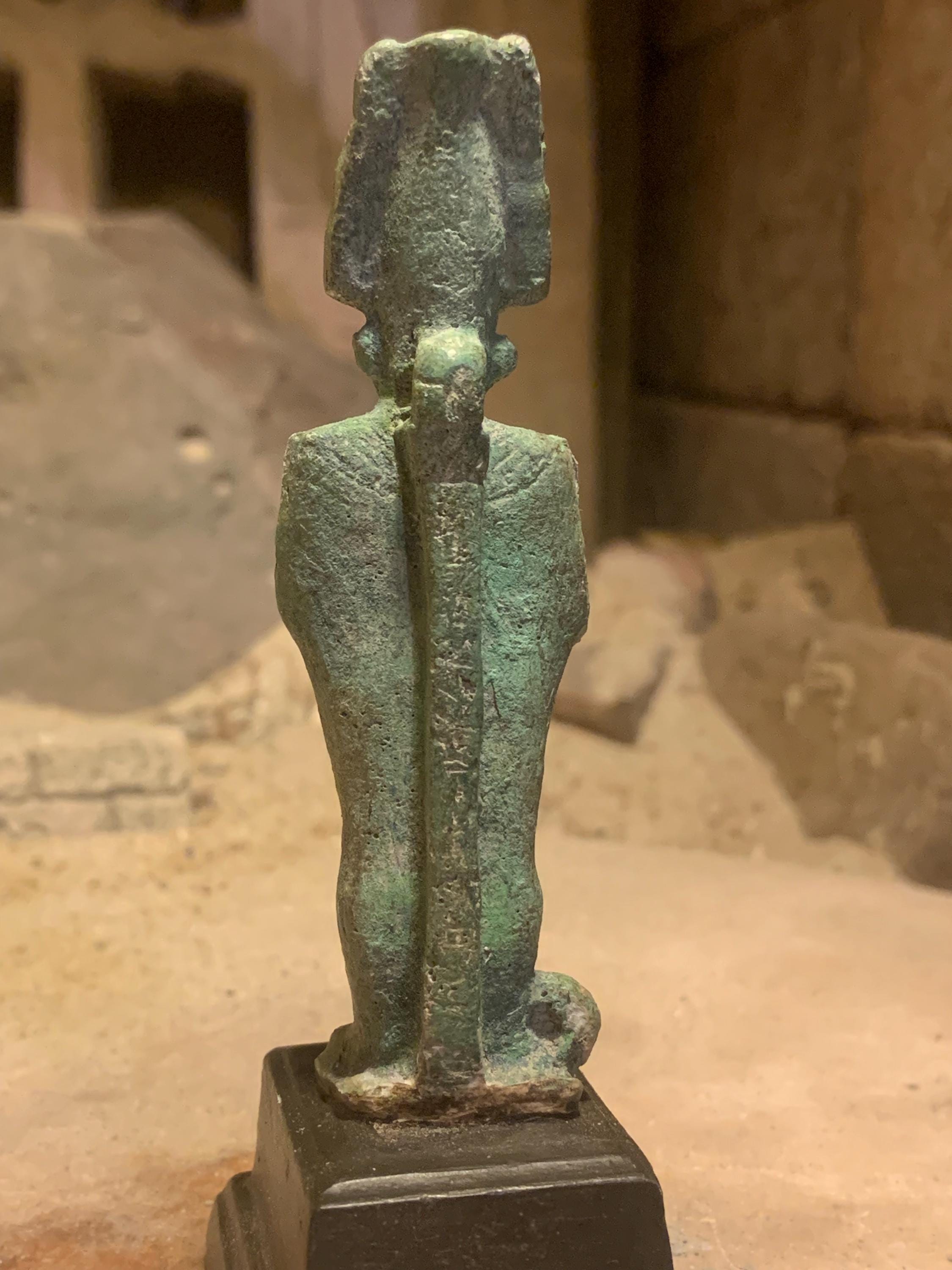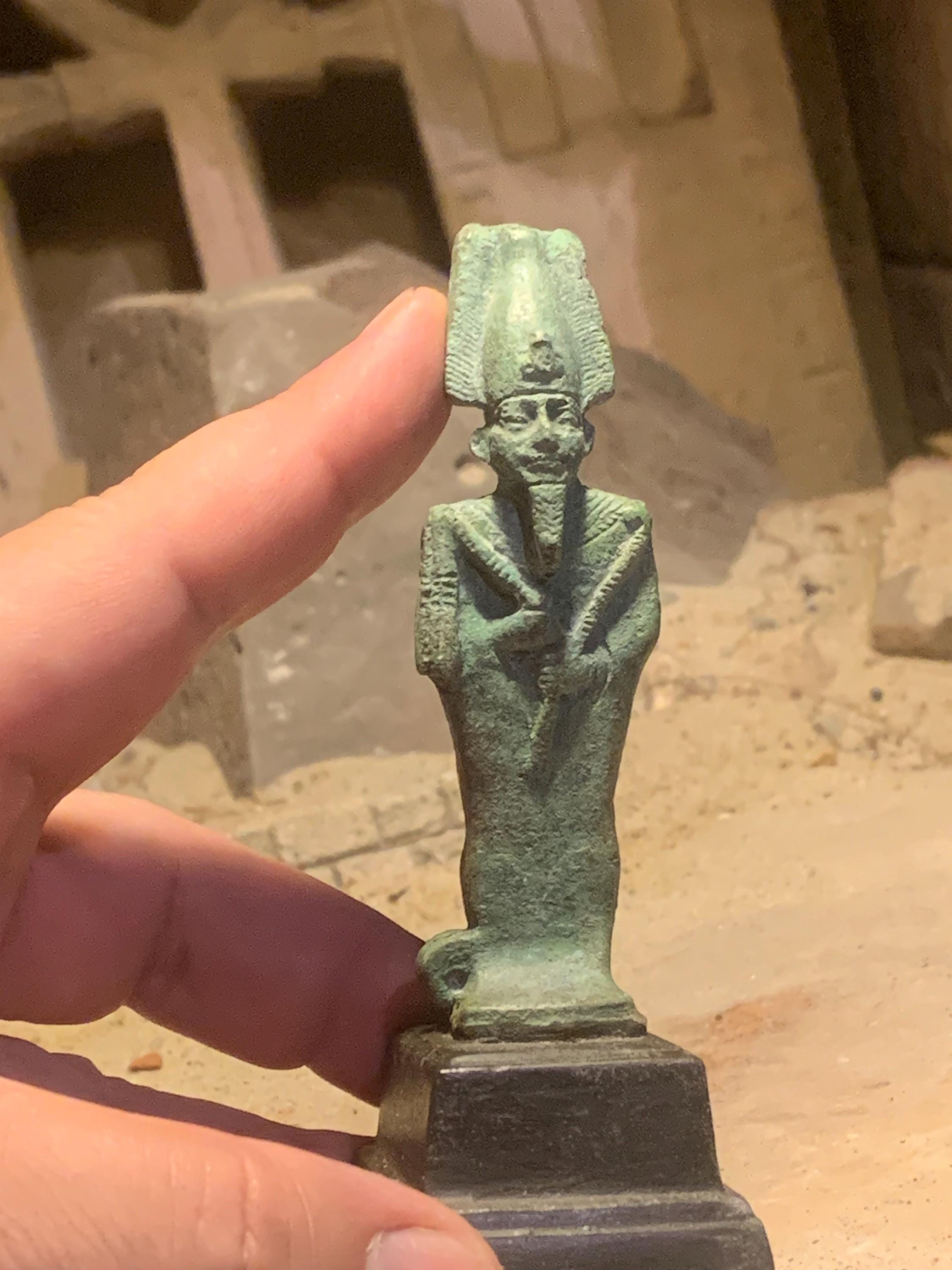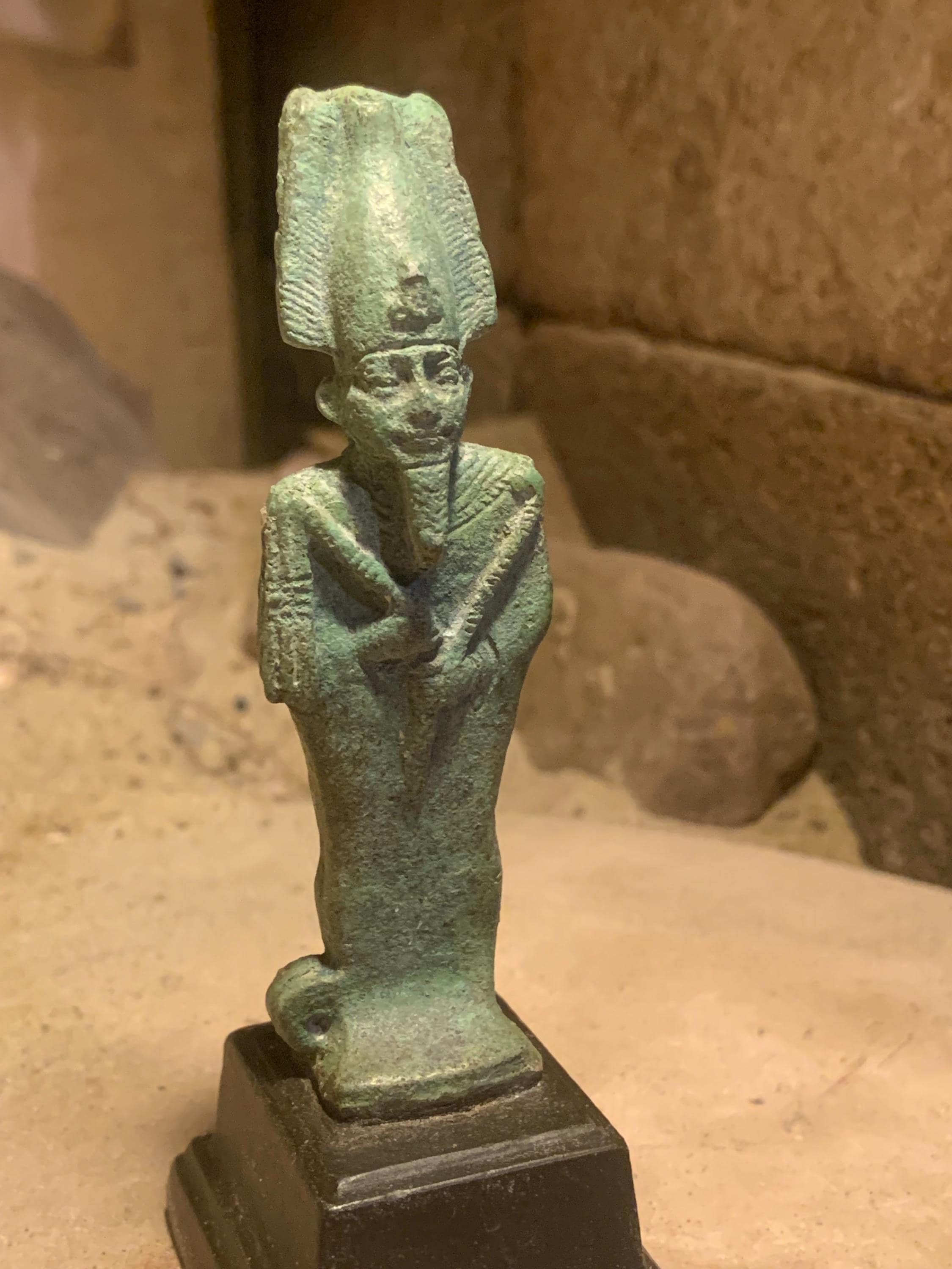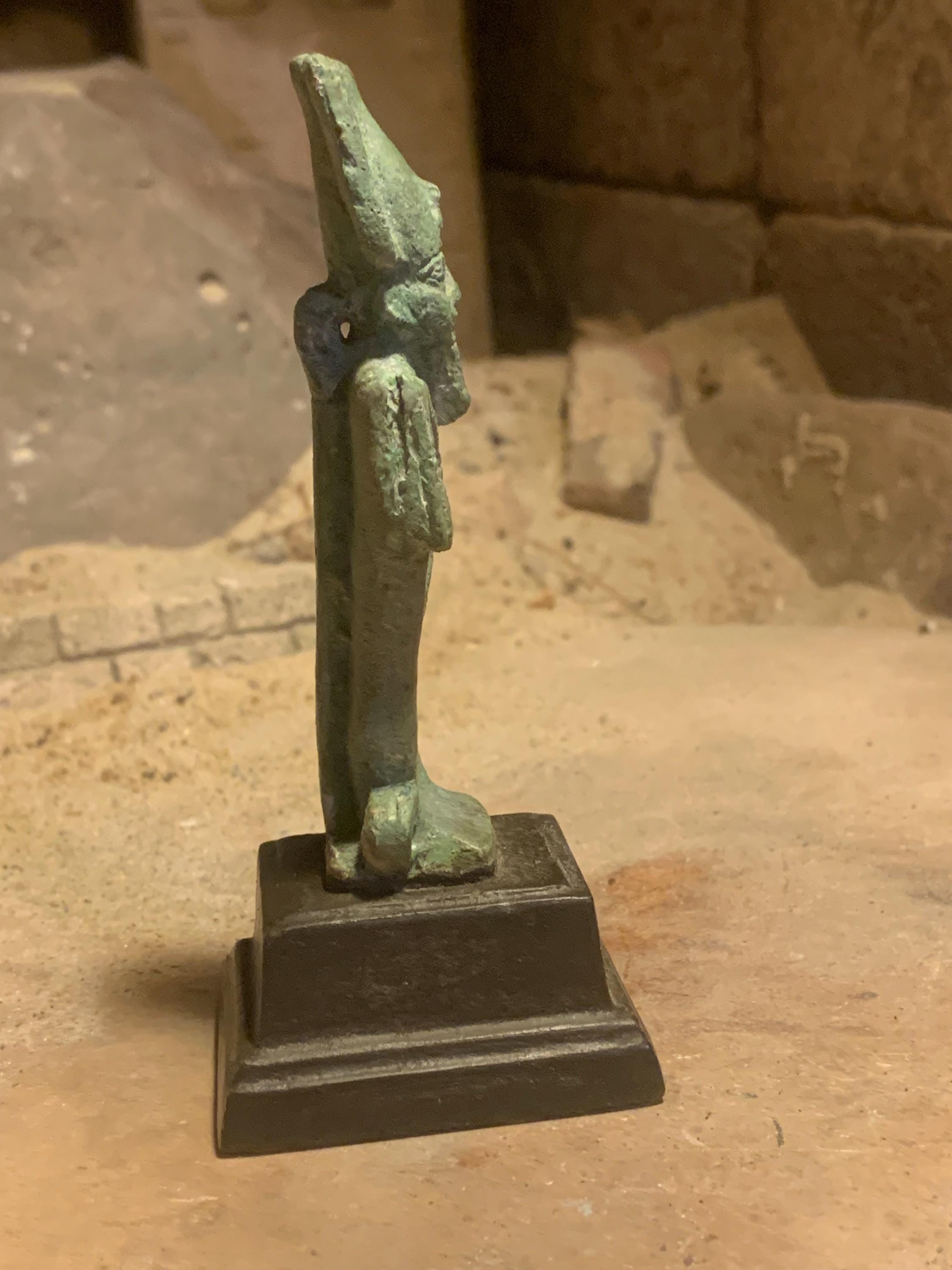 In later periods when the tomb size diminished or became just the coffin itself as part of a mass burial, small statues such as the one on offer were included in the burial to invoke the good grace of Osiris and guide the deceased into his care.
