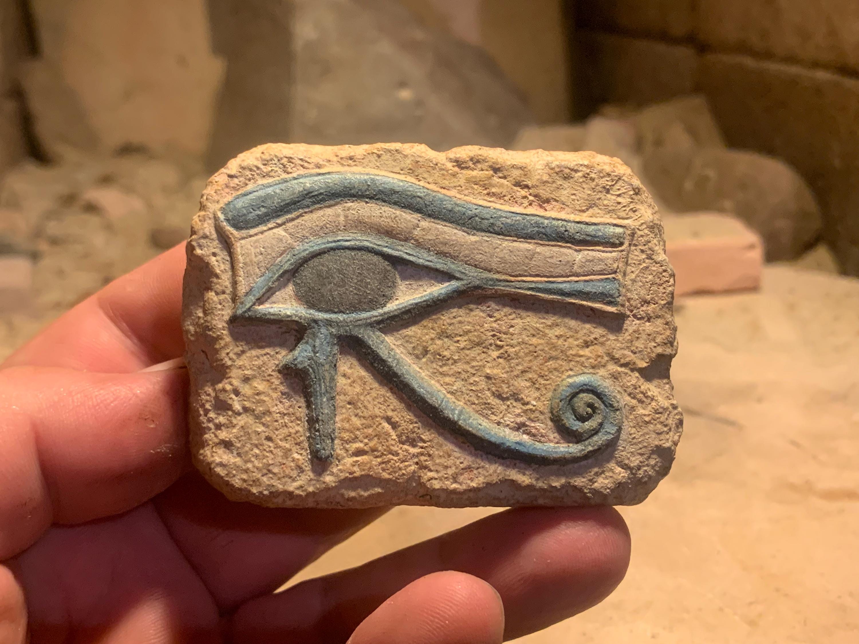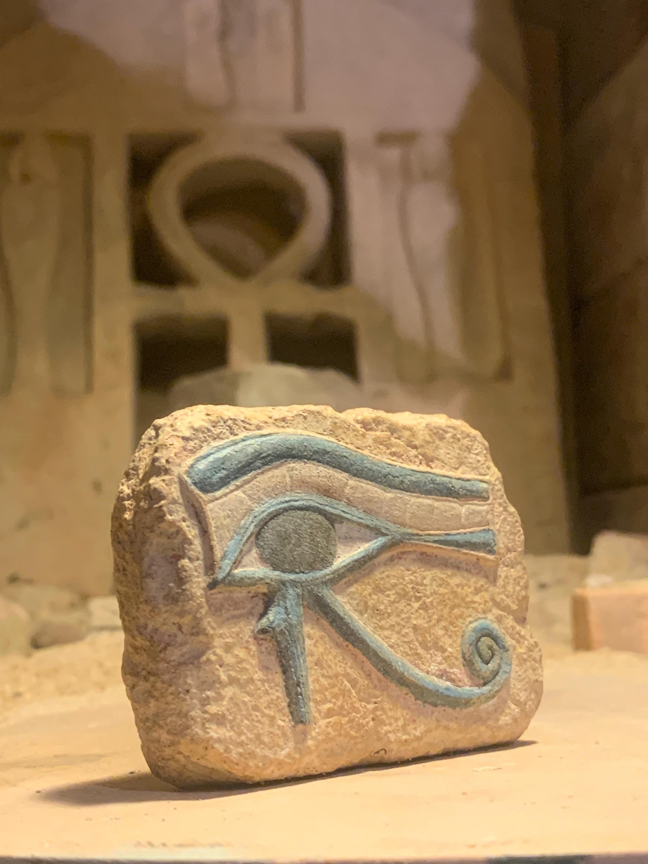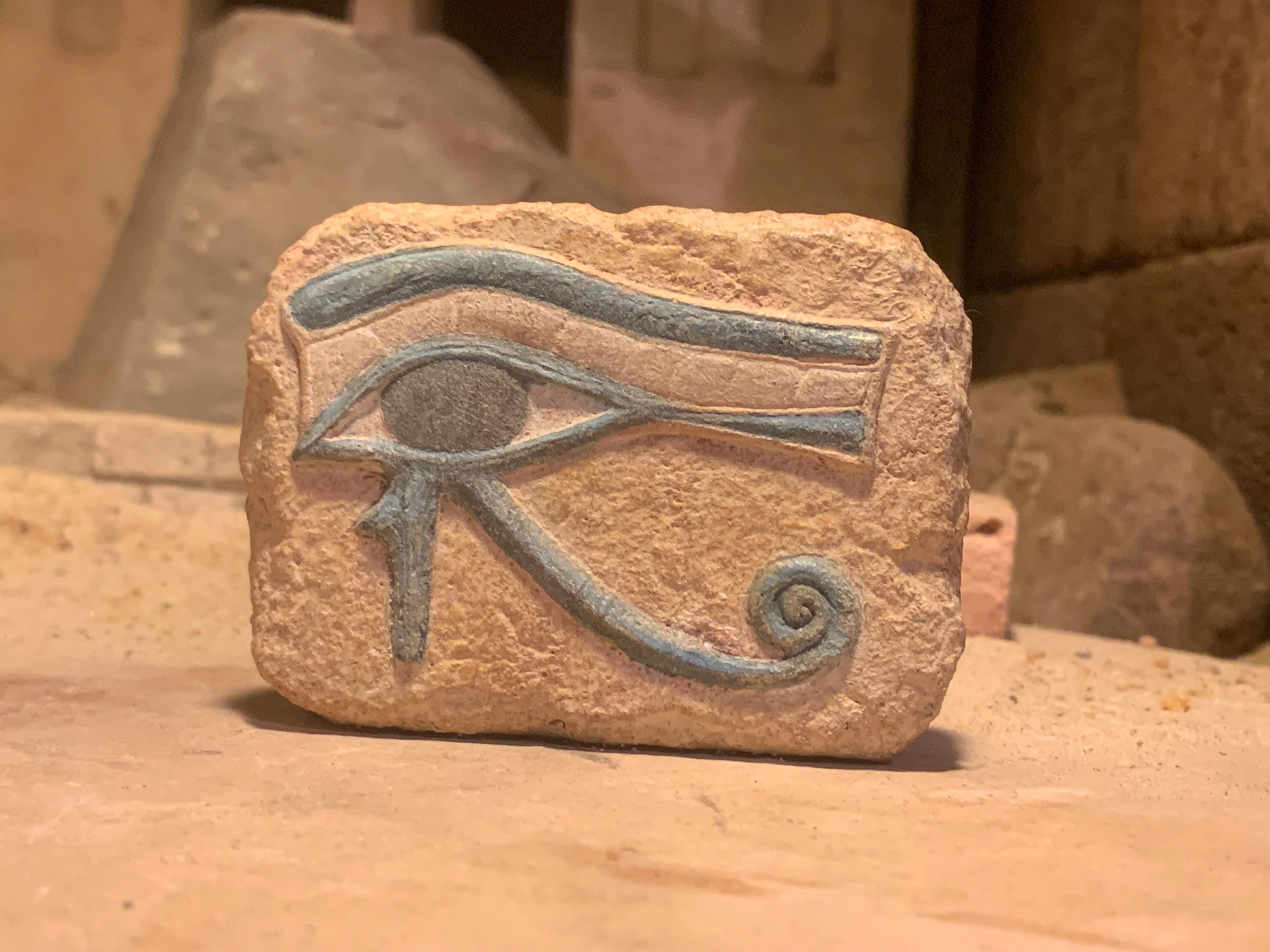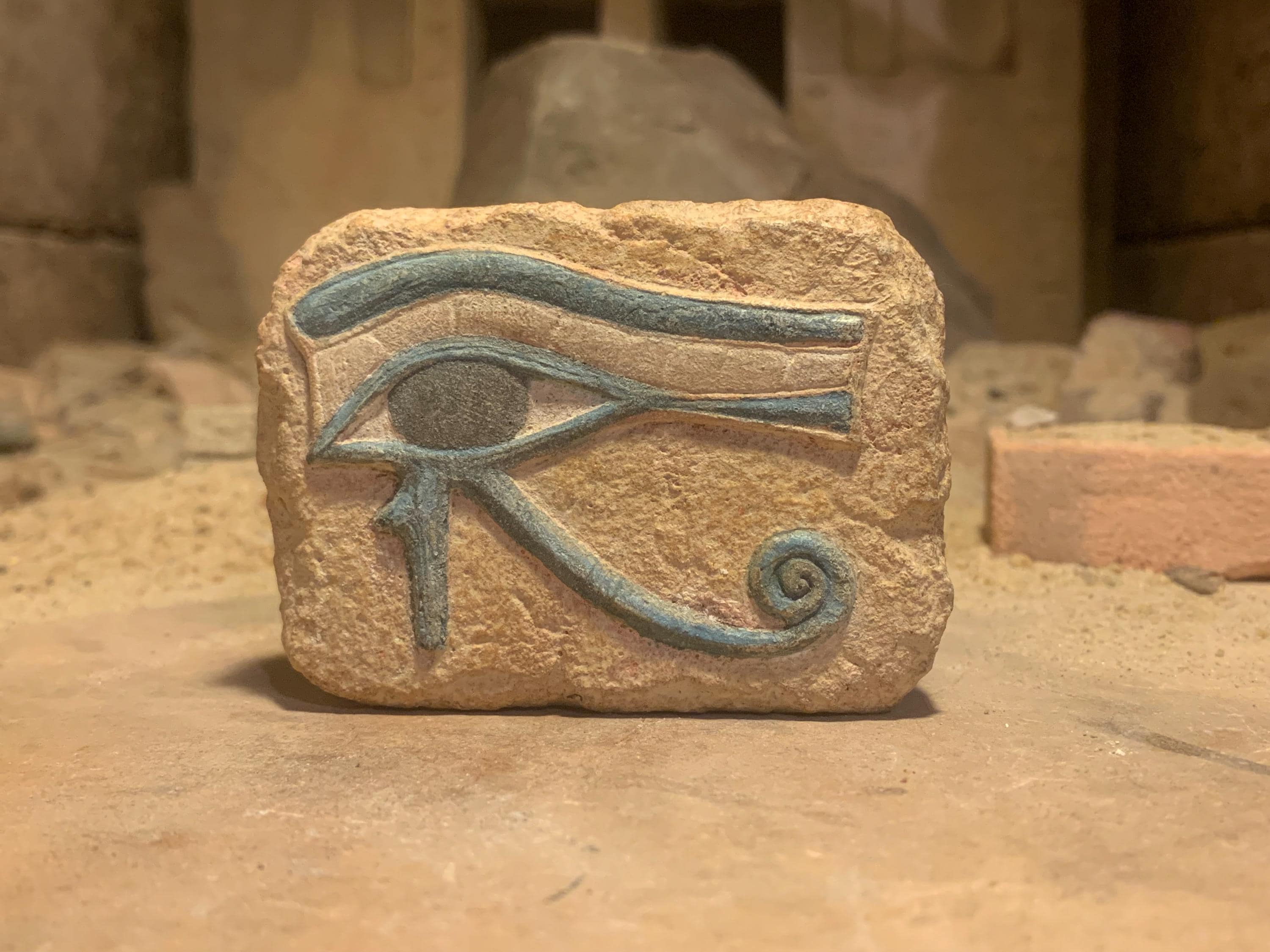 A lesser known detail of the iconic ancient Egyptian eye symbol is the direction of the curled scroll determines sun or moon. This particular example depicts the left eye of the moon. Either way they are both protection symbols. During the middle kingdom, eyes were carved or painted on the side of rectangular coffin designs. This was to allow the deceased to 'see out' as many intact burials from this period were found to show the individual mummy laying on its side.