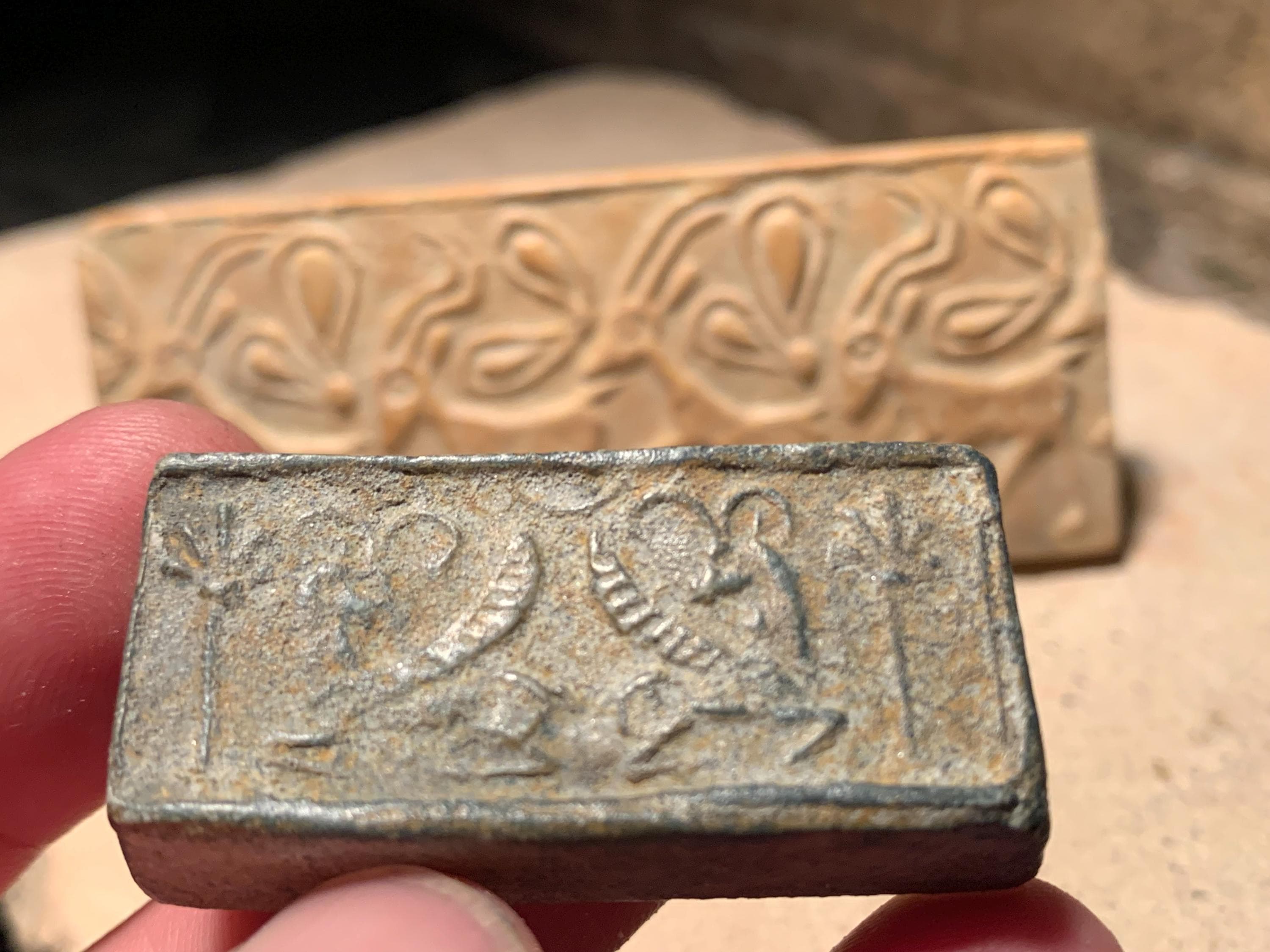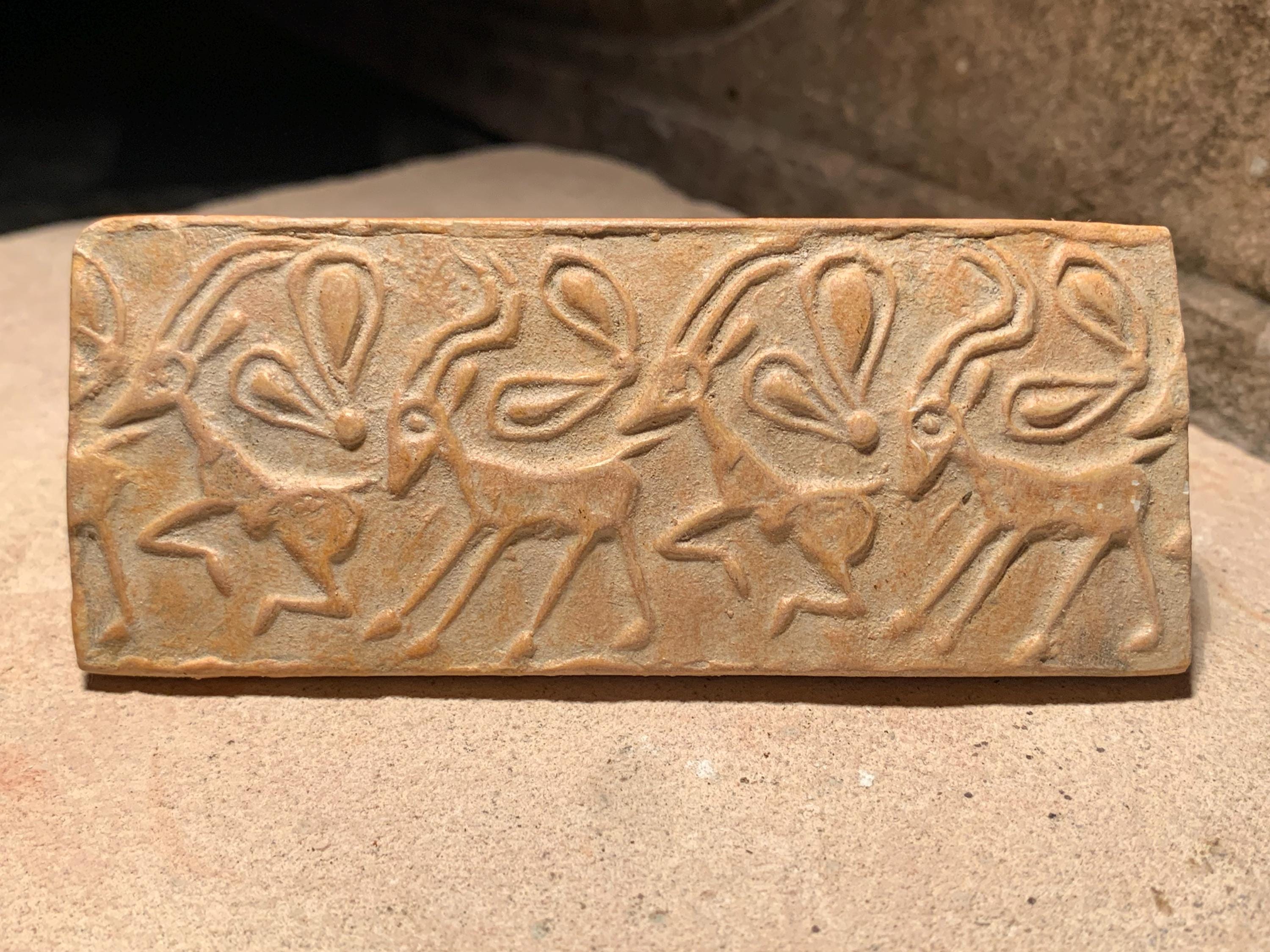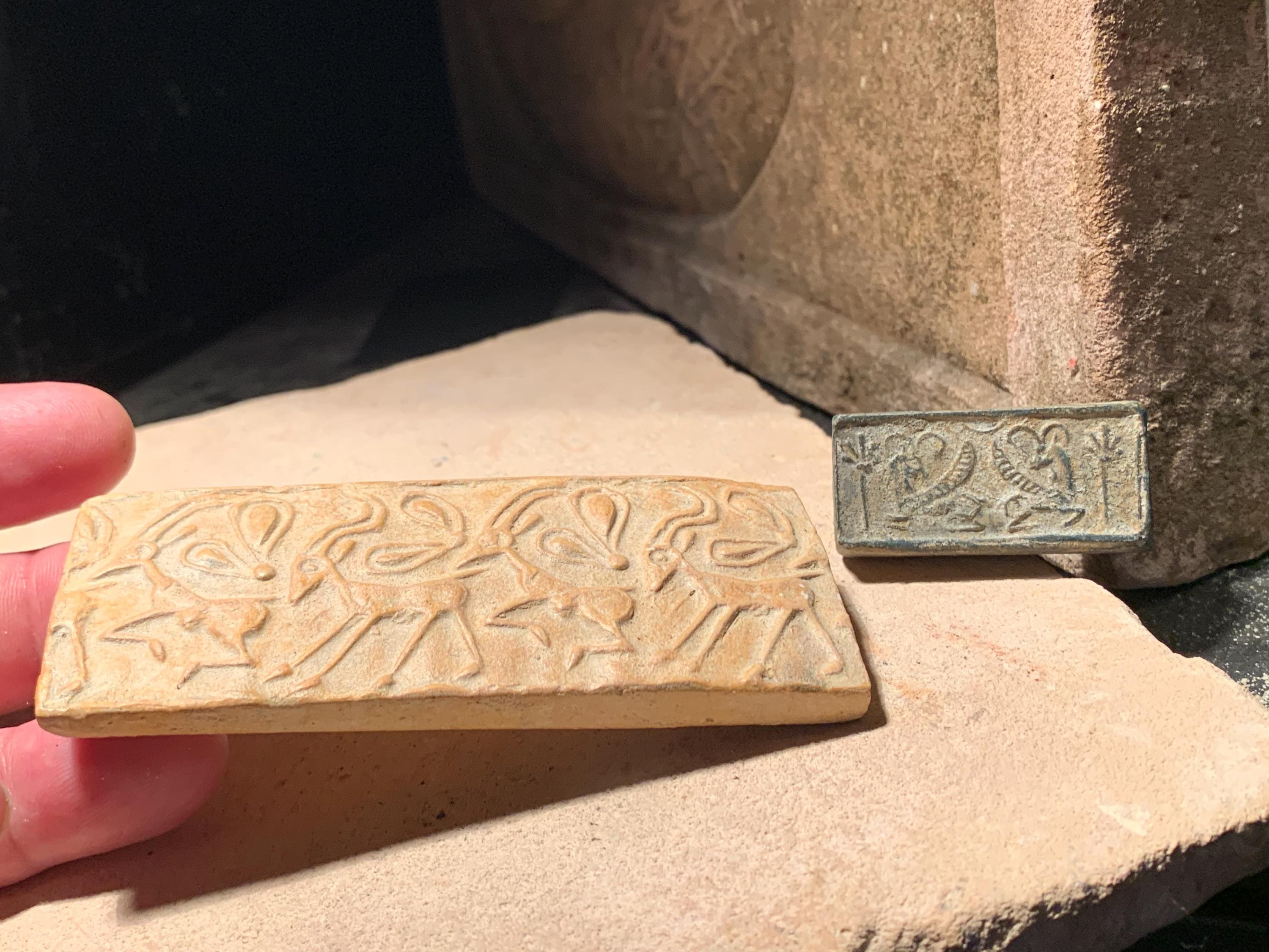These seal impressions are replicas of well preserved excavated examples. The larger of the two features a bold linear pattern that is clear and vibrant.