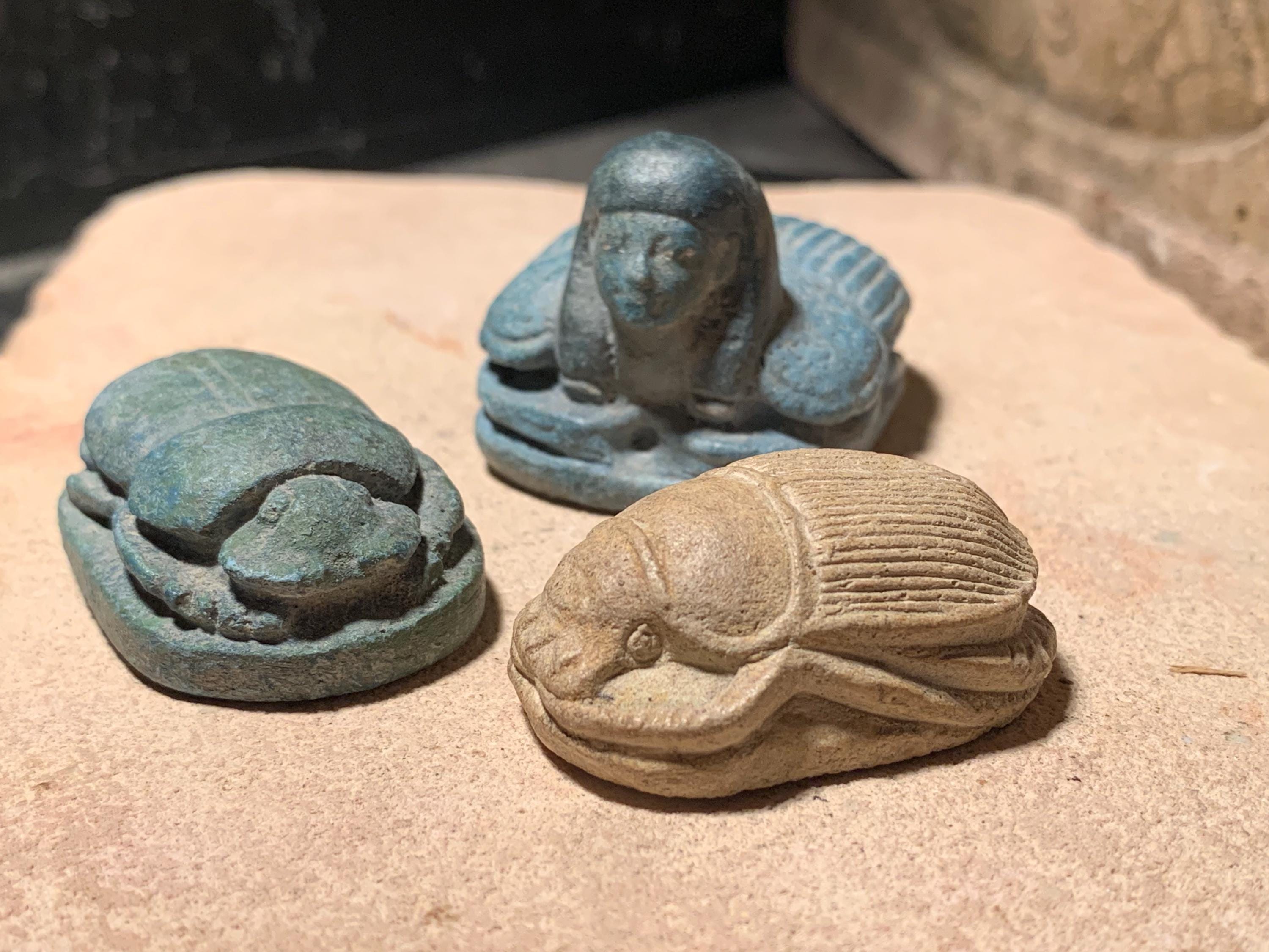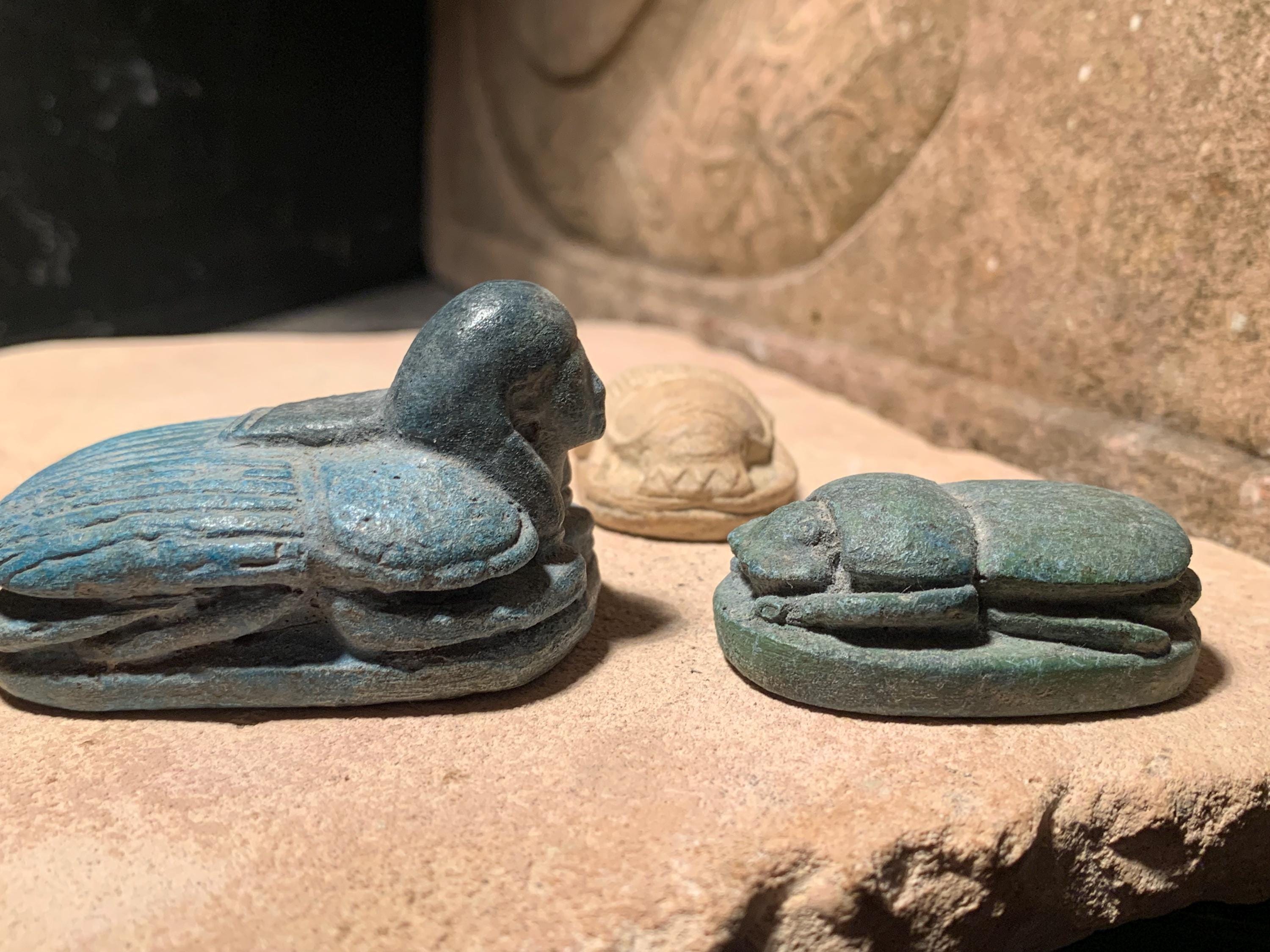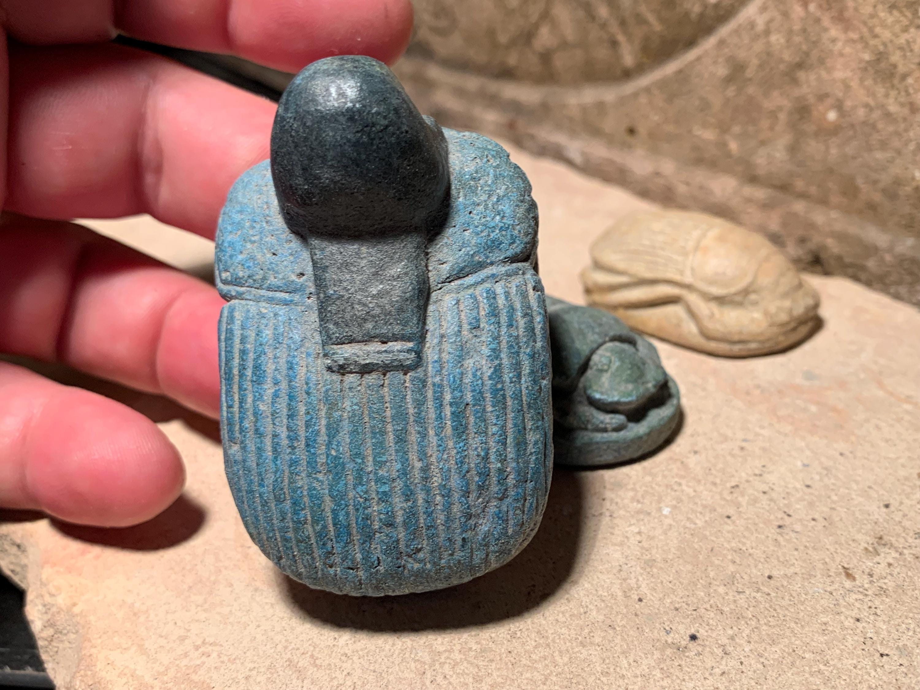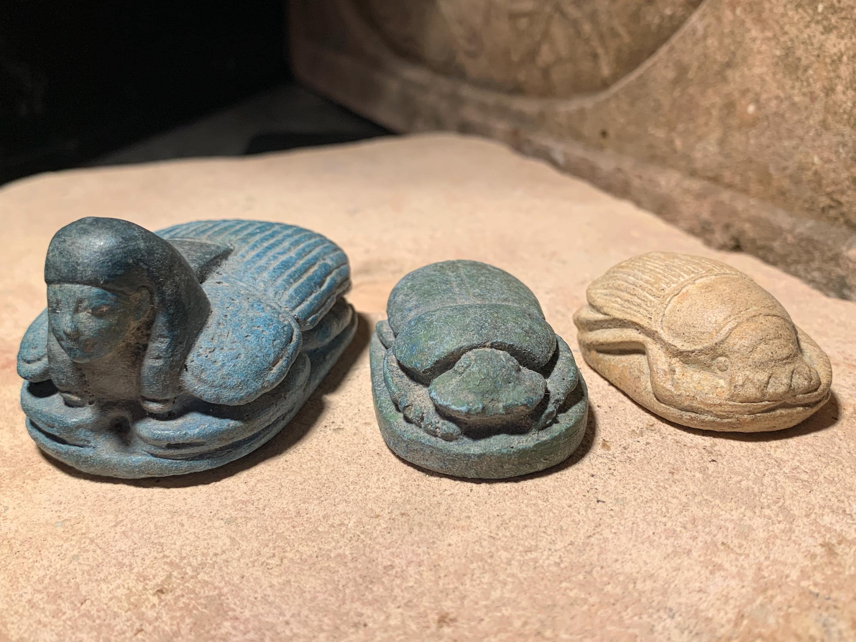 The largest in this set is one of the rarest forms of scarab and includes a human head placed where the scarab head usually is. Representing the ancient owner it seamlessly blends in with the thorax and main body. It is a more personalised way to ensure the ancient soul is reborn in the afterlife. Stylistically this example appears to be late 18th to early 19th dynasty.