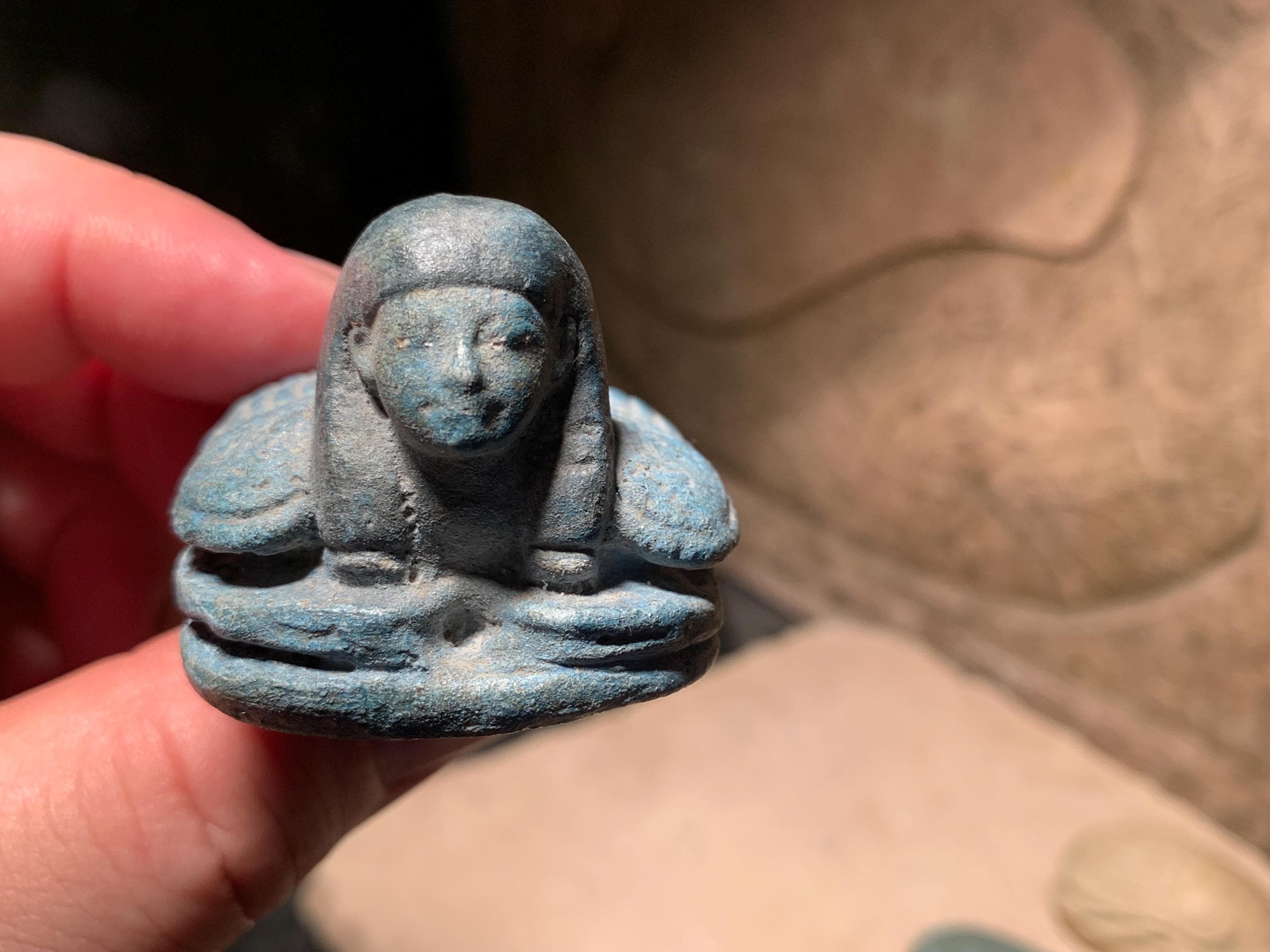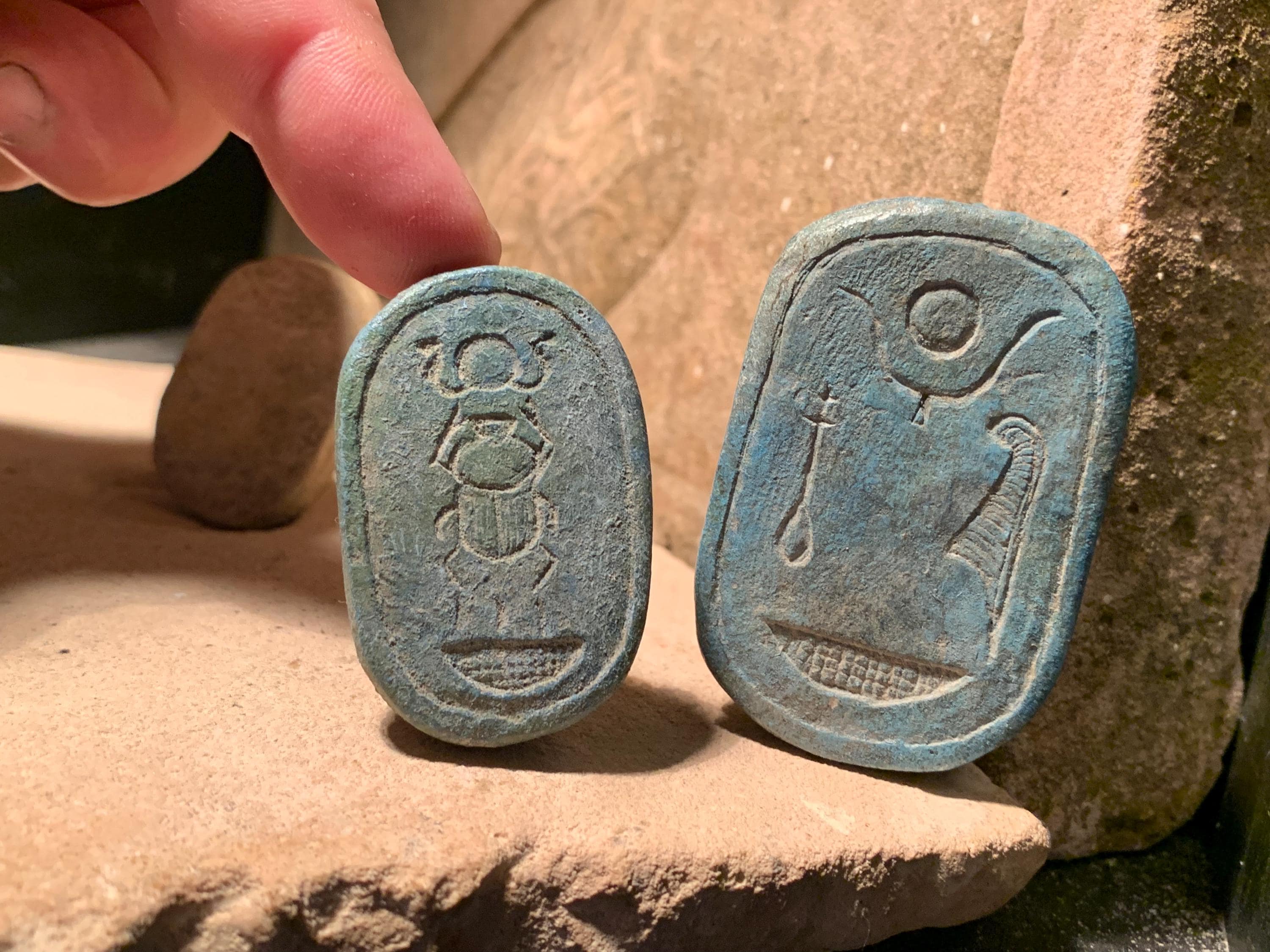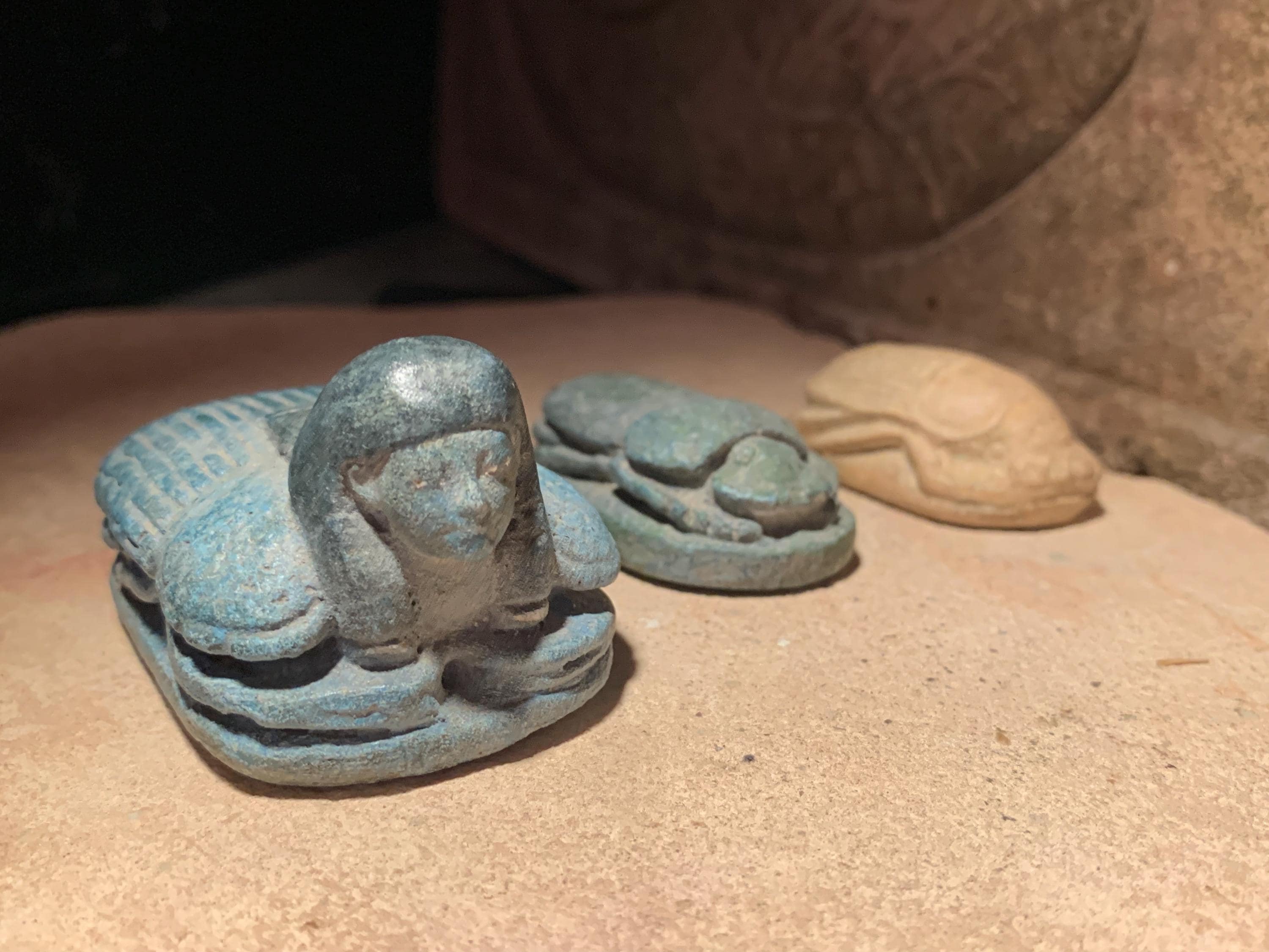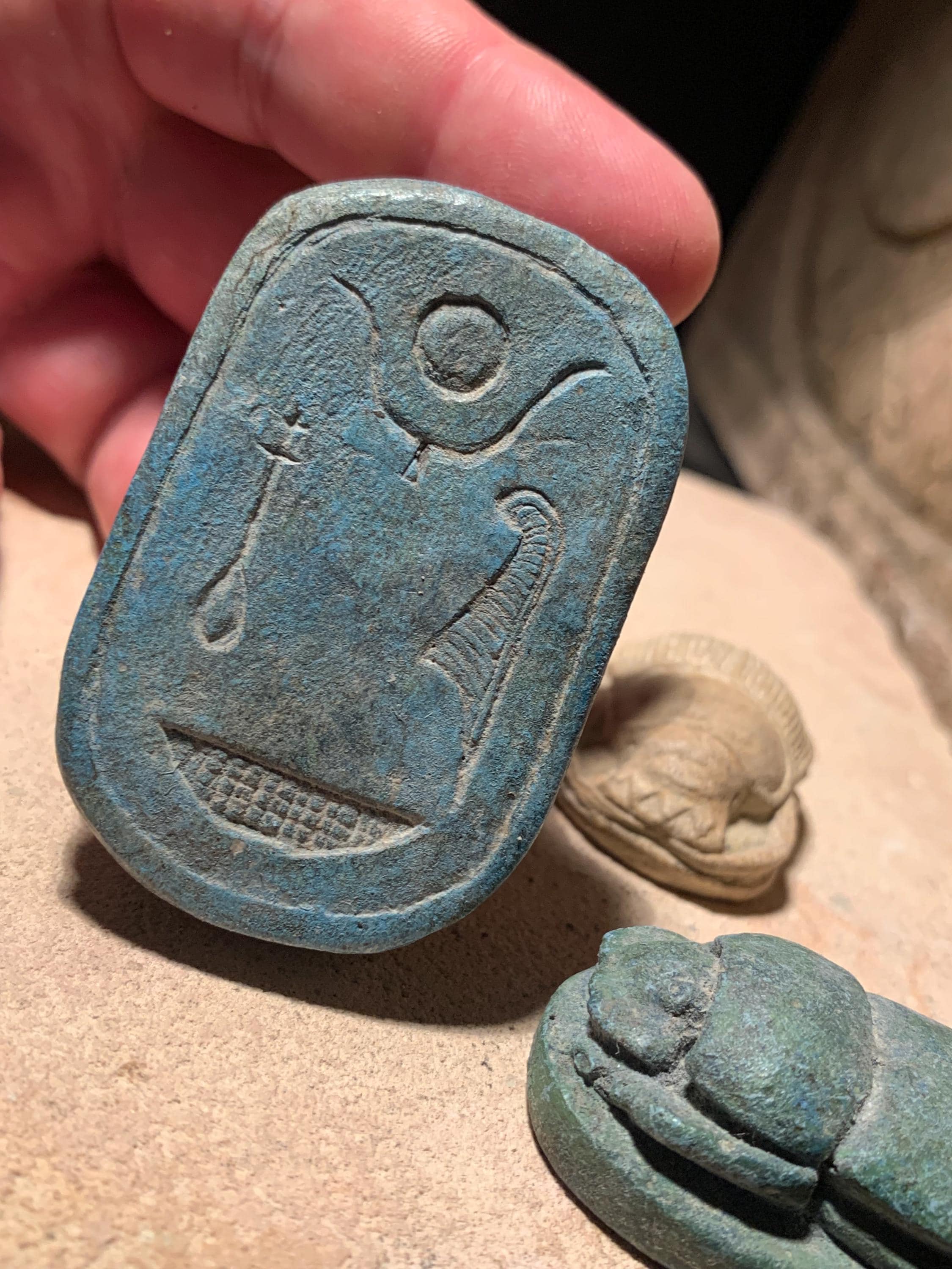 The largest in this set is one of the rarest forms of scarab and includes a human head placed where the scarab head usually is. Representing the ancient owner it seamlessly blends in with the thorax and main body. It is a more personalised way to ensure the ancient soul is reborn in the afterlife. Stylistically this example appears to be late 18th to early 19th dynasty.