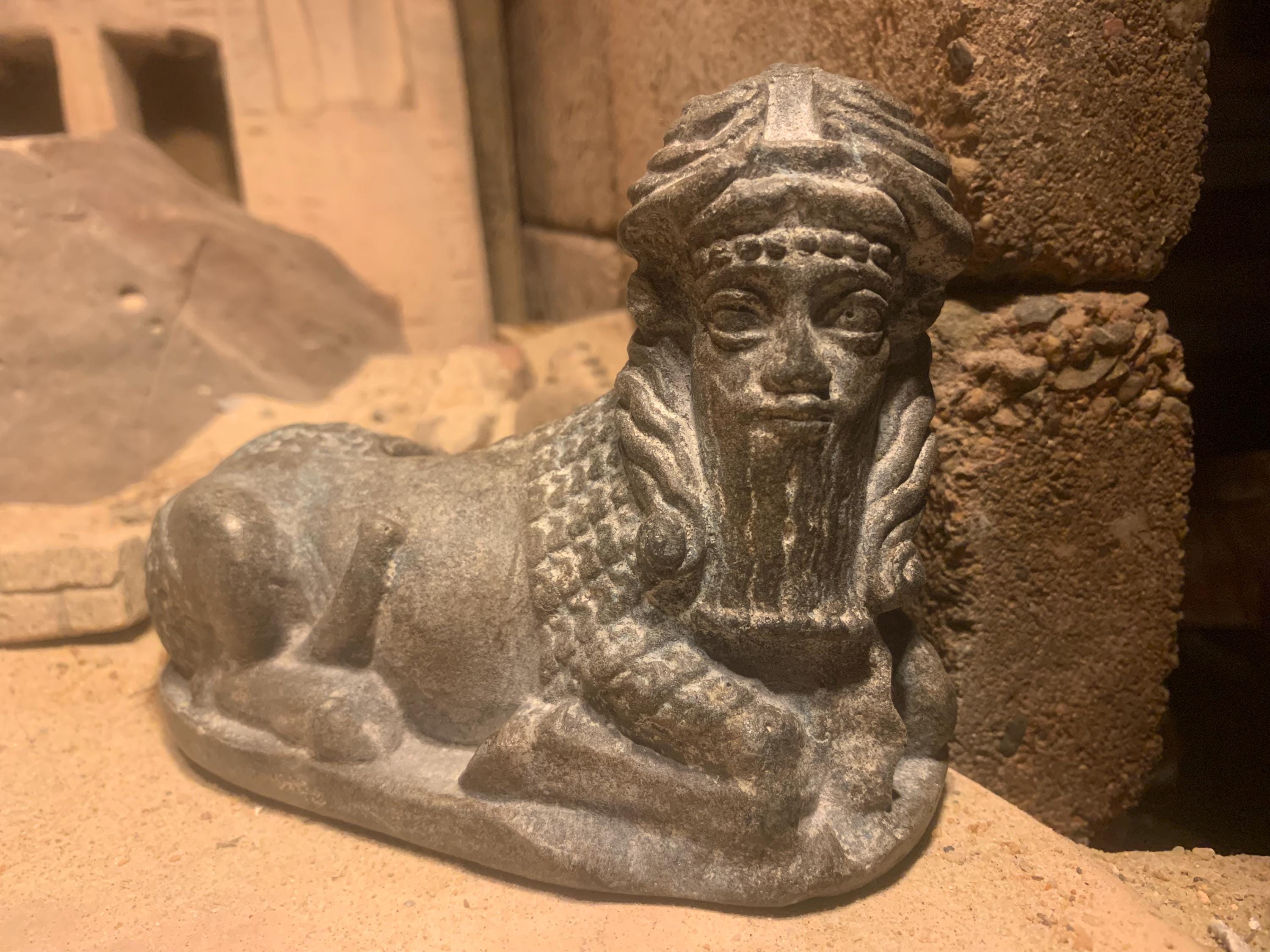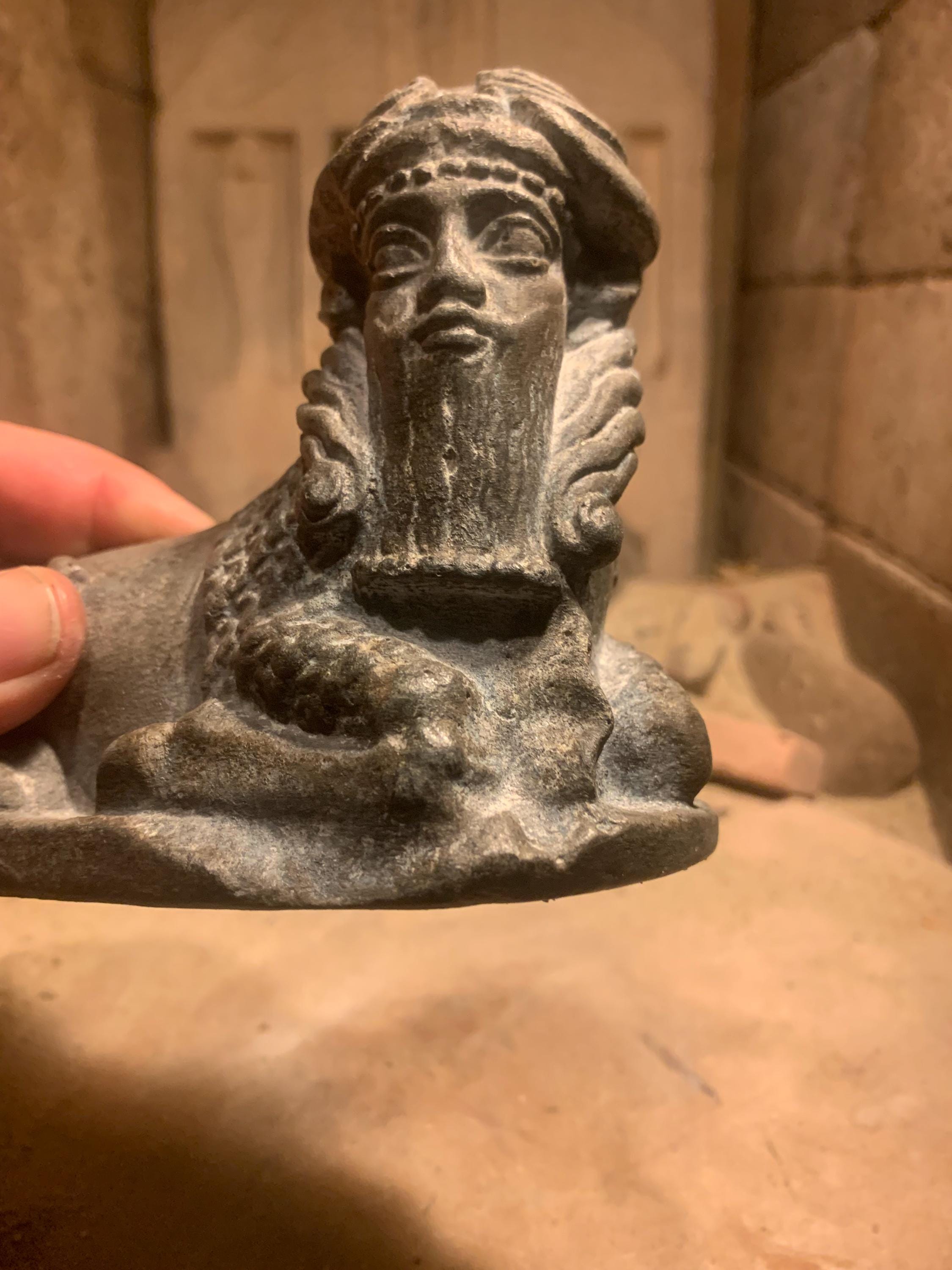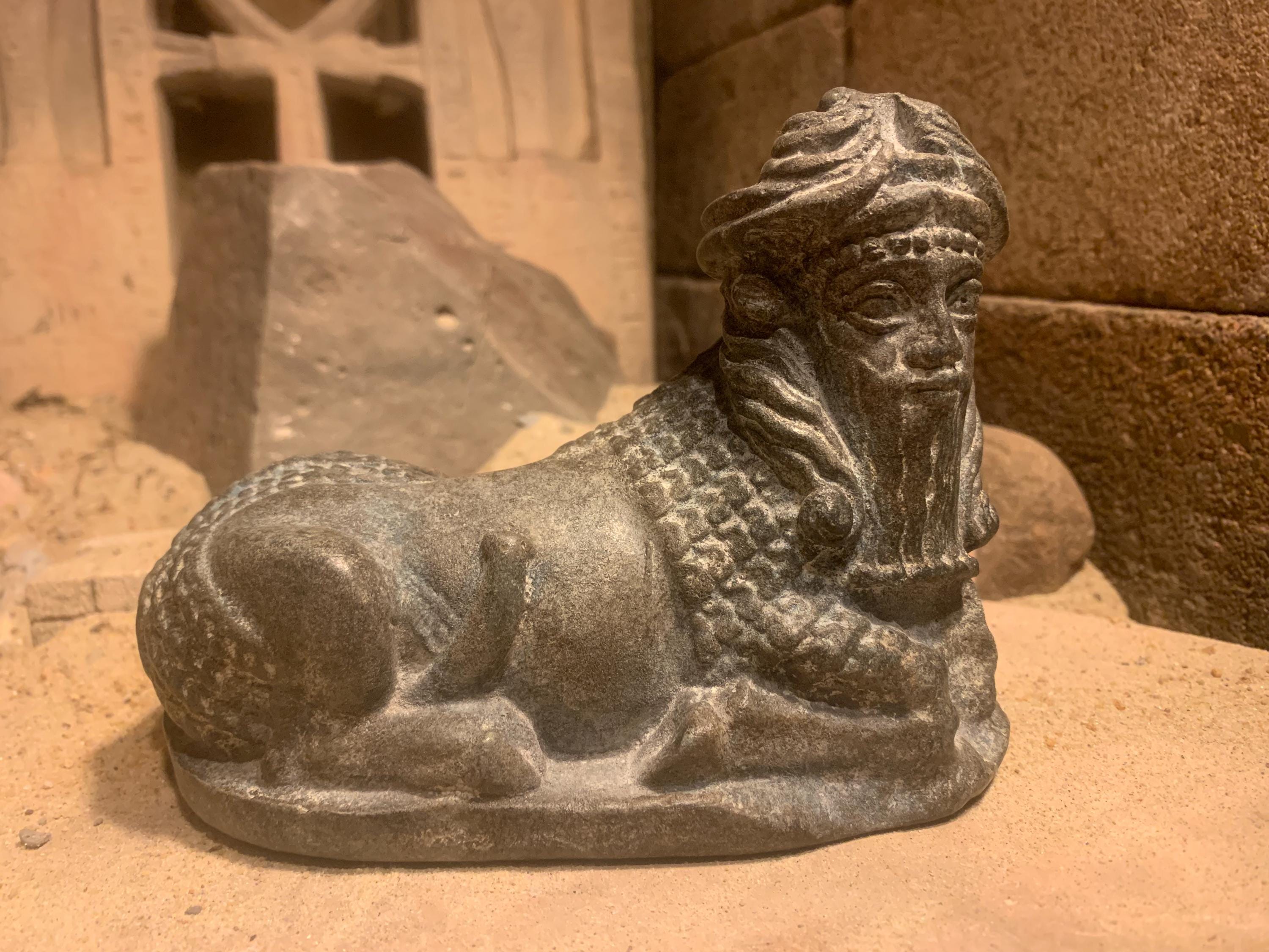 Most likely from ancient Telloh the statue depicts an image of a human headed bull, a motif found throughout Mesopotamian history in a variety of forms and poses. The bull man statues were associated with the sun god and had restorative and protective qualities.