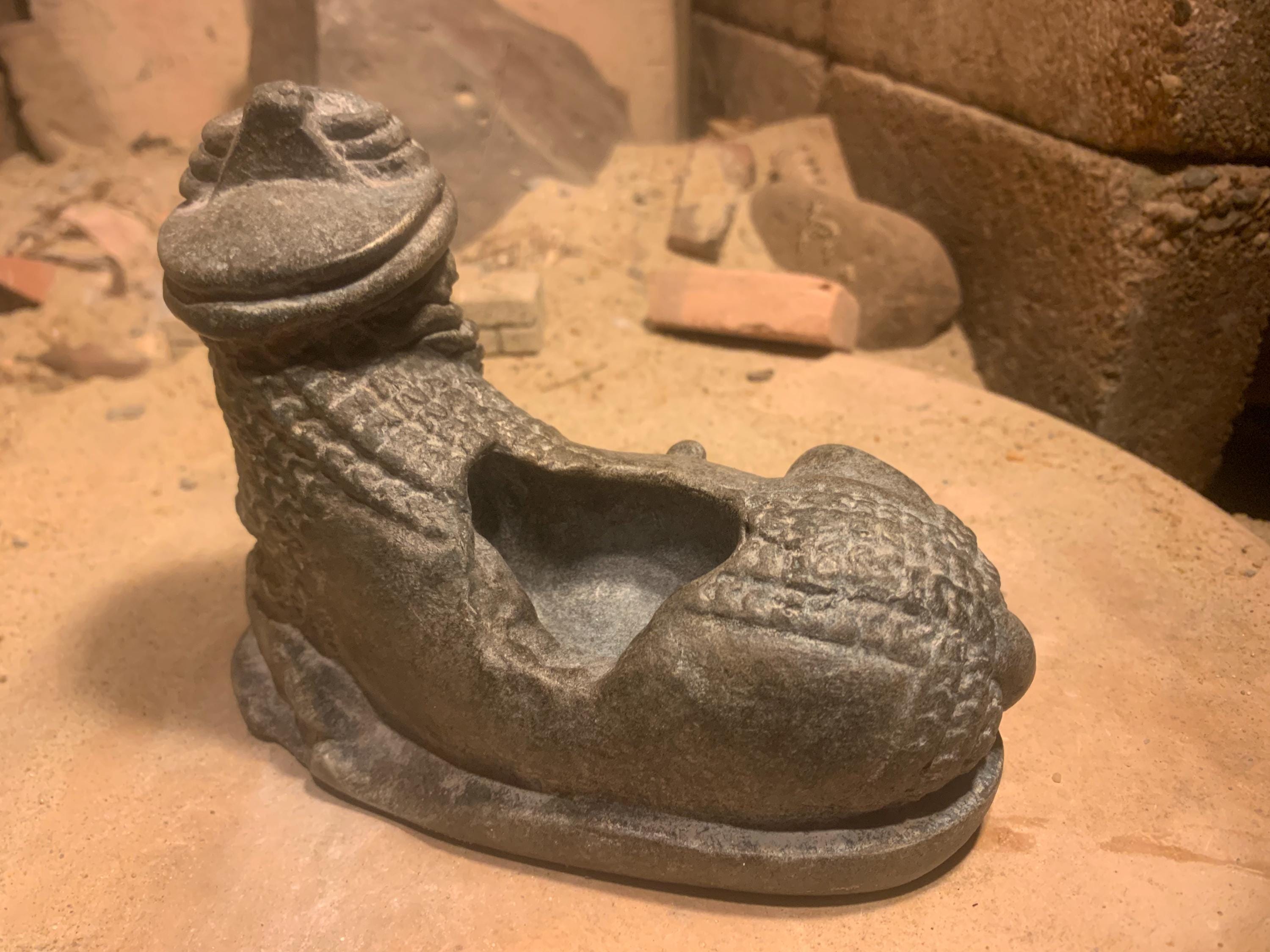 Made of a limestone and quartzite composition stone this piece has an aged slate black patina.