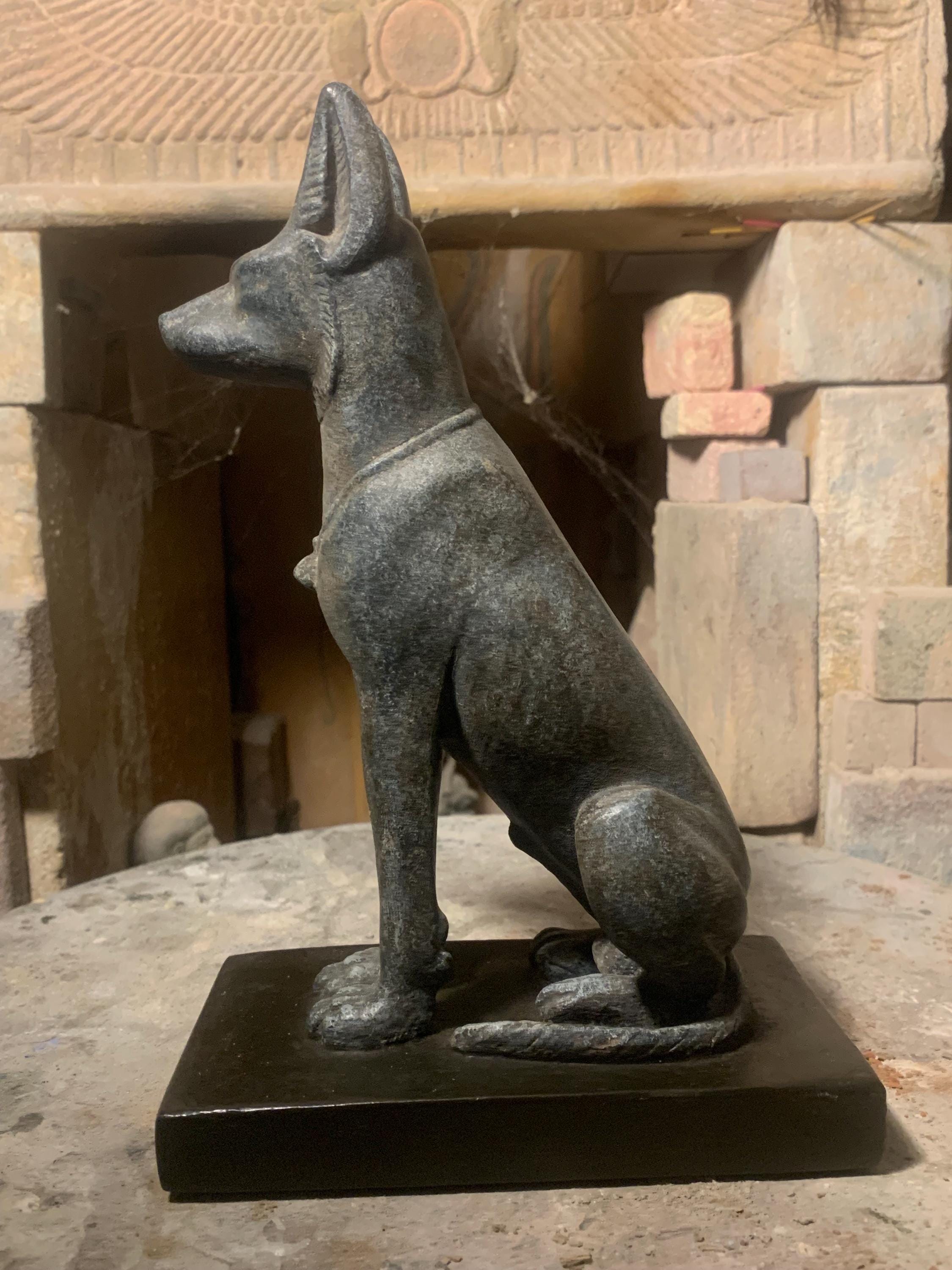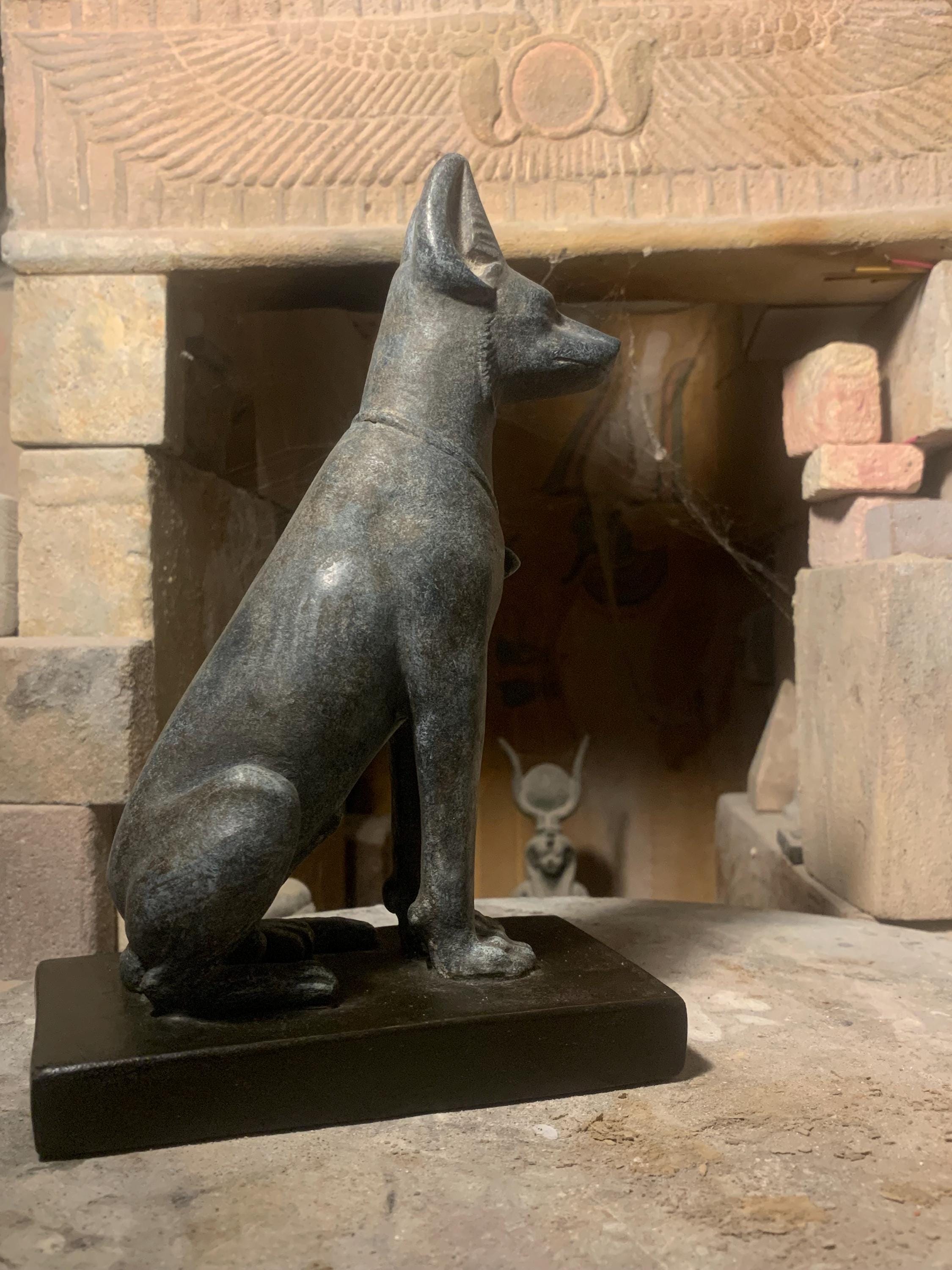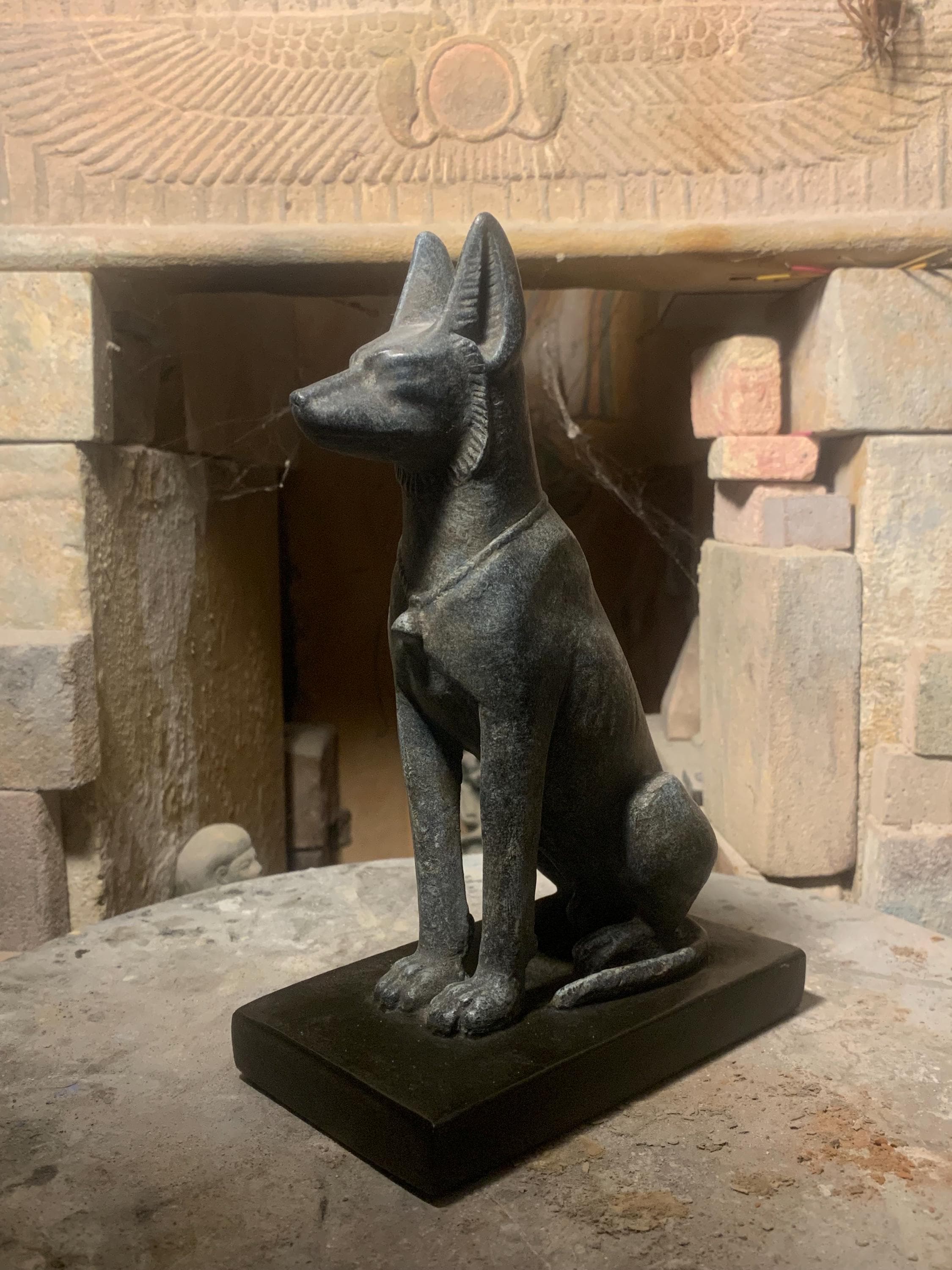This statue features the well known god Anubis or 'Anpu' in ancient Egyptian dialect. Variously identified as a Jackal or north African wolf, the modern day descendant takes form in the Pharaoh hound or Basenji.