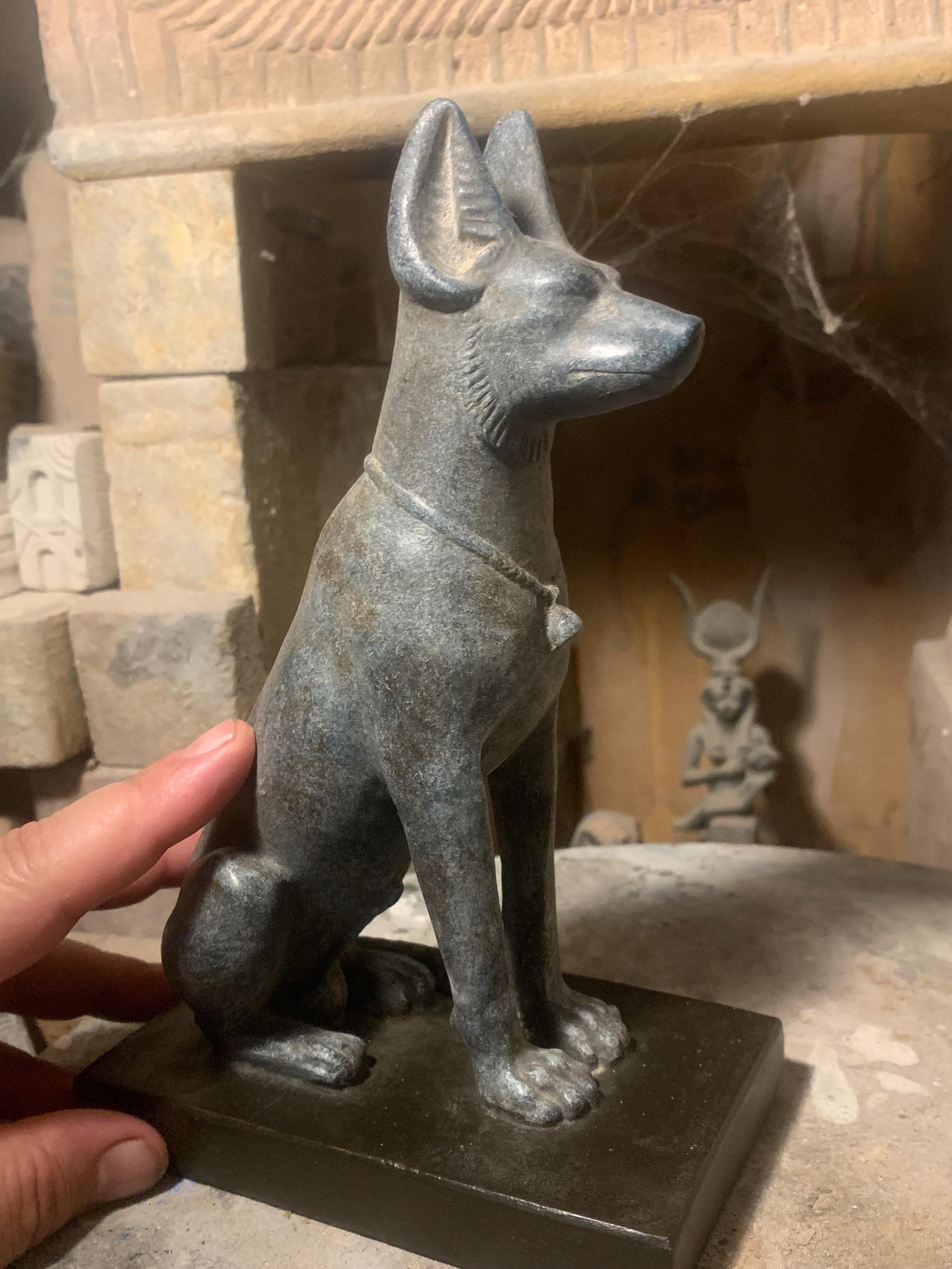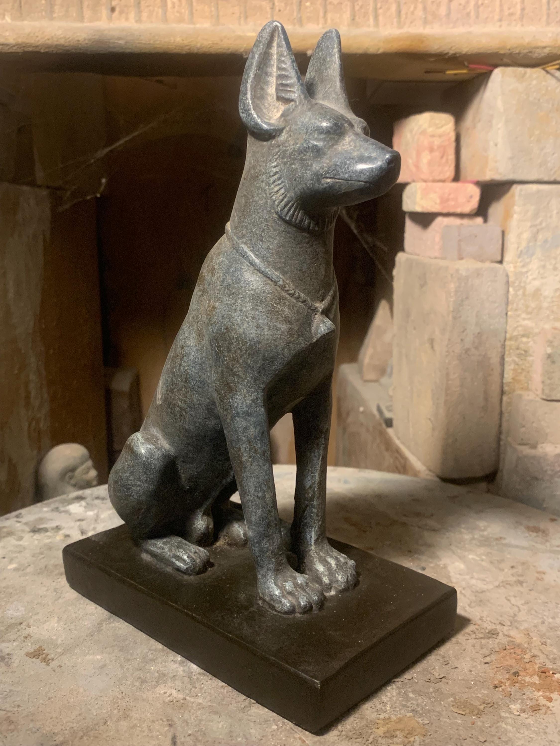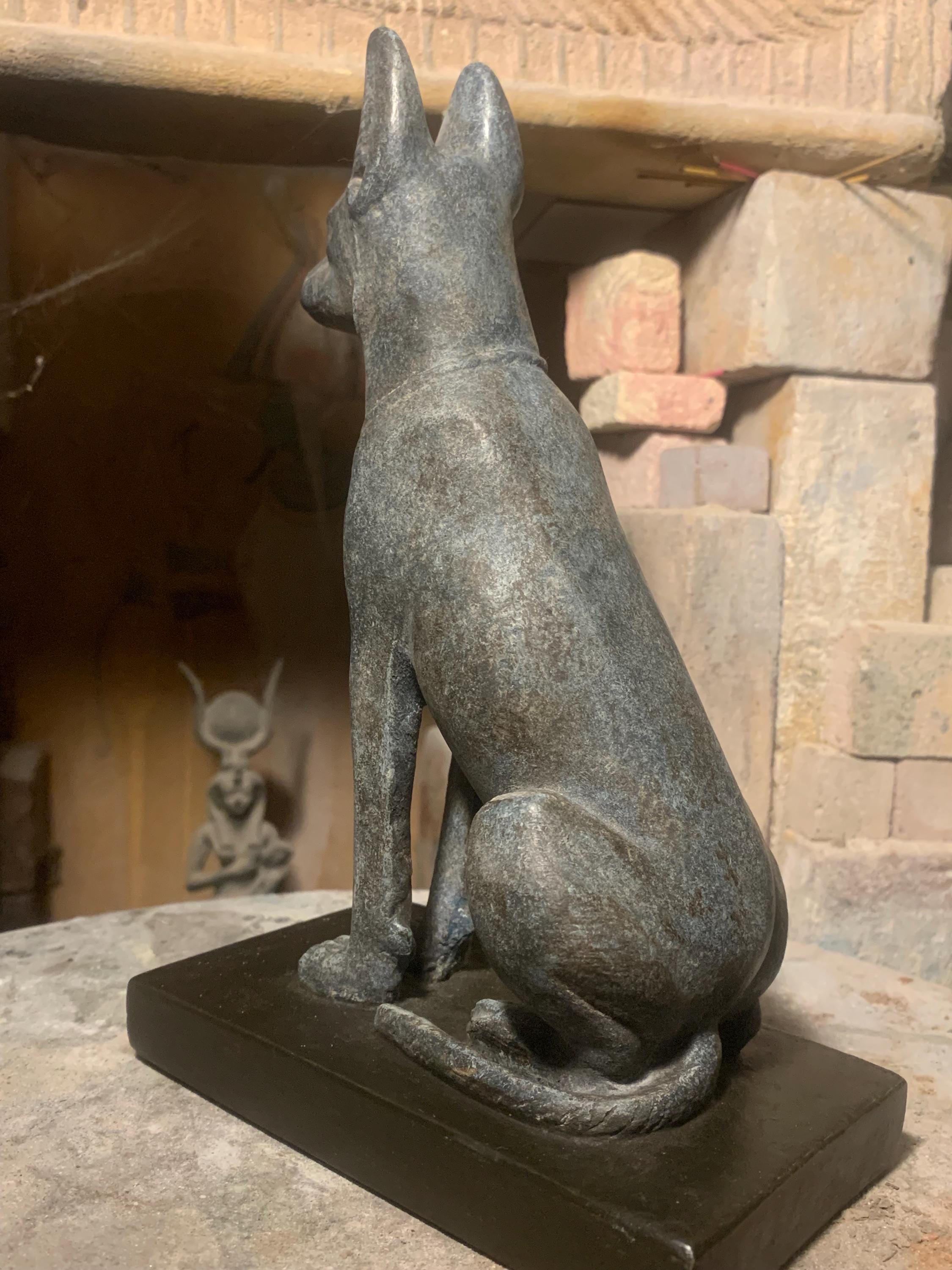 This statue features the well known god Anubis or 'Anpu' in ancient Egyptian dialect. Variously identified as a Jackal or north African wolf, the modern day descendant takes form in the Pharaoh hound or Basenji.