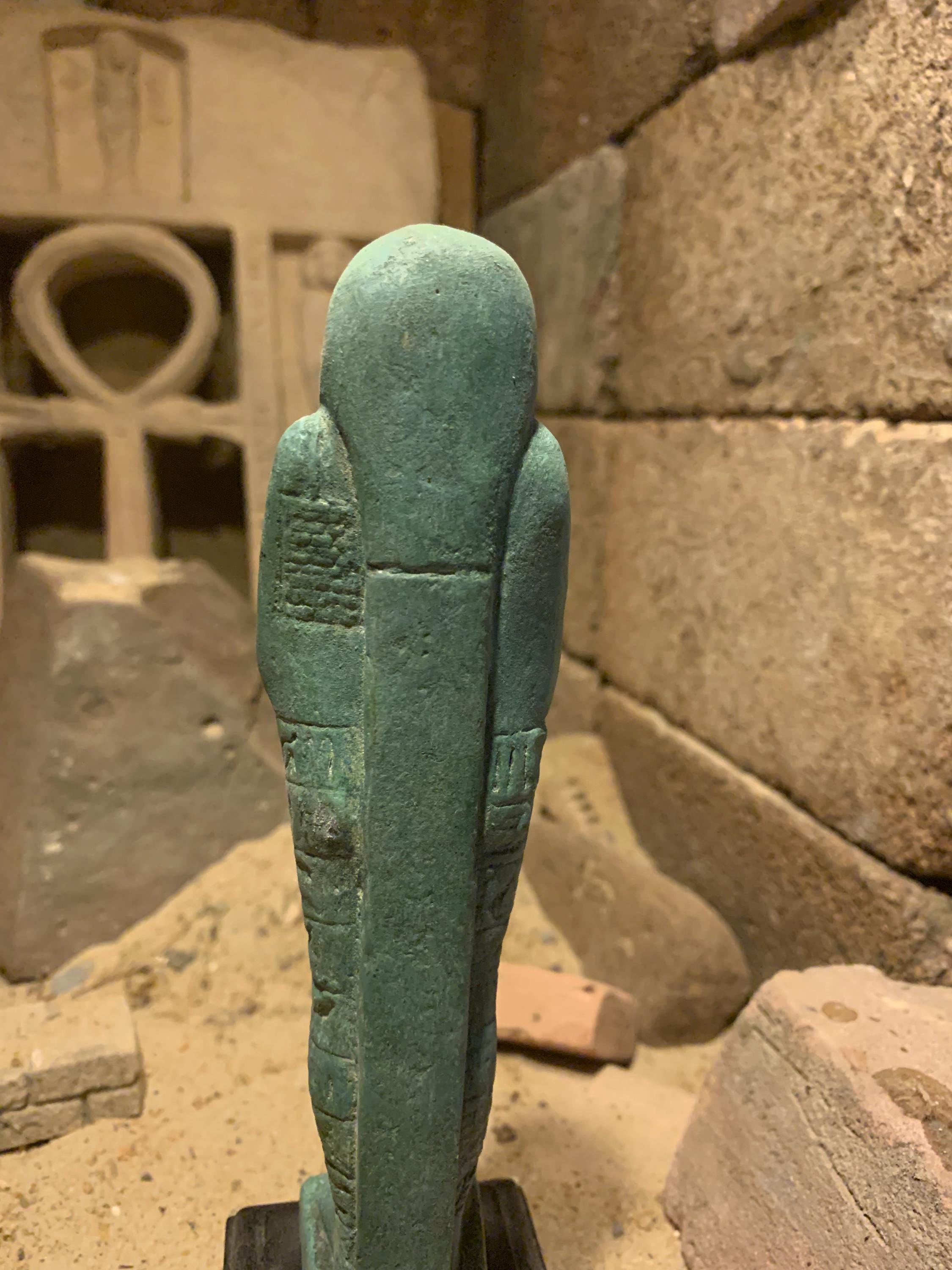 The name stems from the Sha-wab tree, as early figures were made from its wood. Later figures employed a great variety of materials such as clay, faience{opaque blue green glass} plaster and stone depending on what you could afford. These figures were placed within the tomb of an individual to magically come to life performing any work required by the god Osiris in the afterlife. A modest burial would have one or two figures, however during the late period the quantities included within a burial increased to allow a shabti for each day of the year plus overseers. Some burials had even more.