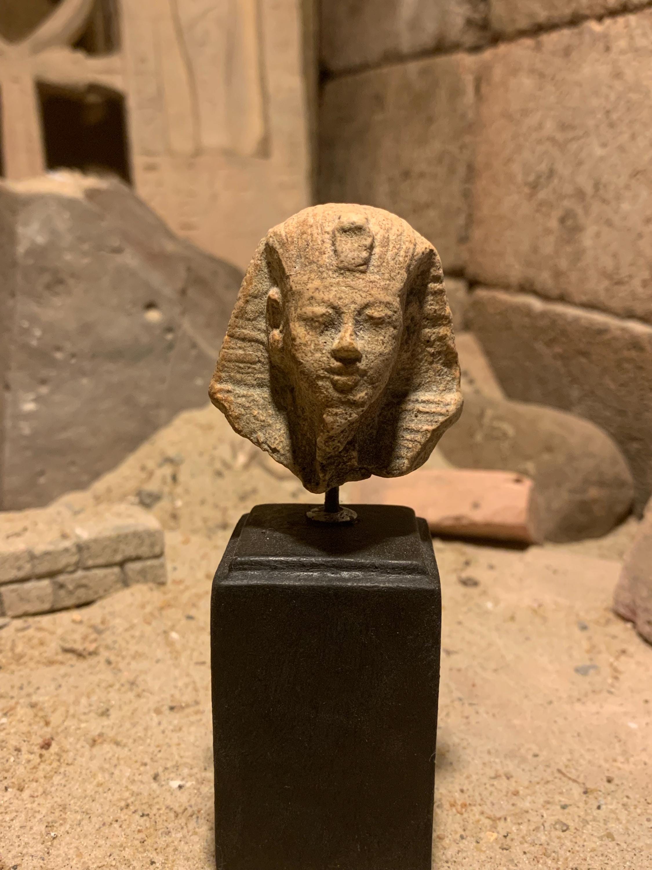 Available here is a rare replica of an original fragment from the reign of Tutankhamun. This fine piece is made of a limestone and quartzite composition stone with an aged light ochre patina. It is mounted on a polished felt based stand with the head positioned at a slightly upward angle for dramatic, and engaging effect.