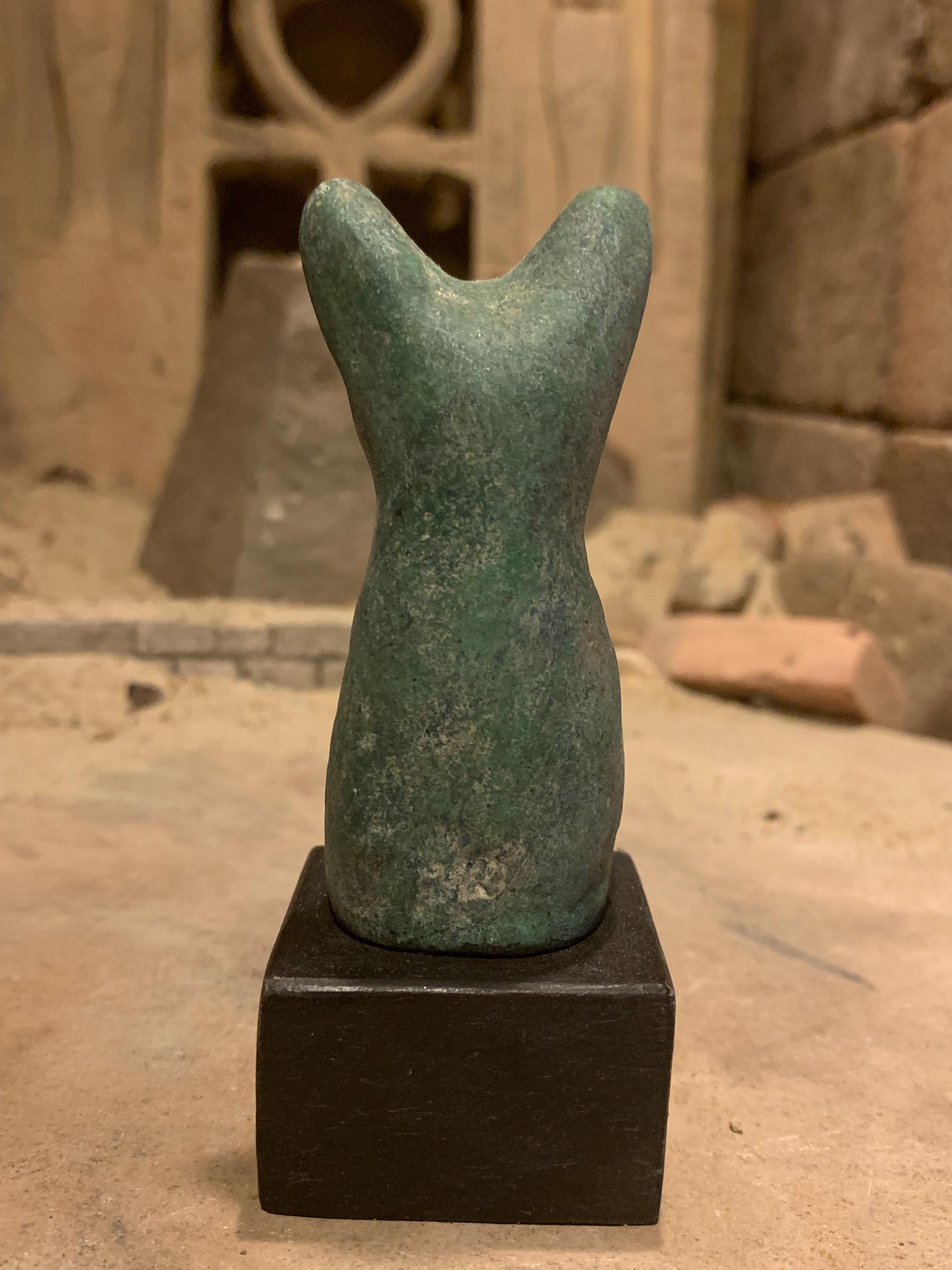 Mythology- Certainly a very popular figure in ancient Egypt from the earliest times when the domestic cat proved a worthy advantage to have protect the hard won food stuffs of the ancient pantry or temple storehouse. By dynasty number 2 she was already known and revered before a single pyramid was built. In the pantheon of Egyptian divinity she was both wife and a daughter of Ra the sun god. She had a son named Maahes who had the body of a man and the head of a lion wearing an atef crown. (See listing -'miniature Osiris wearing Atef crown') If available.
