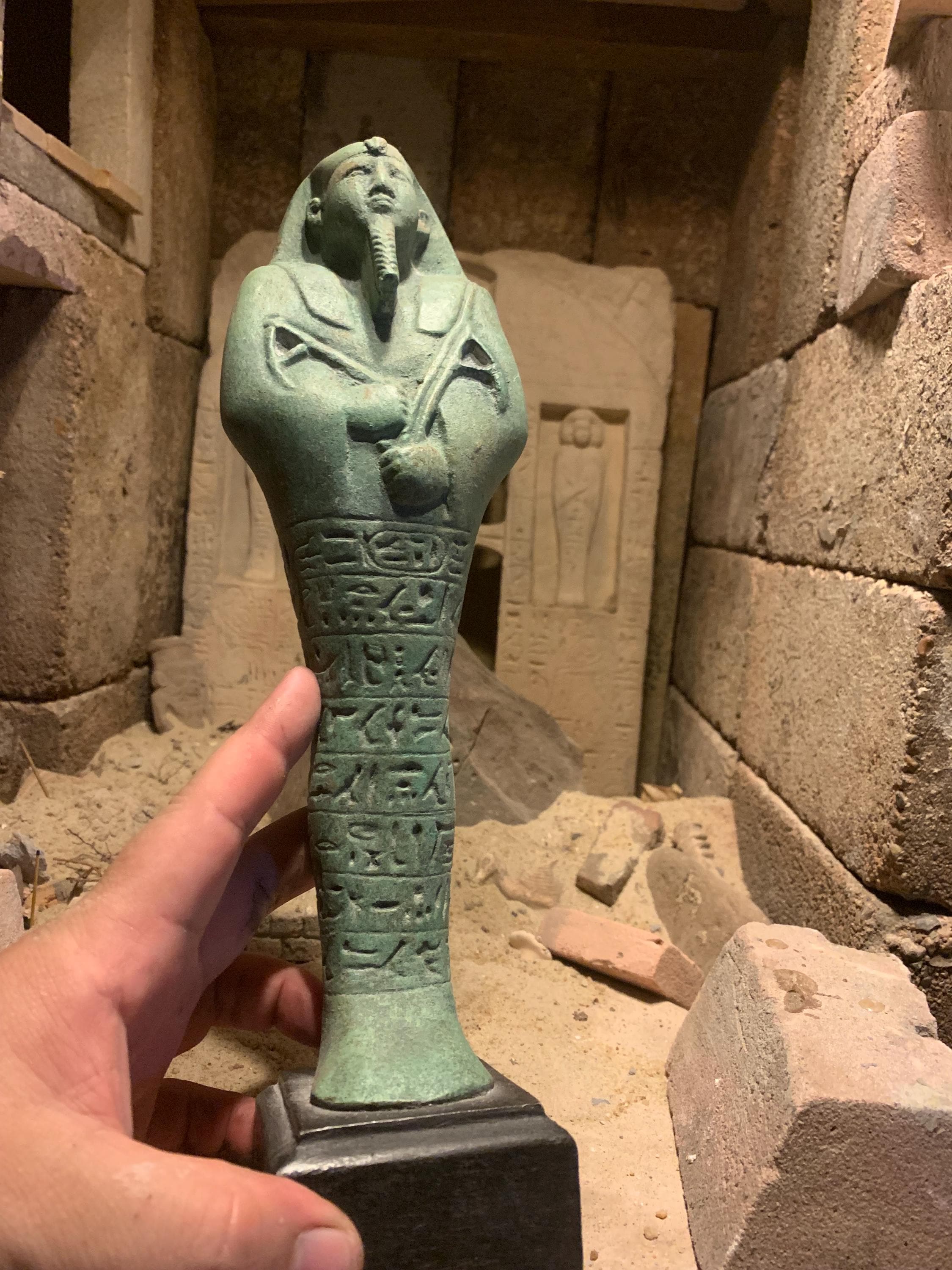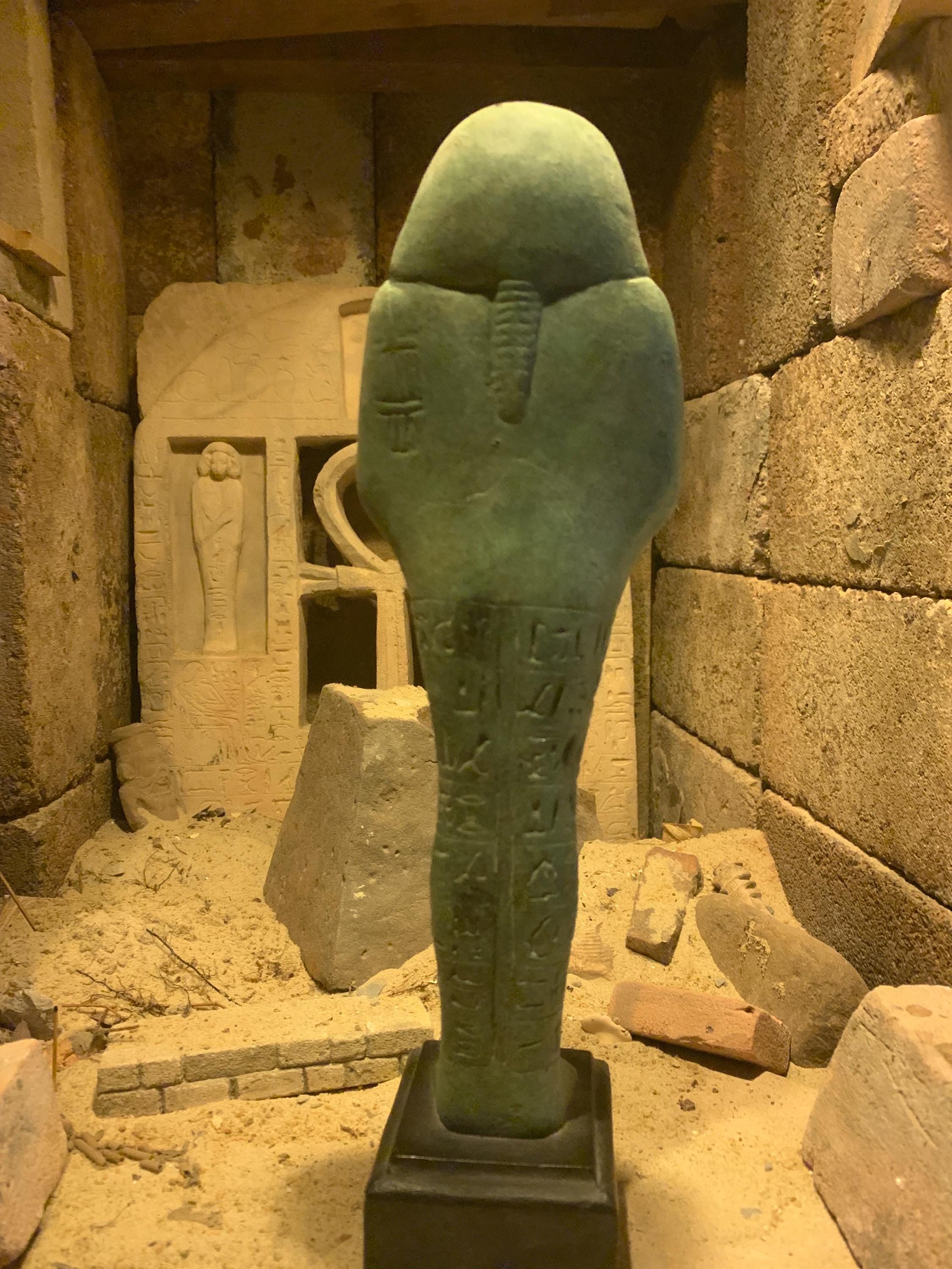 He clutches the tools he would need to till the soil in the gardens of the afterlife and a bag of seeds to plant can be seen over the left shoulder.