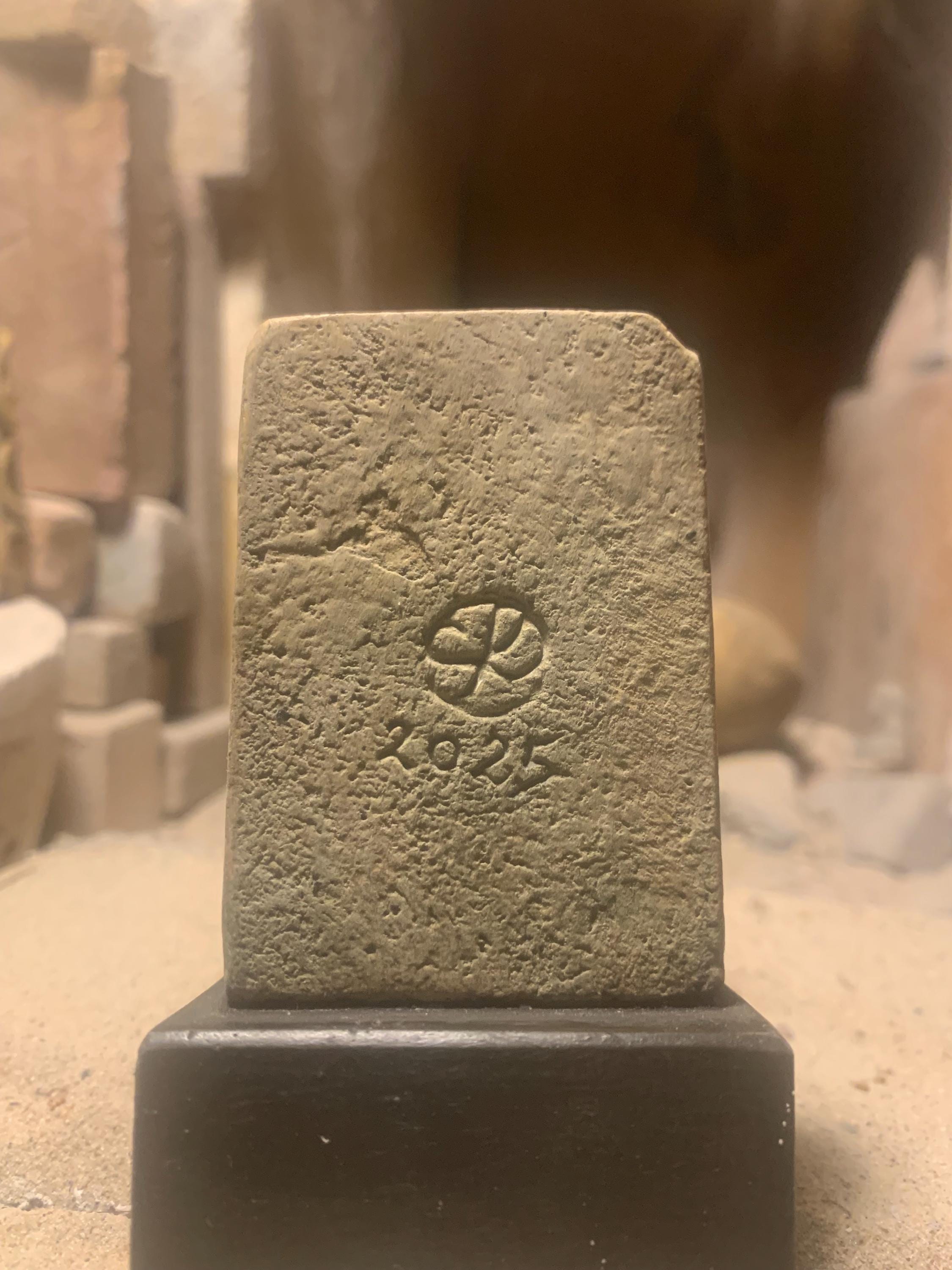 It is a signed 2025 edition made of a limestone and quartzite composition stone and has been hand painted and aged in earthy tones with etched details.