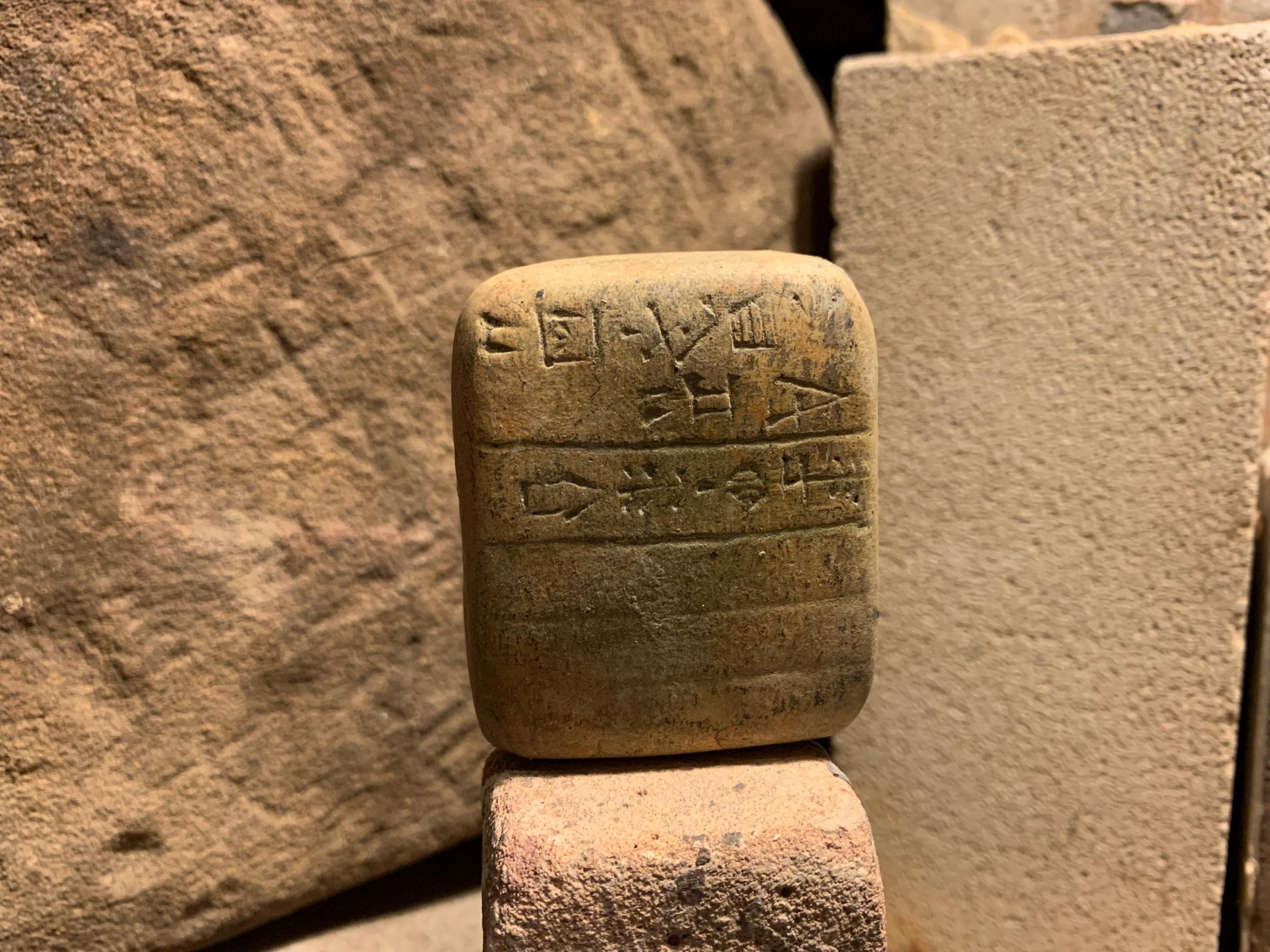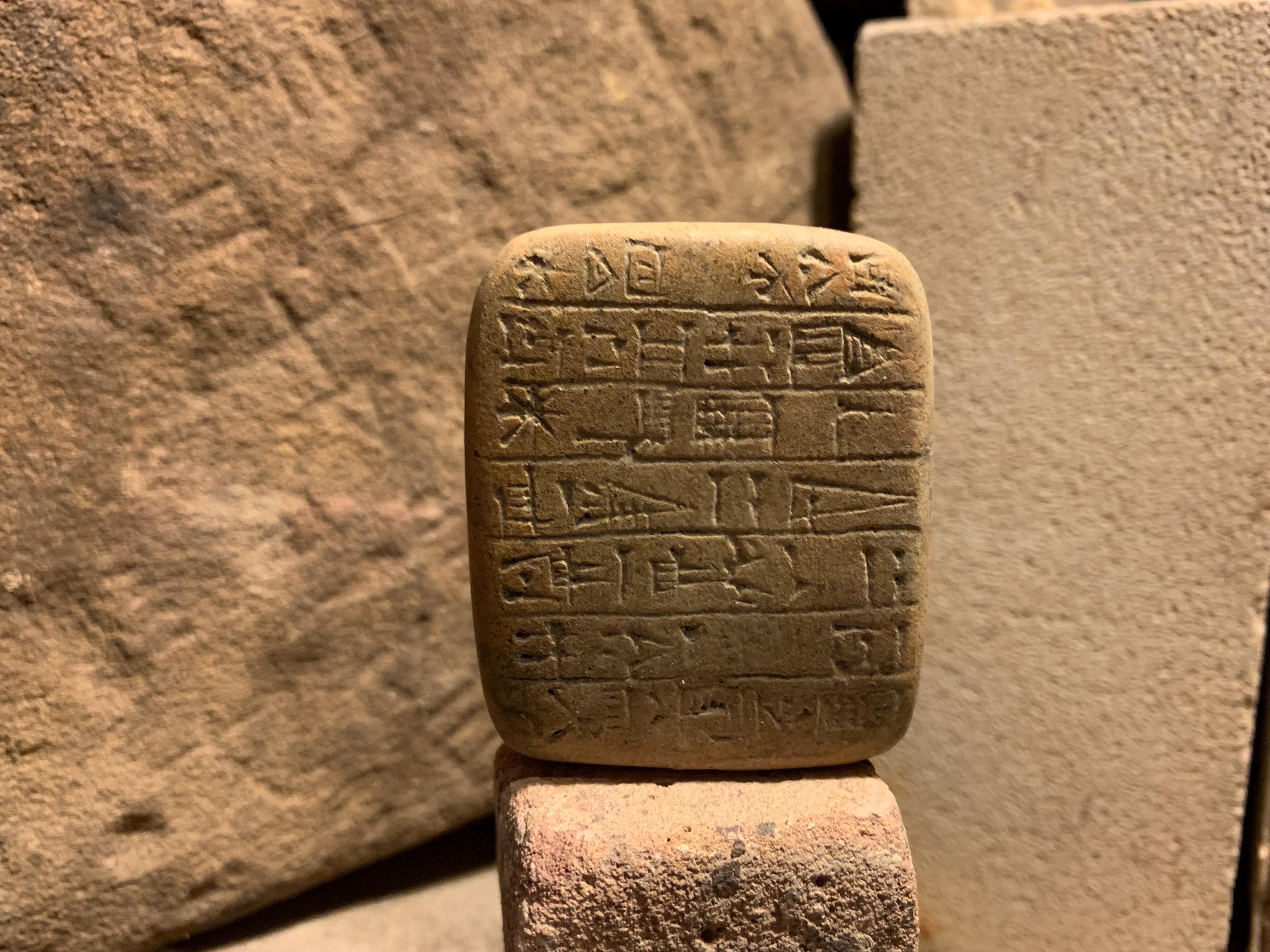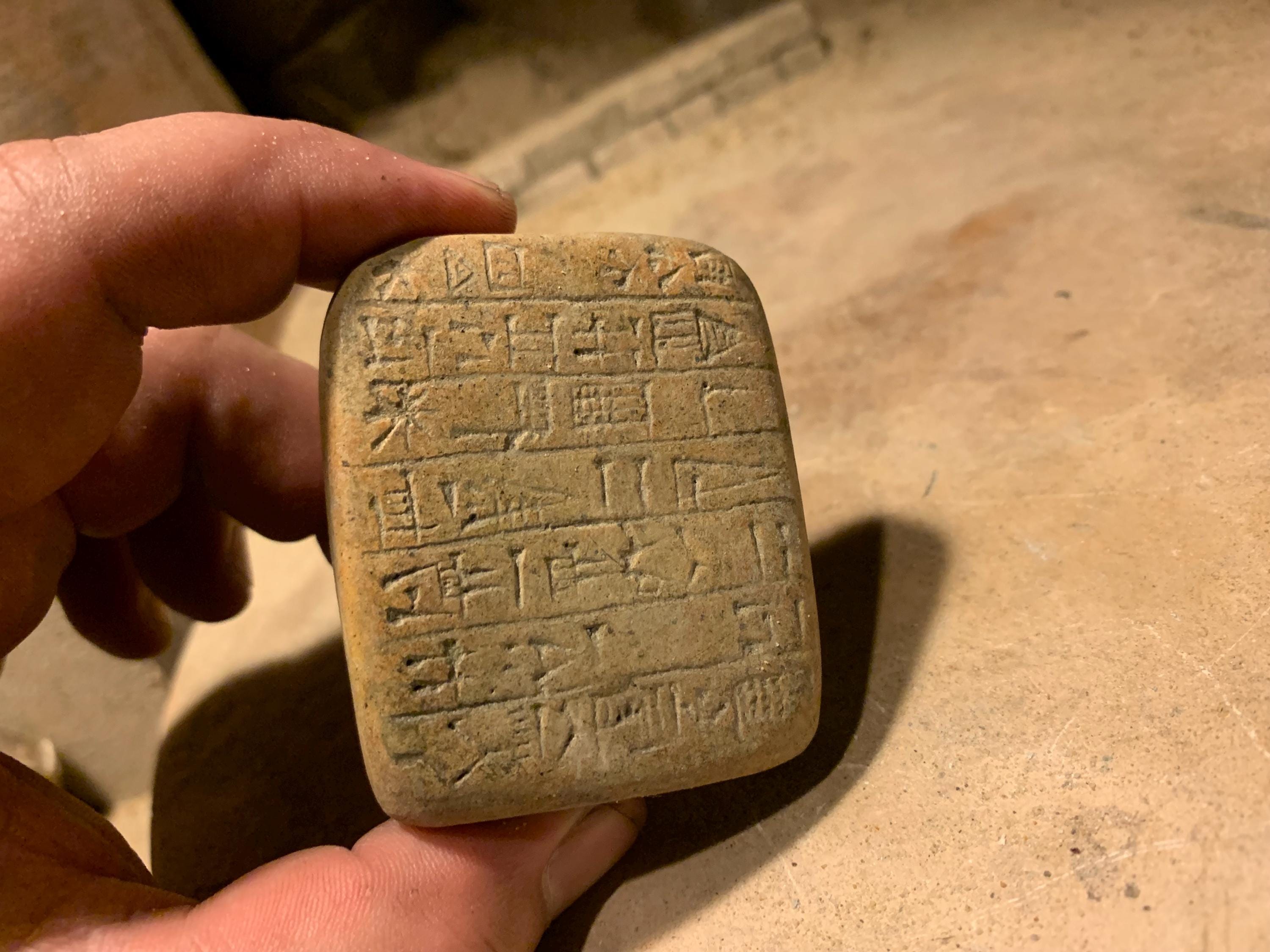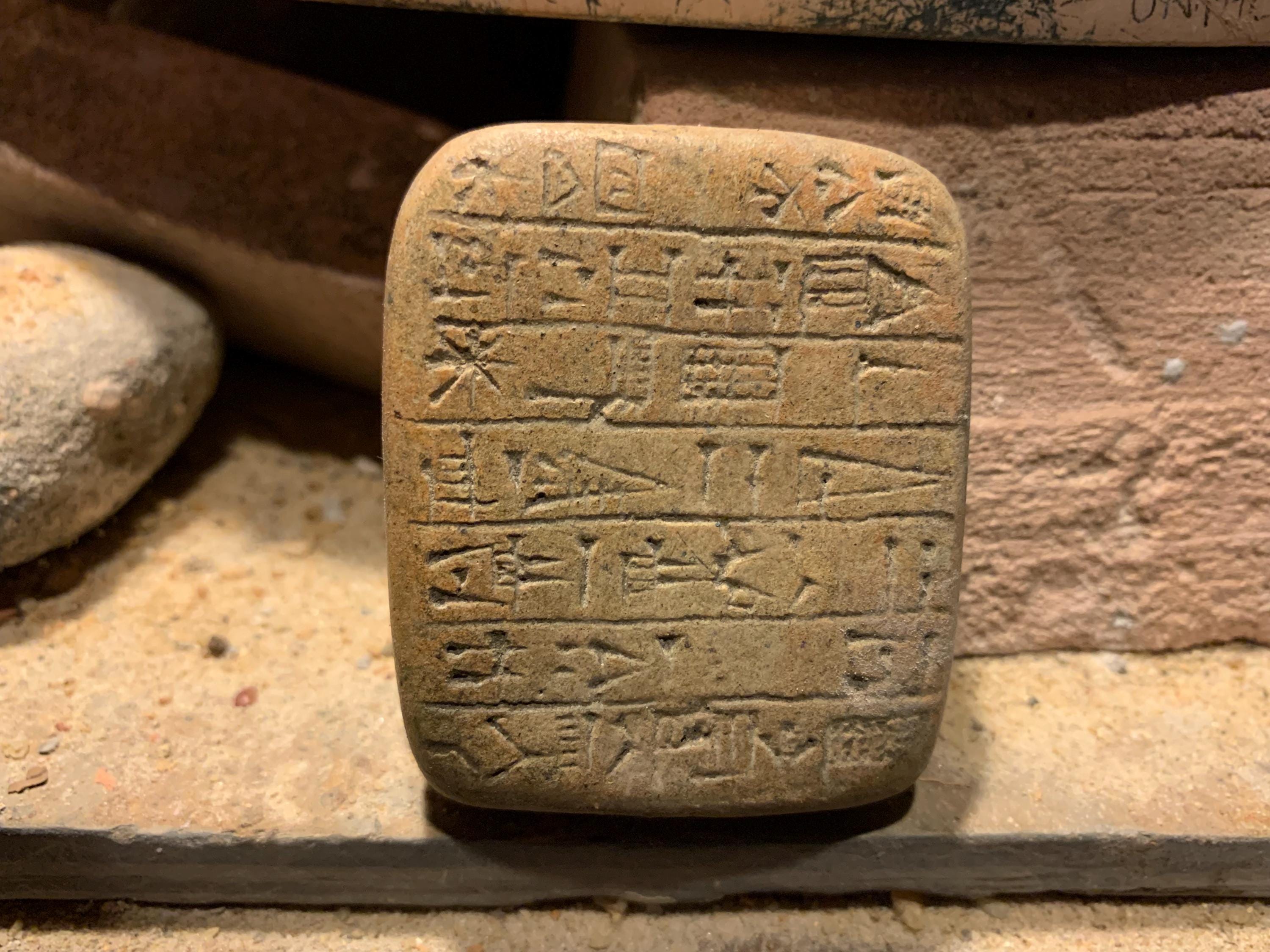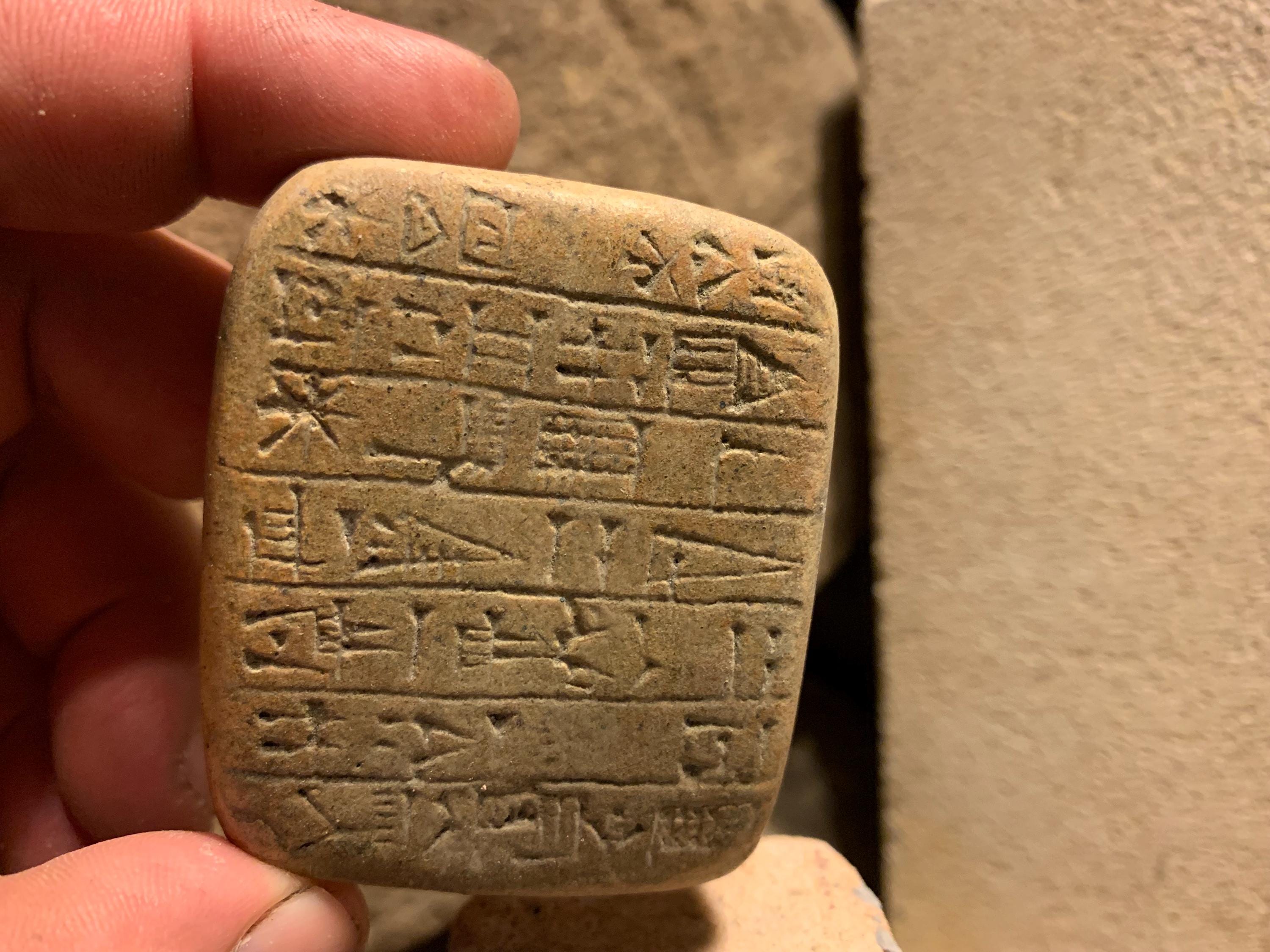 This tablet describes Gudea’s dedication to the project in fine cuneiform text. In the first line a group of cuneiform that looks like a star or an asterisk precedes the mention of the deity Ningursu.