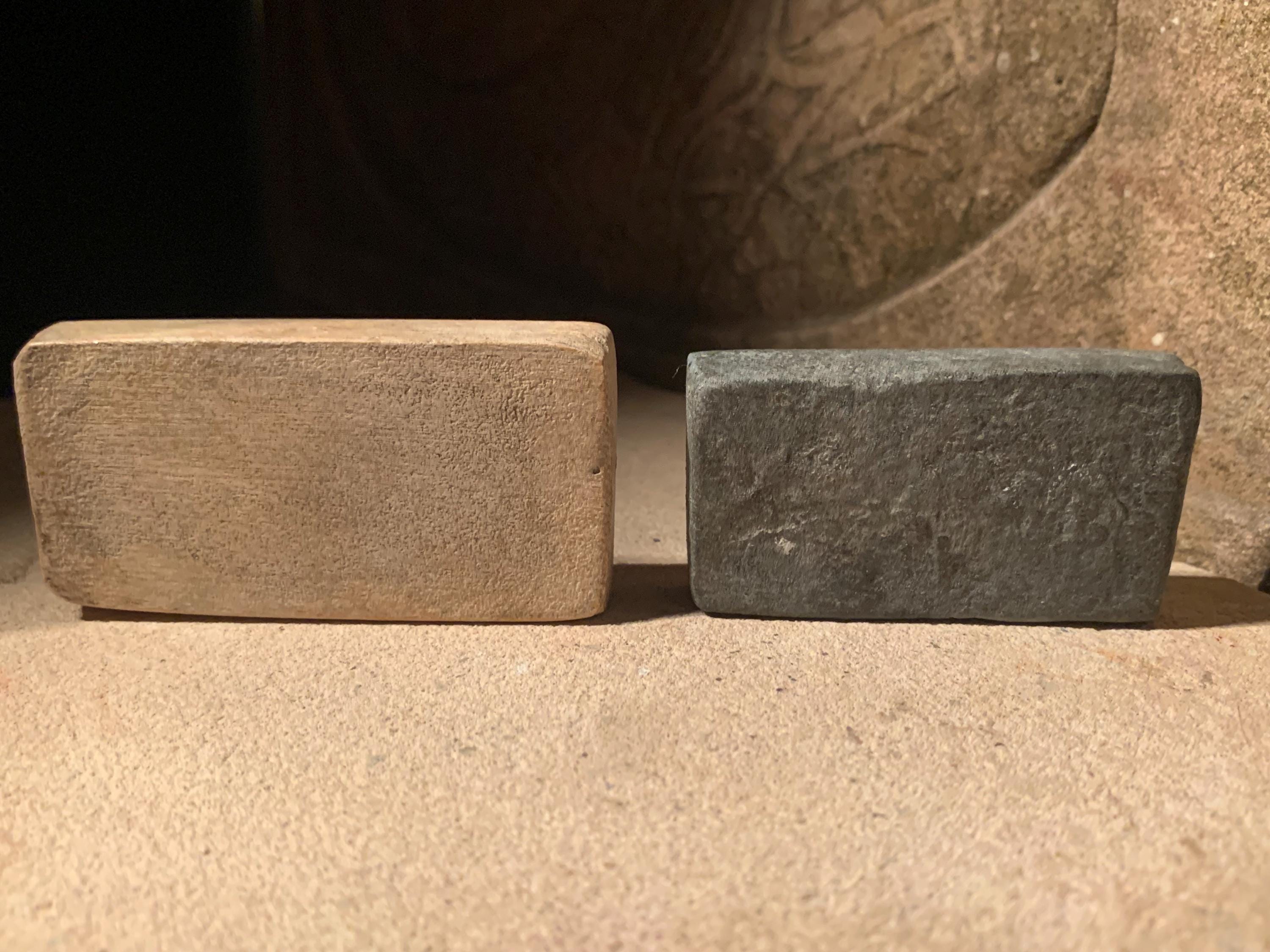 On offer here are a pair of rare seal impression replicas of Assyrian and Sumerian design. Made of limestone and quartzite composition stone, they have aged patinas.