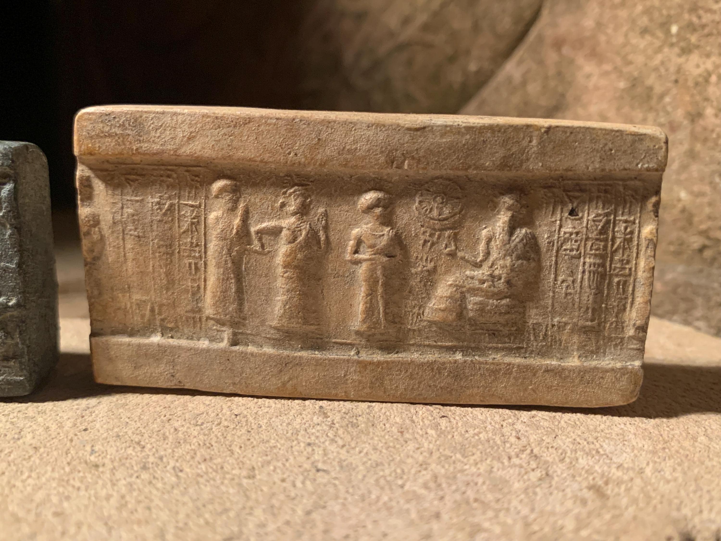 This seal is a typical example of the type created in the third dynasty of Ur. A worshipper is lead by an interceding goddess to an enthroned Ur Nammu followed by a cuneiform inspcription that denotes the owner of the seal as a trader.