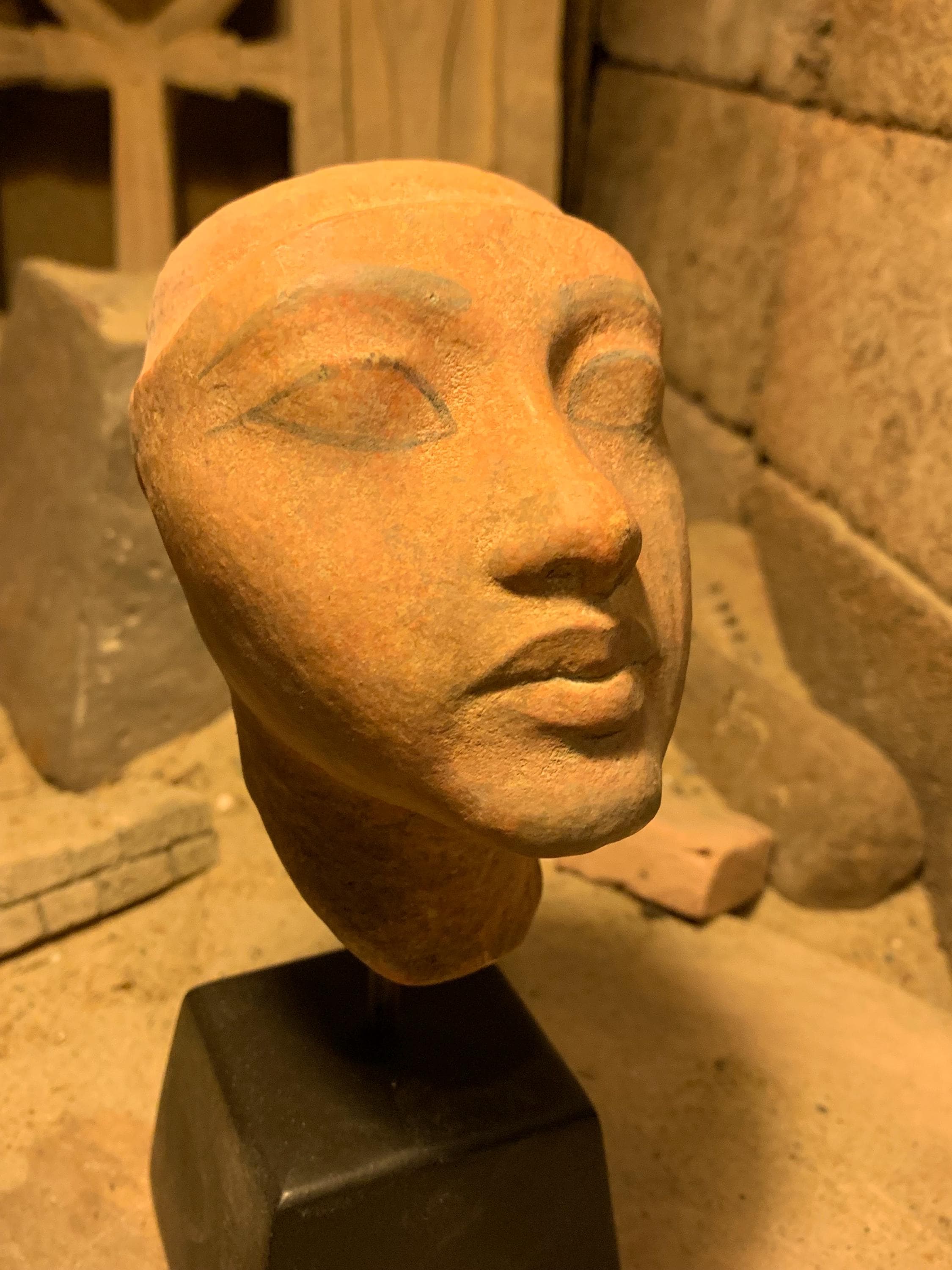 Made of a limestone and quartzite composition stone she has an earthy ochre colouration with traces of red on the lips and subtle eyelines in black. For an effective display option, the sculpture is mounted on an easily removable felt based stand.
