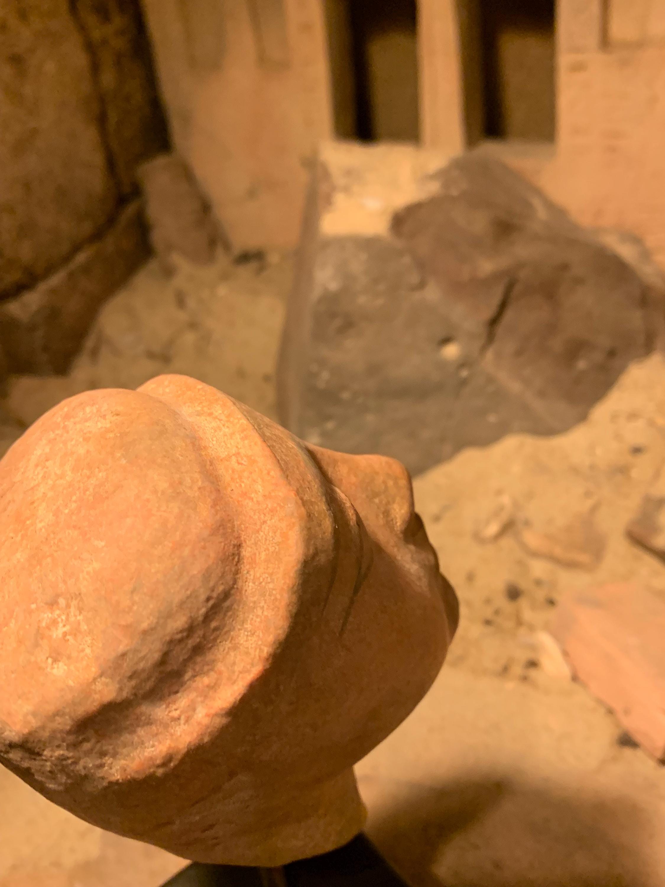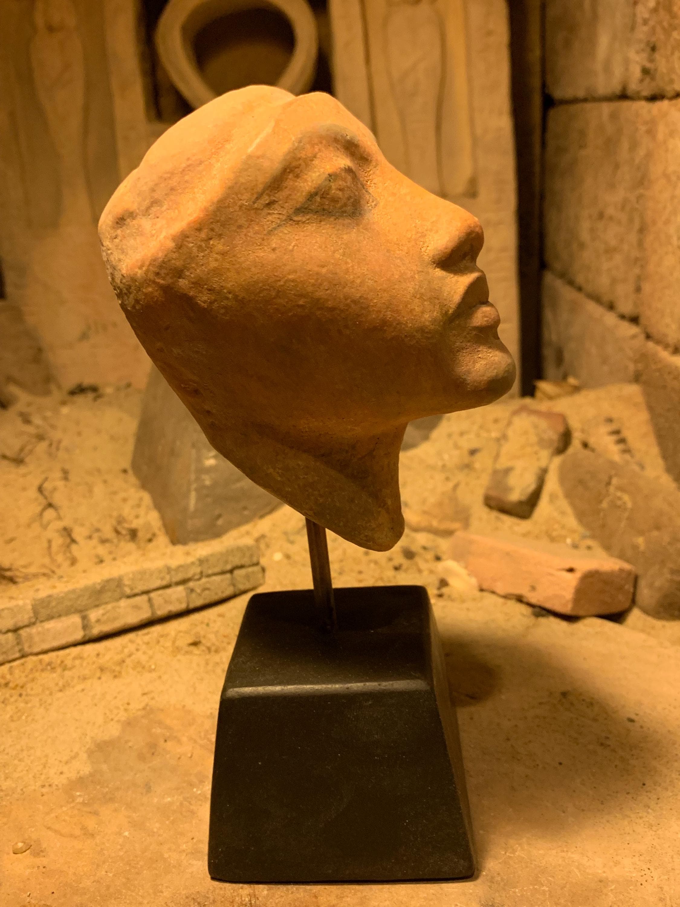 This piece was intended to have a wig as the low ridge and tang on top of the head would fit a sculpted wig or headdress carved in another material. Although it was not located at the time of excavation, It may yet be discovered lurking in a secret niche in another part of the city. Many fragments of such wigs, often made in stunning blue glass or paste have been found and would contrast nicely with the flesh tones of the stone head it was intended to rest upon.