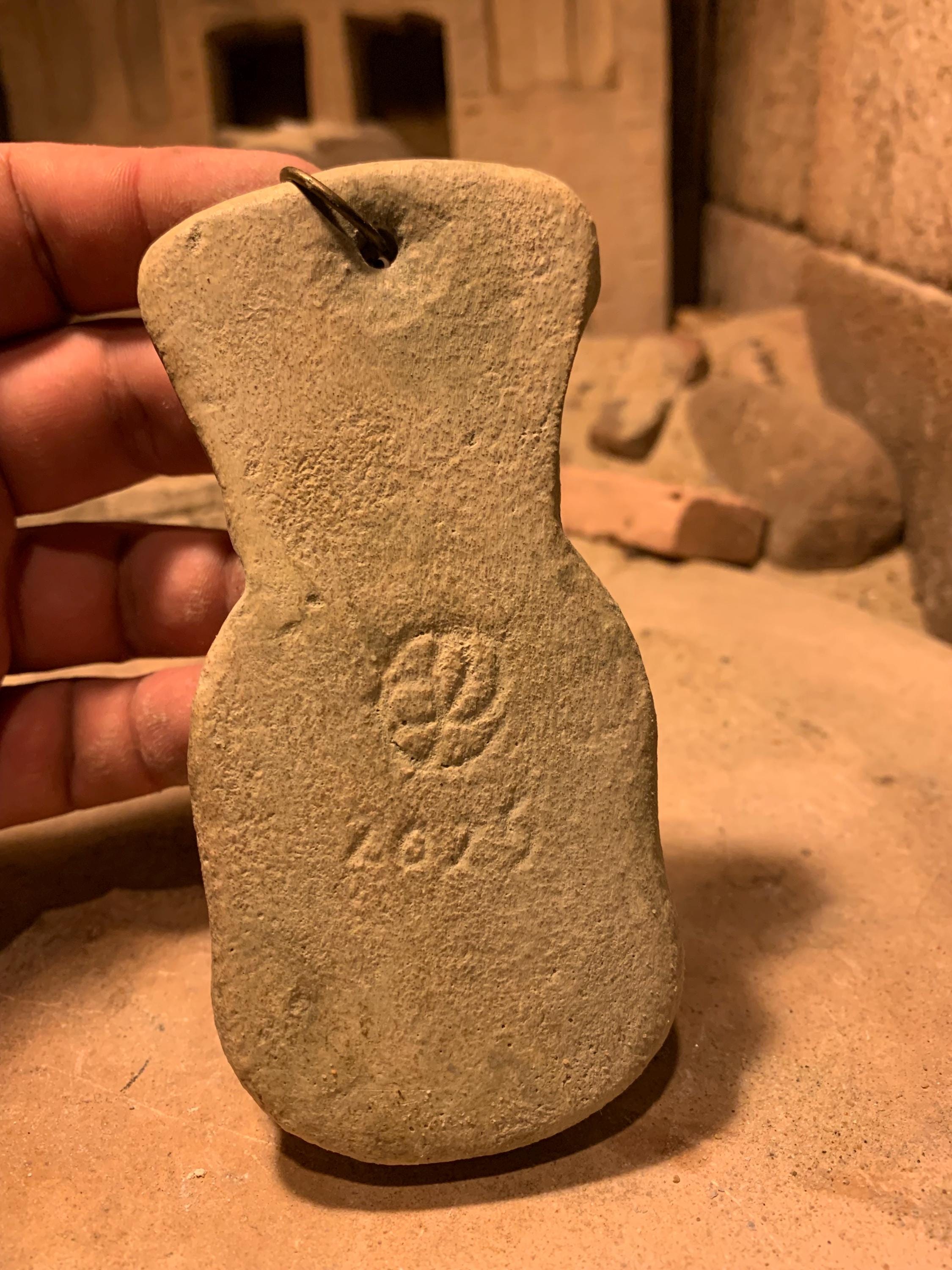 This amuletic form has a carefully positioned hole just above the shrine which makes her suitable to hang with the attached bronze ring. It is made of a limestone and quartzite composition stone and has been hand painted and aged in earthy tones with etched details.