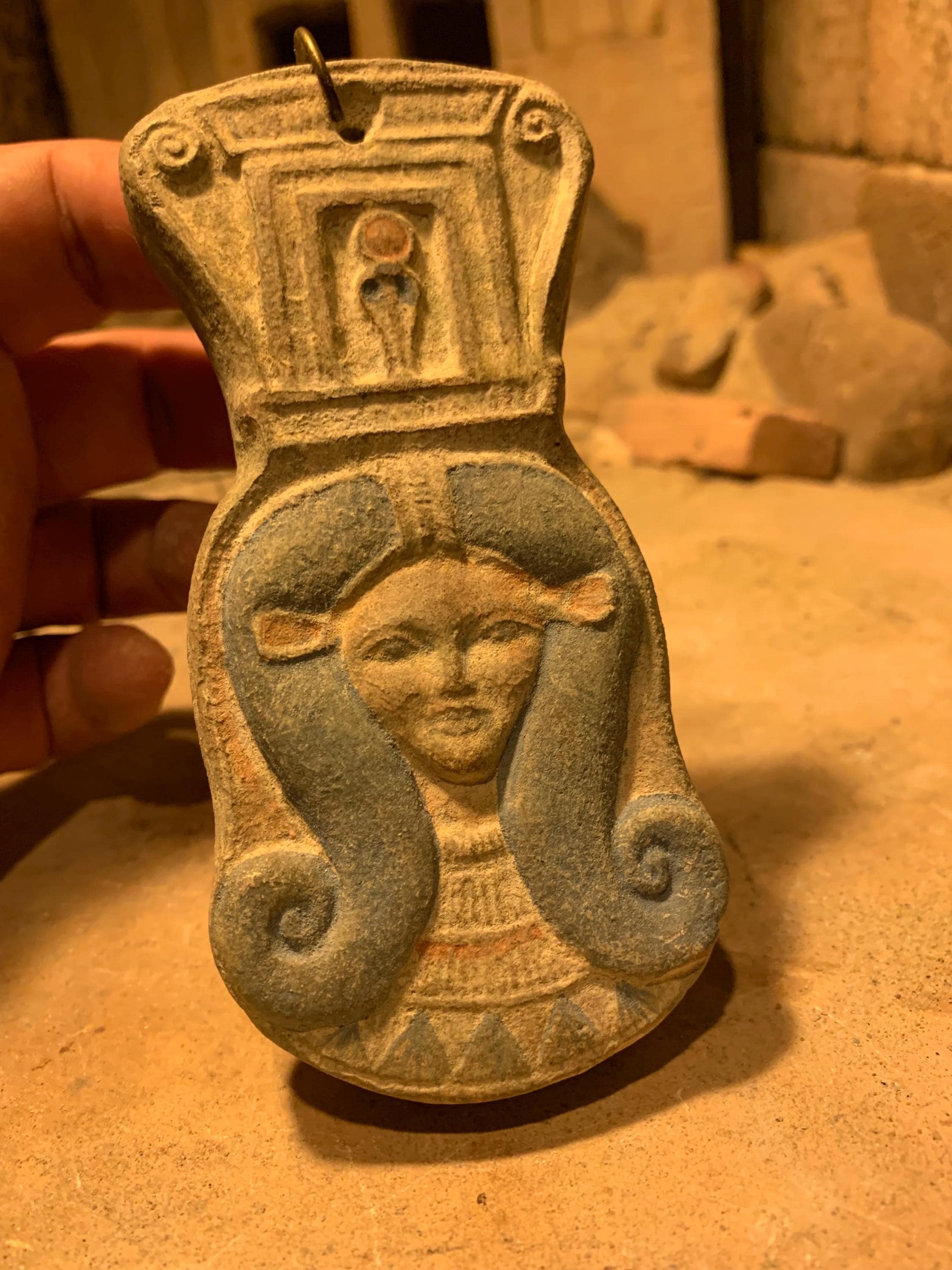 A very nice earthy amulet of the goddess Hathor in a sistrum style.