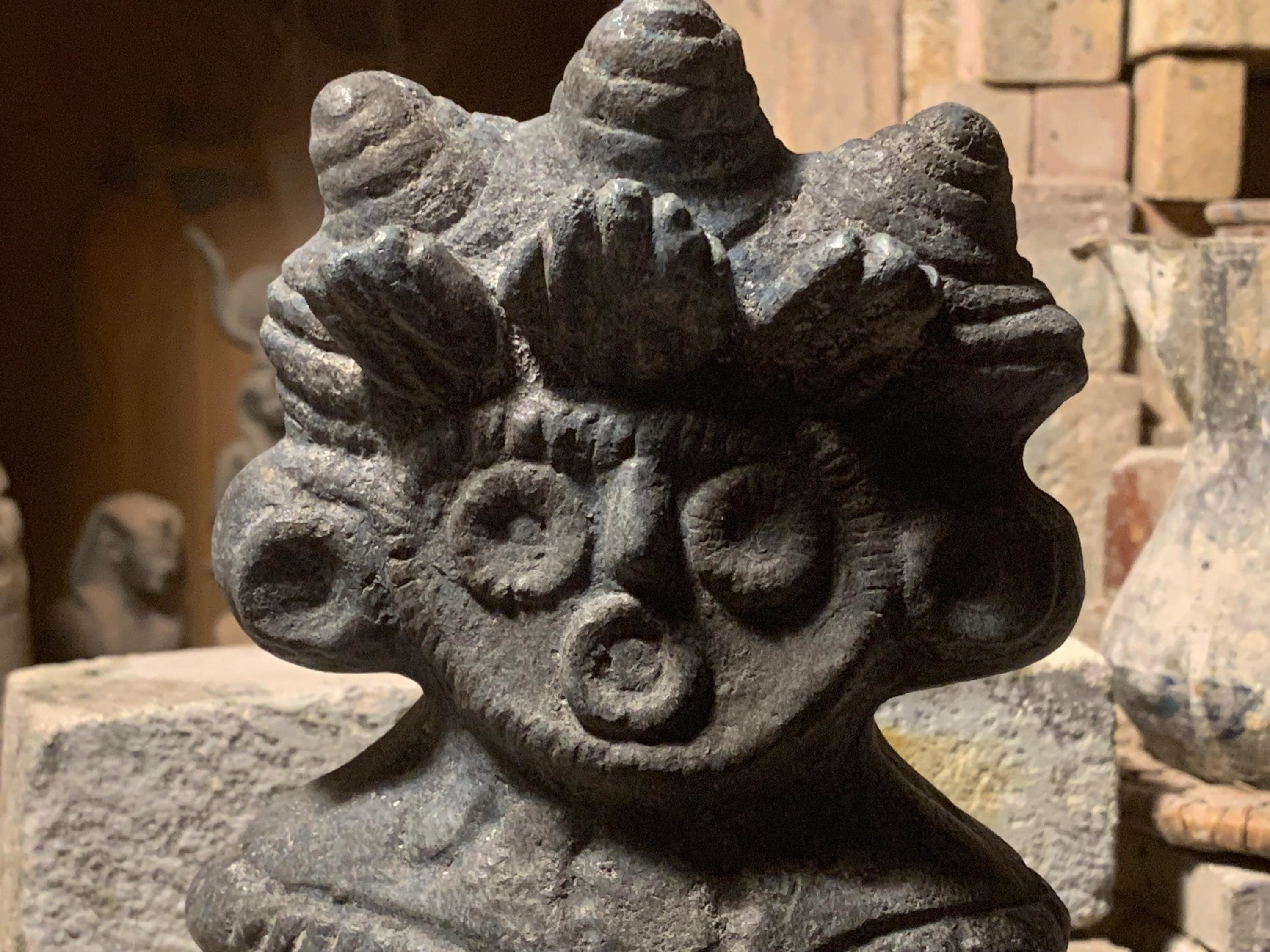 Whatever the statues represent they are one of the most fascinating genres of ancient sculptures. This substantial piece is a fine example with intricate details and pleasing form. Made of a limestone and quartzite composition stone it has an ancient earthy black / grey colour.