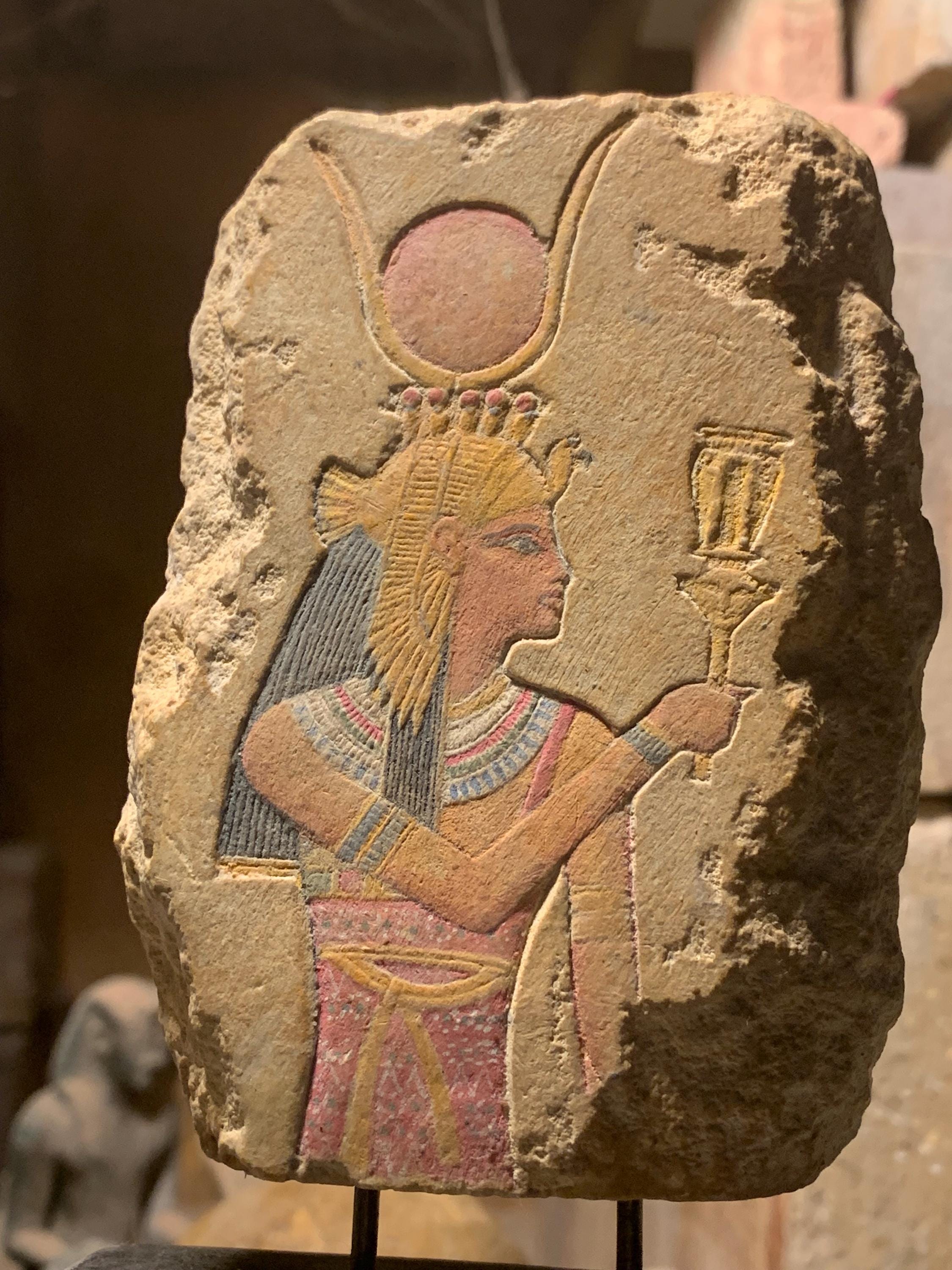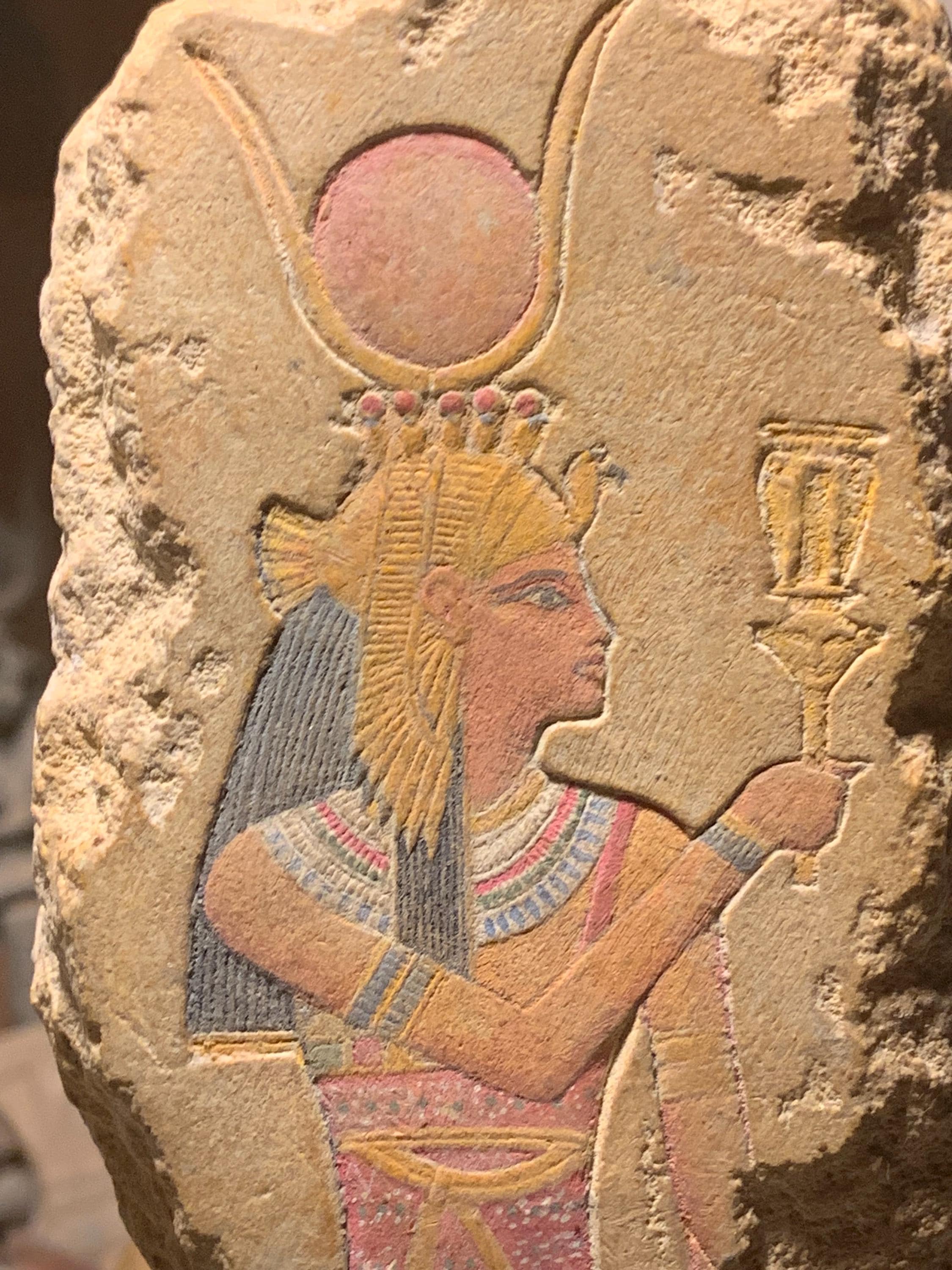 In this detailed representation, Isis wears a complex combination headdress incorporating the solar disc of Ra the sun god encircled by cows horns. The latter feature was borrowed from the goddess Hathor whom she shared many characteristics with and holds the temple rattle of Hathor in her right hand.
