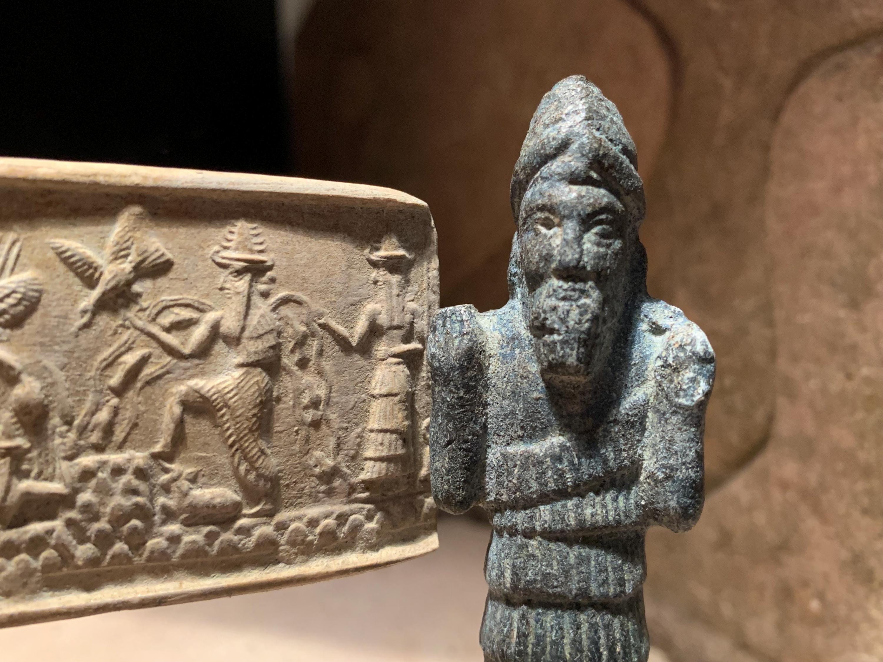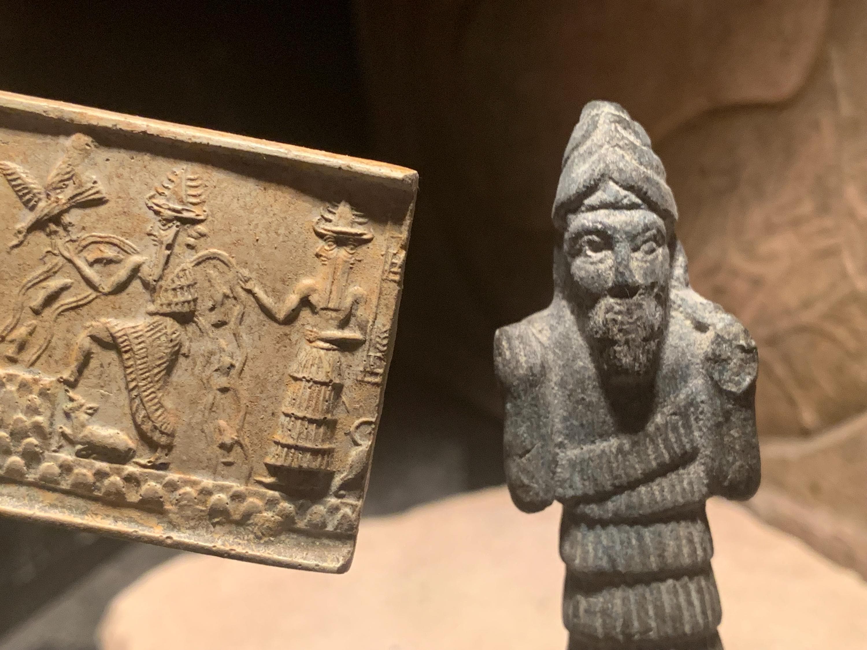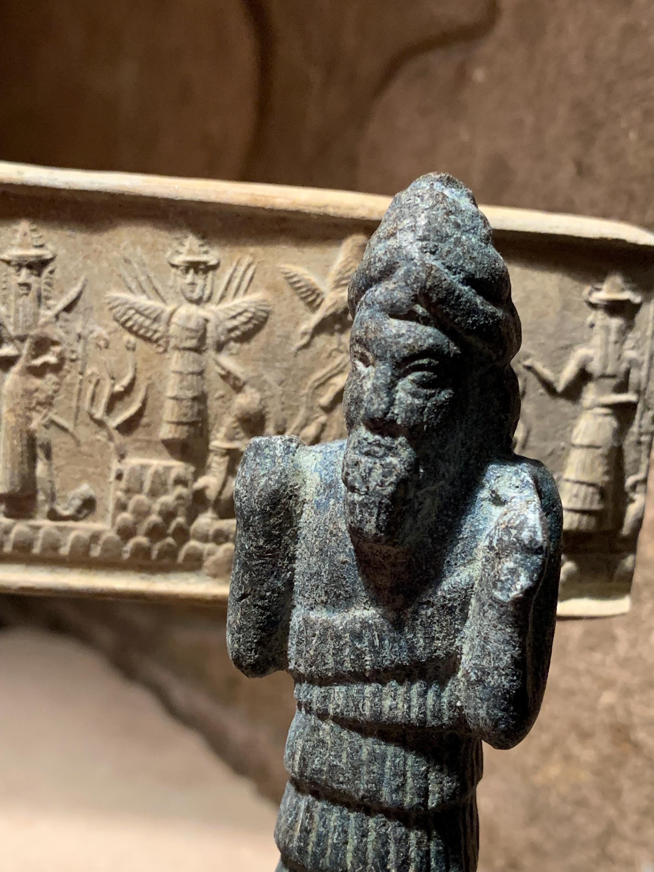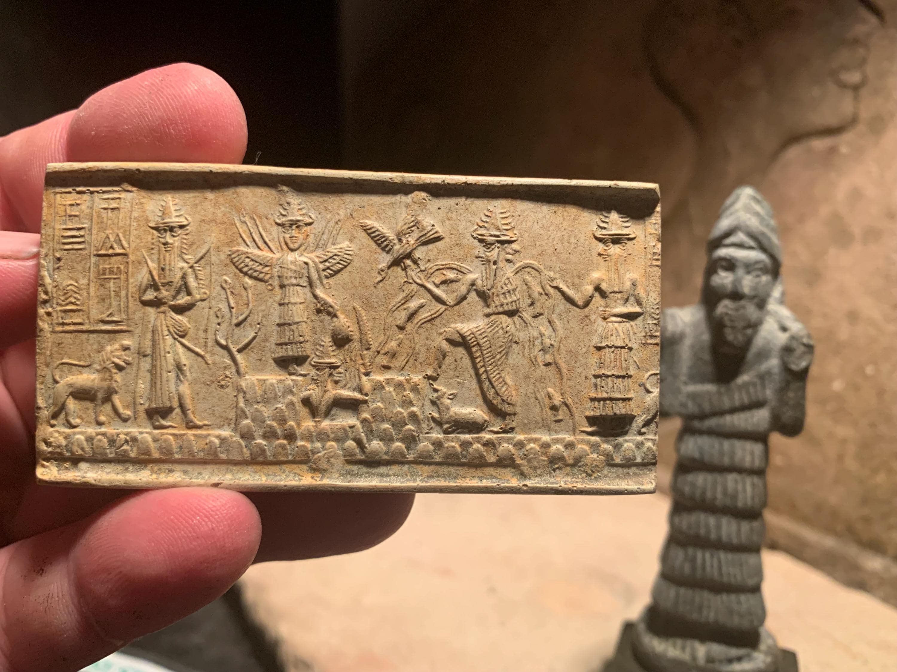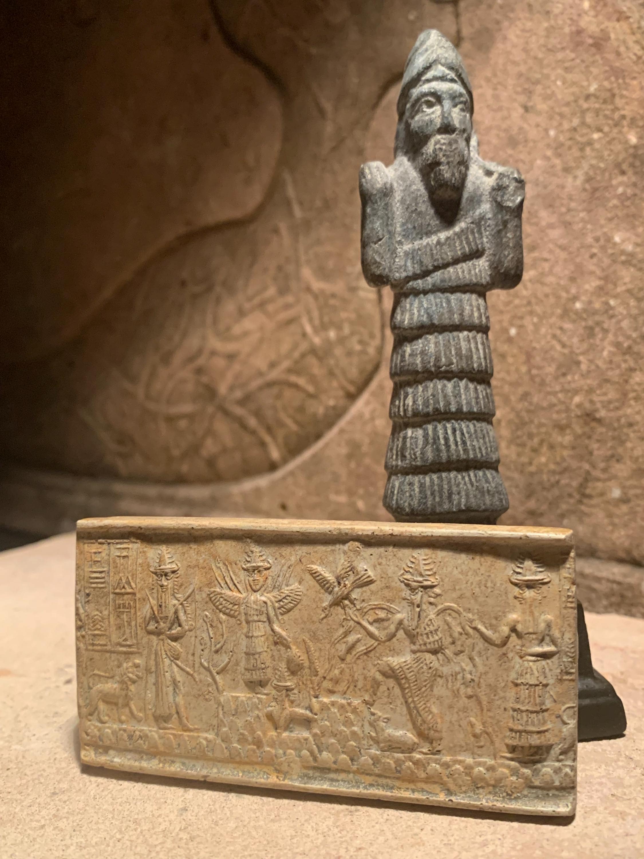 On offer here is a fine, and highly detailed replica of an Akkadian seal impression featuring four of the principal Gods of the Mesopotamian world and an attendant messenger. In addition a small statuette of Enki makes for a great combination display option.
