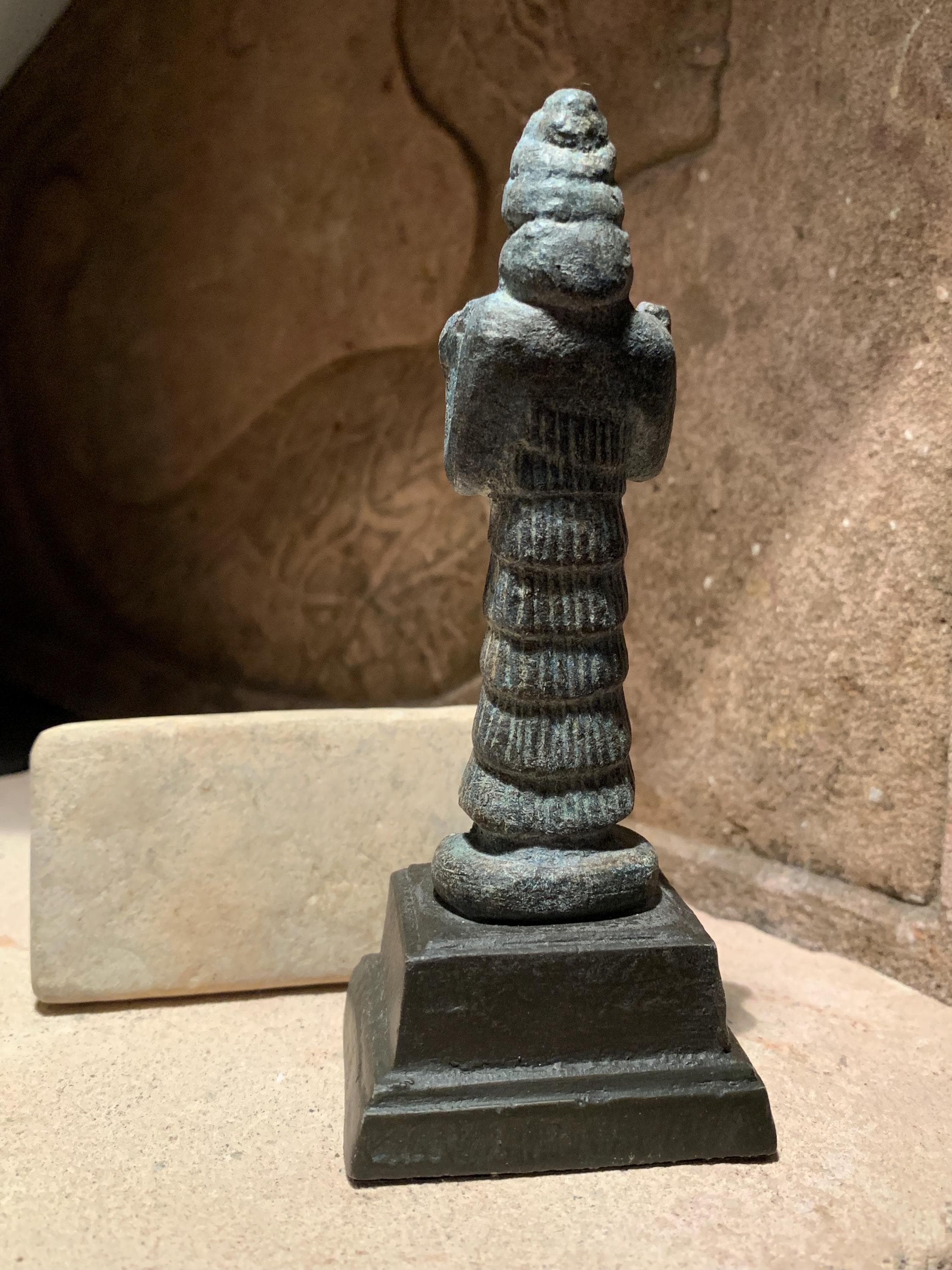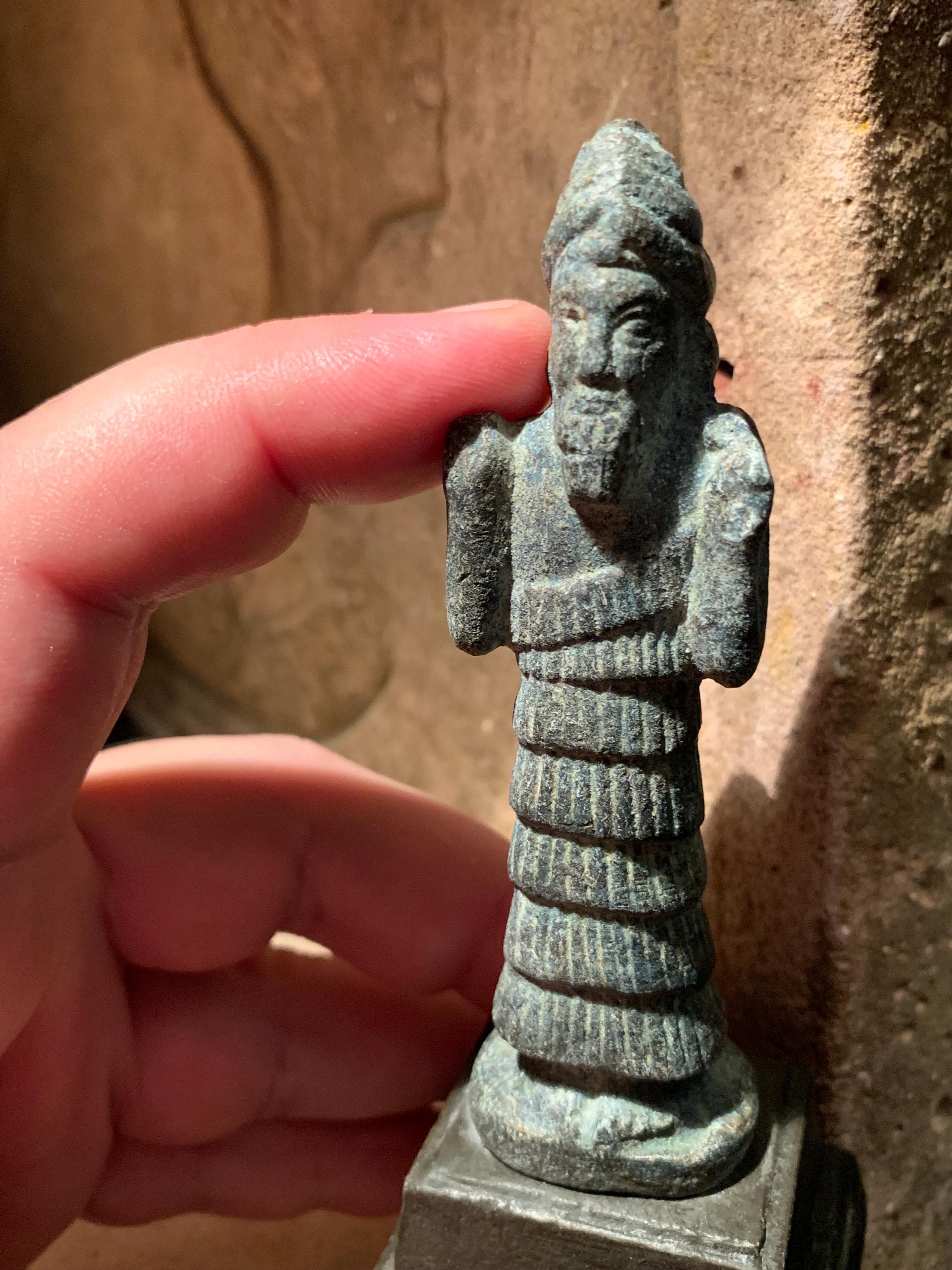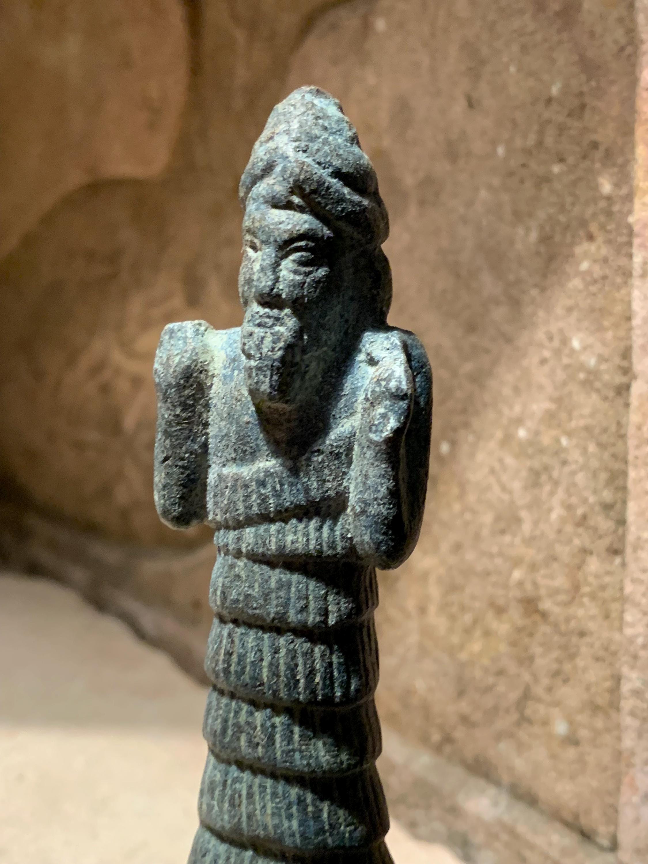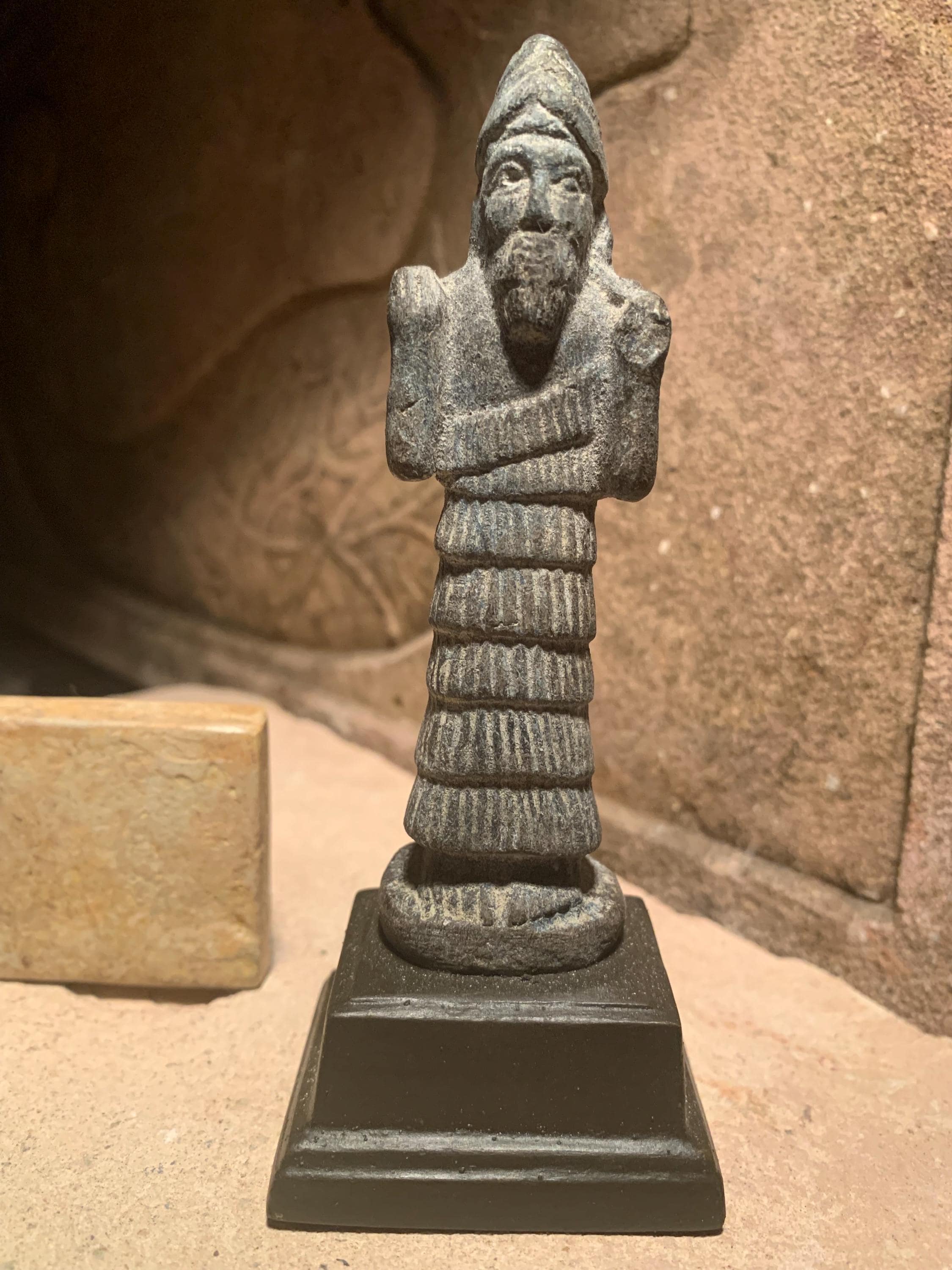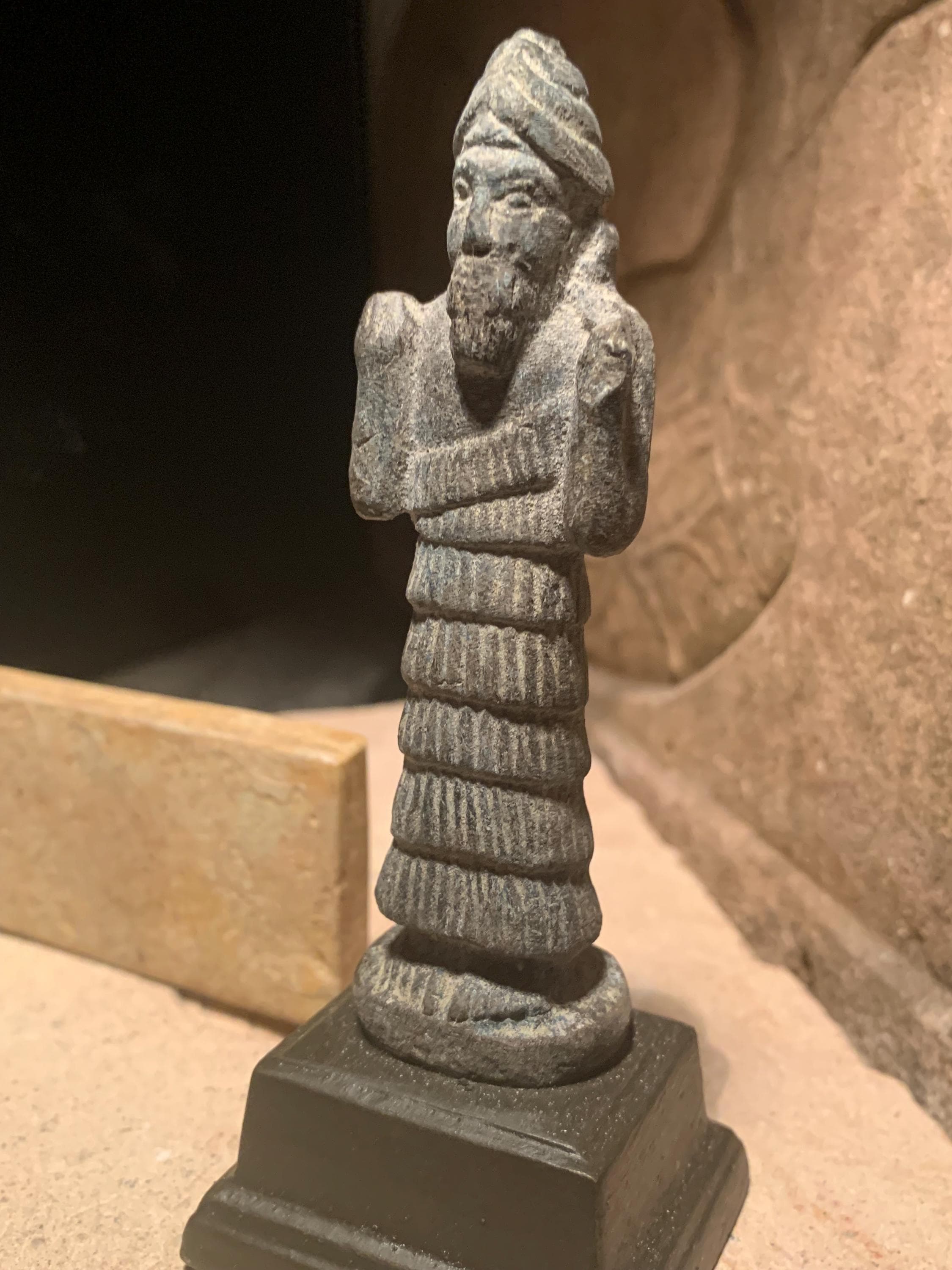 The statuette of the Sumerian god Enki is a good example of the type of votive sculpture used by the noble populace who lived in cities such as Ur, Eridu, Tello, Nippur and Susa. Enki emerged as a deity with great influence over the fertile crescent of the Mesopotamian lands. Enki is a god with many attributes and points of interest. Some are listed below :-