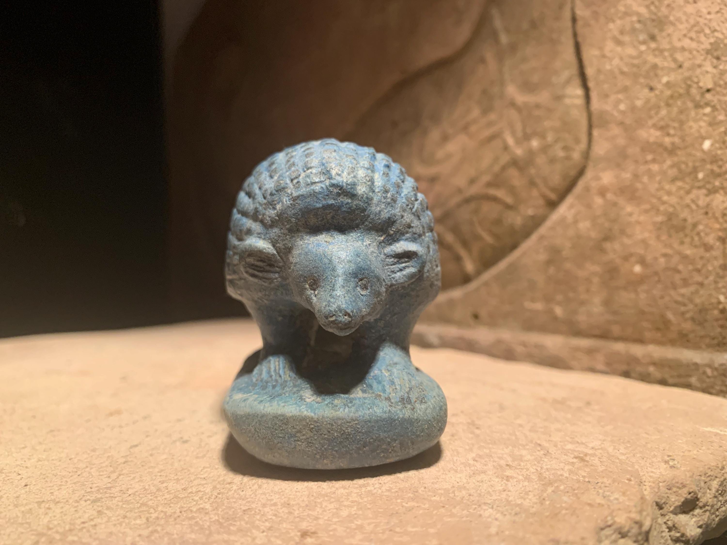 Made of a limestone and quartzite composition stone it has a traditional aged Egyptian blue patina.