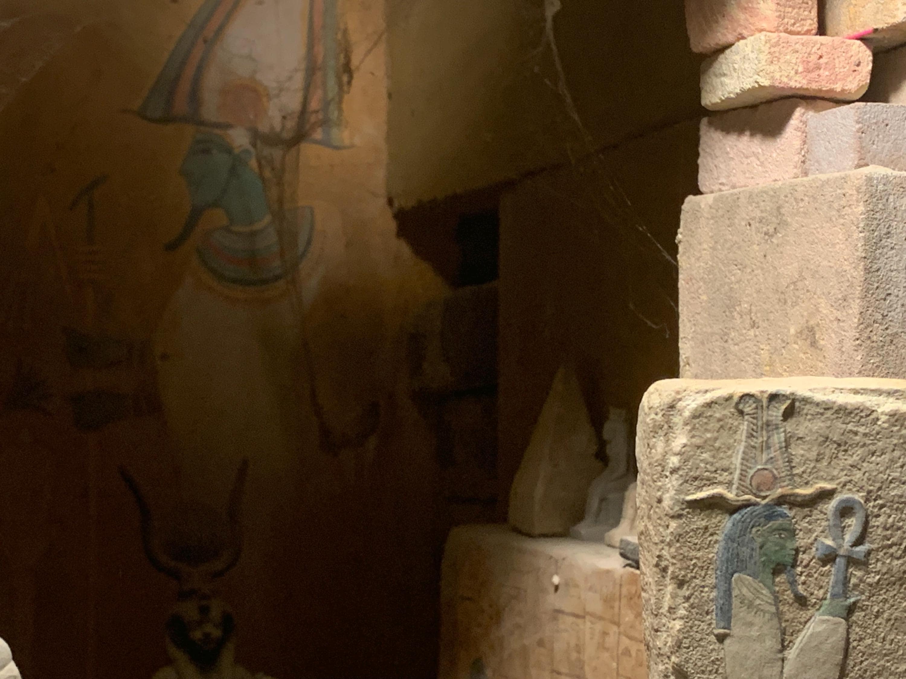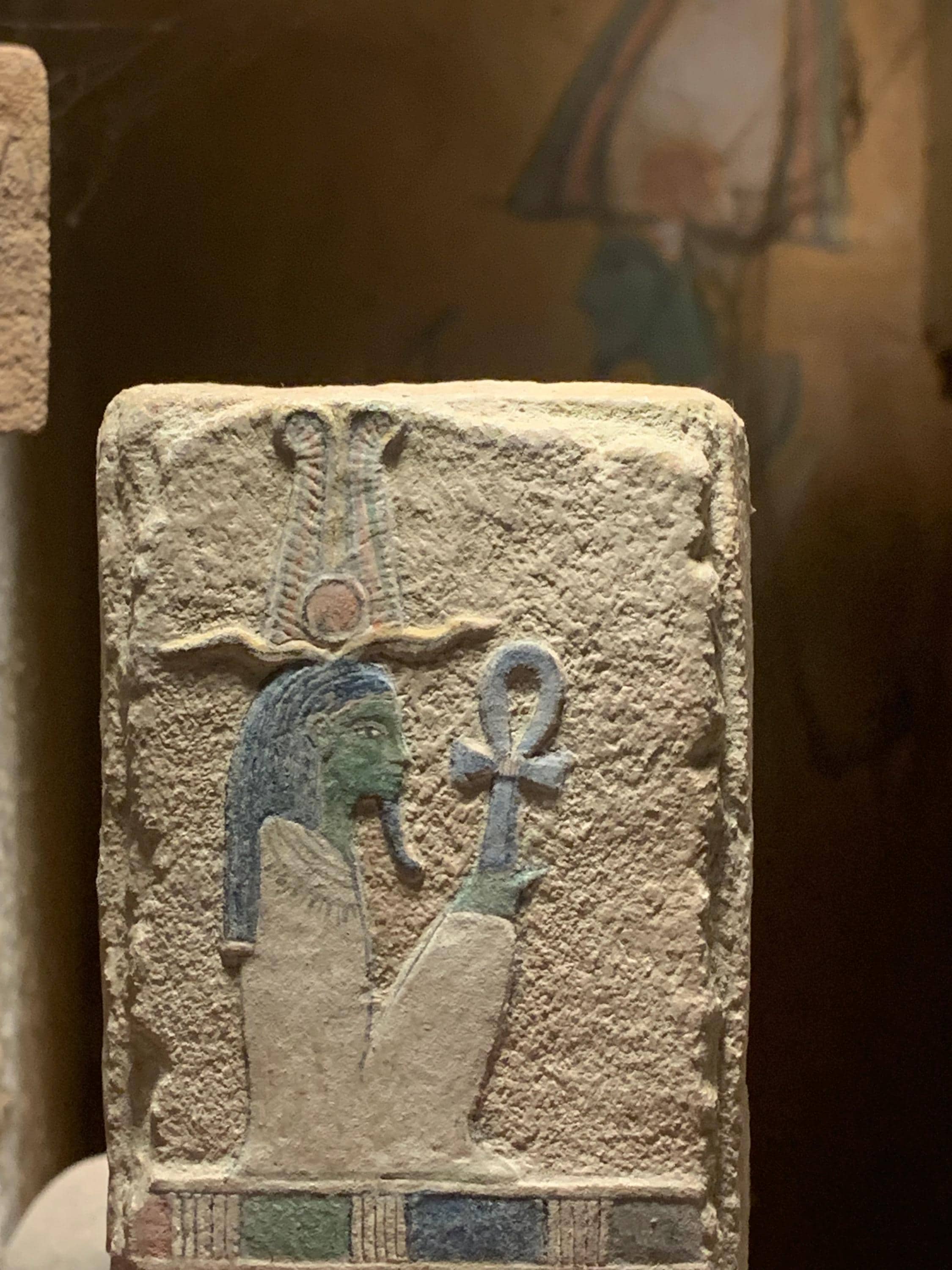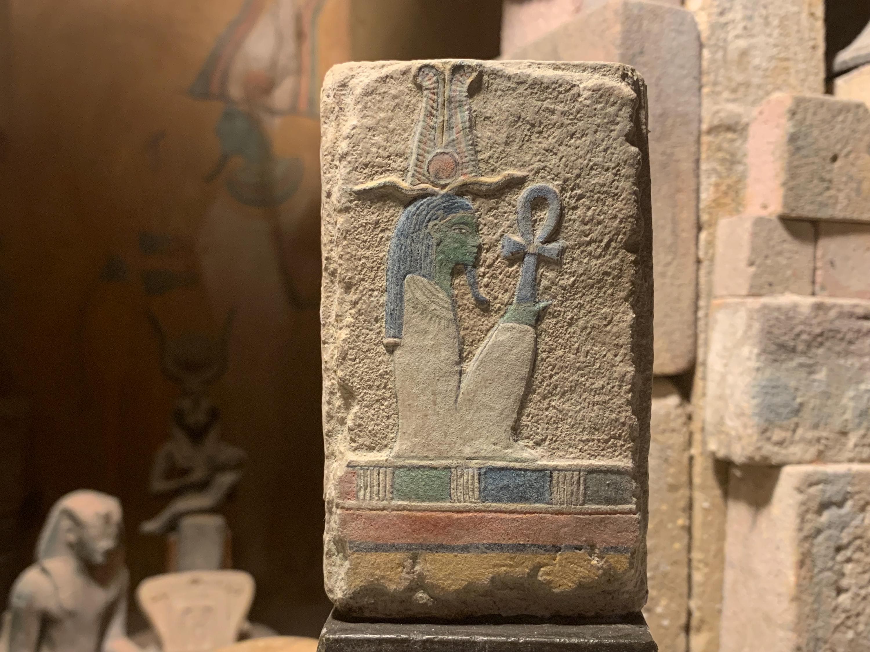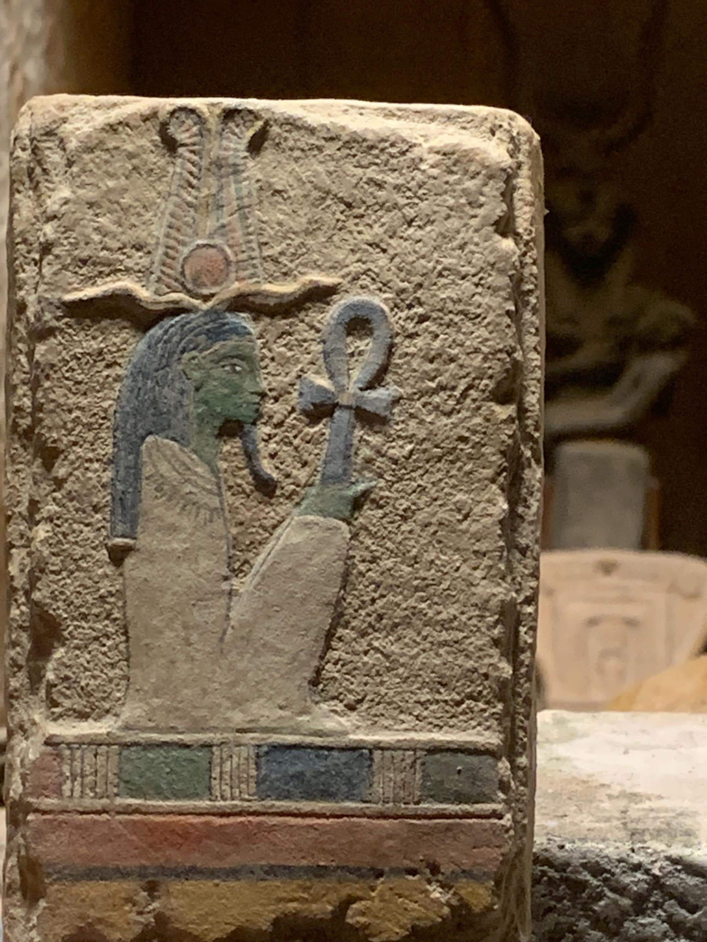 This is an unusual depiction of Osiris, the Egyptian god of the underworld / afterlife. Osiris wears an atef crown which is made of tall ostrich plumes and rams horns with a small disc of the sun in the middle at the base. The unusual aspect of this carving is the long wig that is worn instead of the tall white cone shaped crown that is the most widely known. The white crown worn by Osiris may also have ostrich plumes attached to either side of the crown but can be shown without these in paintings and sculpture.