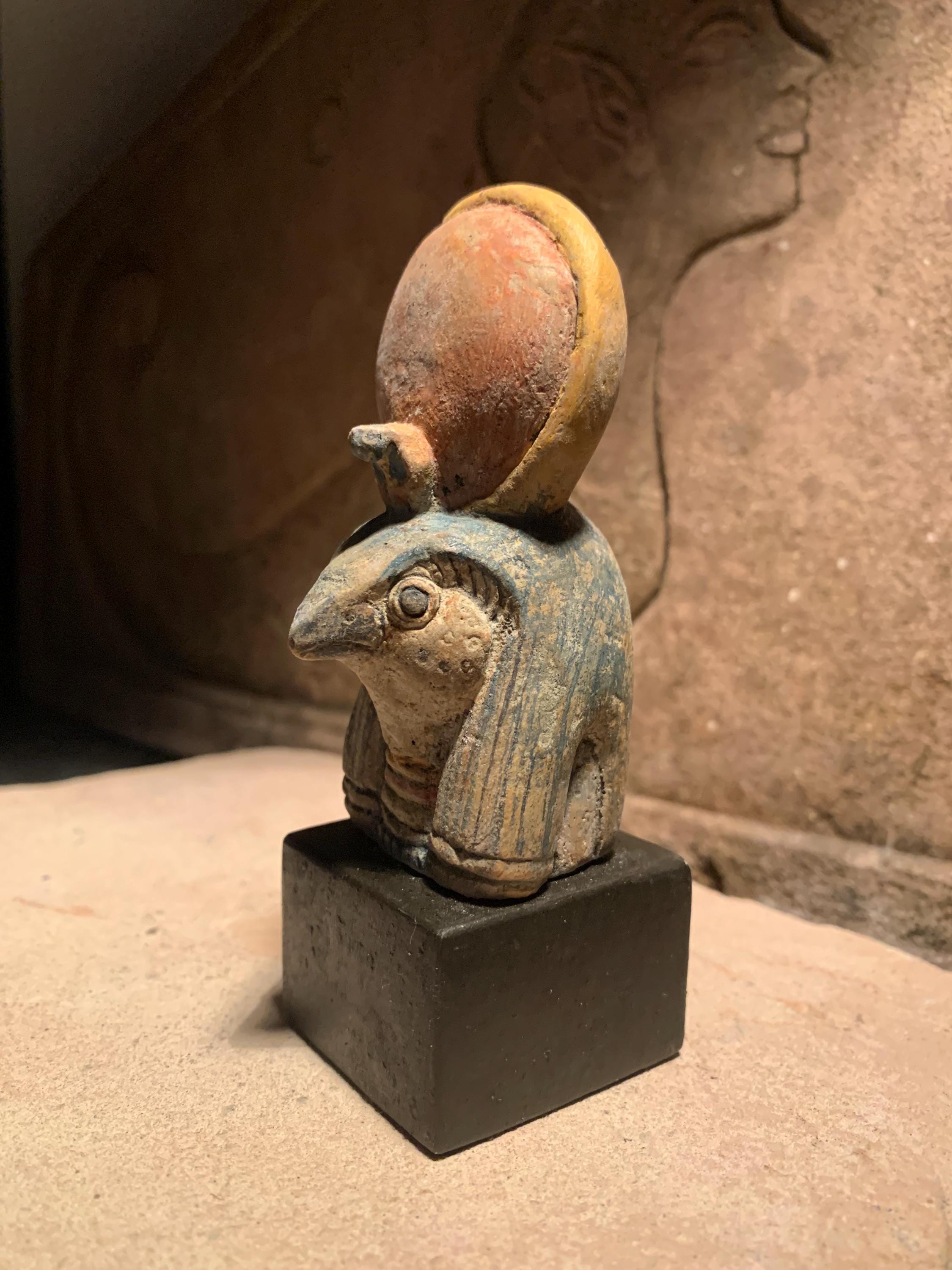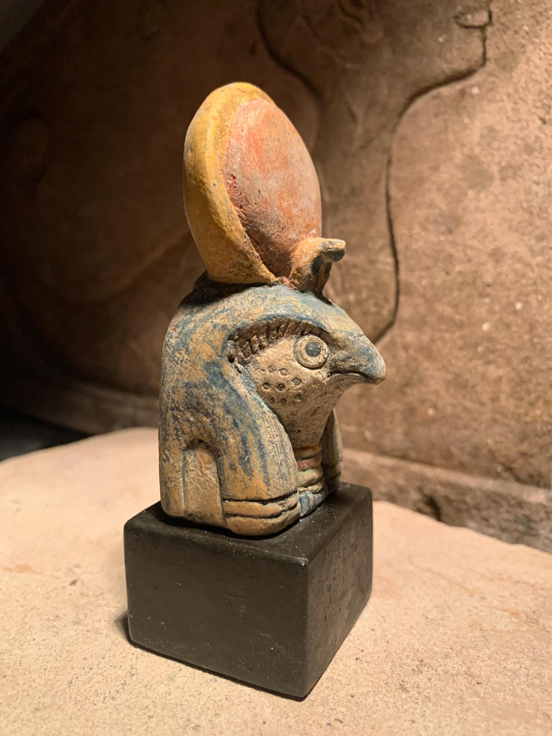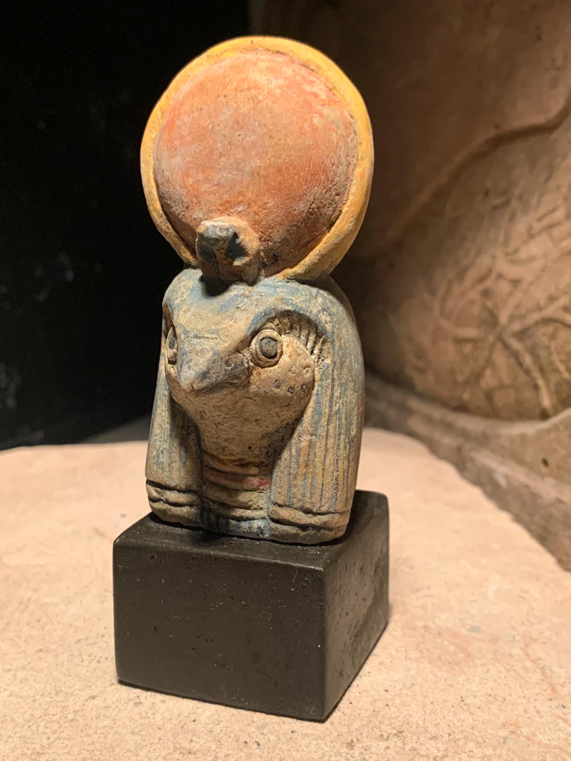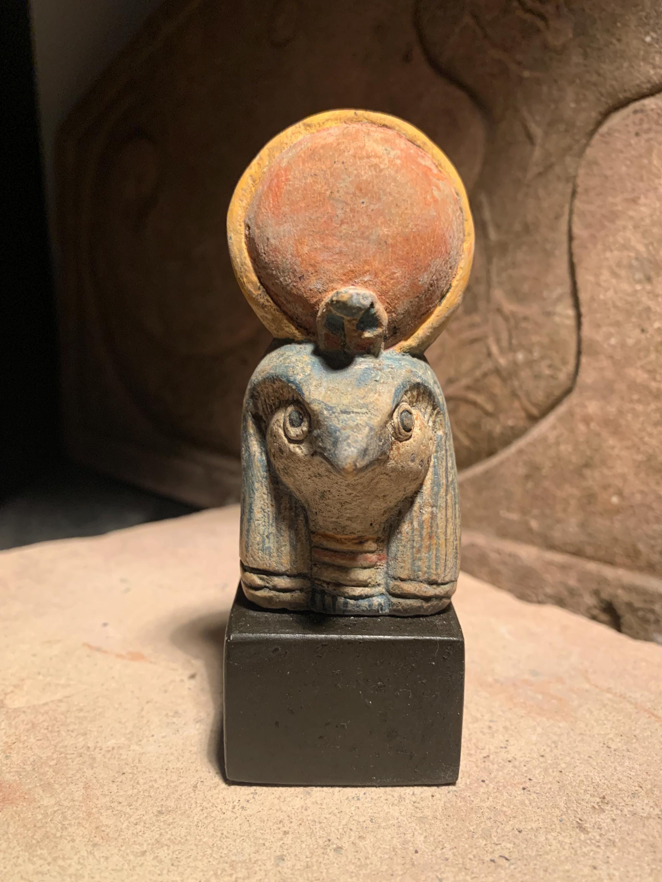 On offer here is a replica of one of my original Ra statues. Made of a limestone and quartzite composition stone, It has been hand painted in traditional Egyptian colours with the disc of the sun a subdued red. It has a very realistic ancient look and feel and It is mounted on a polished, felt based stand.