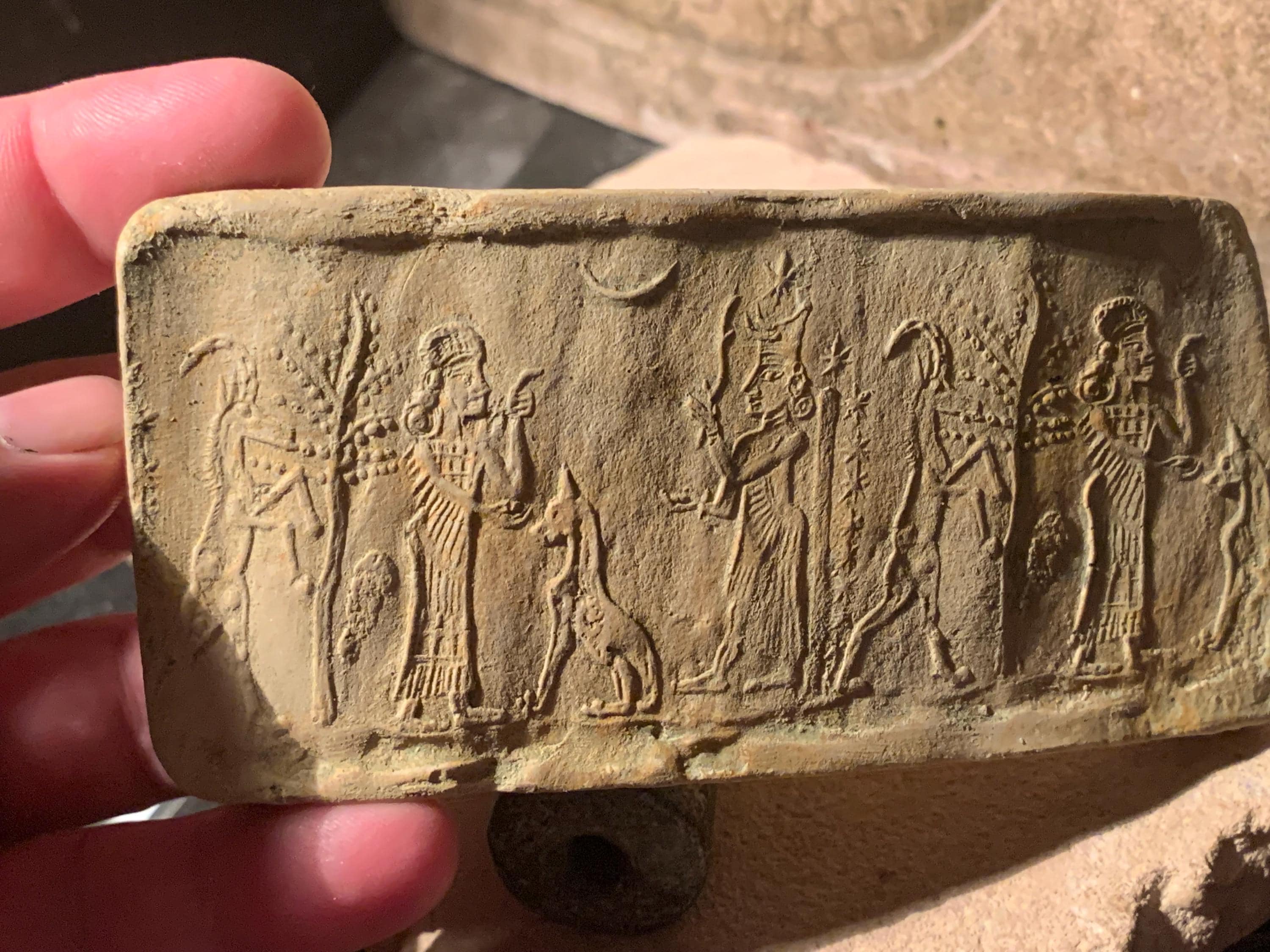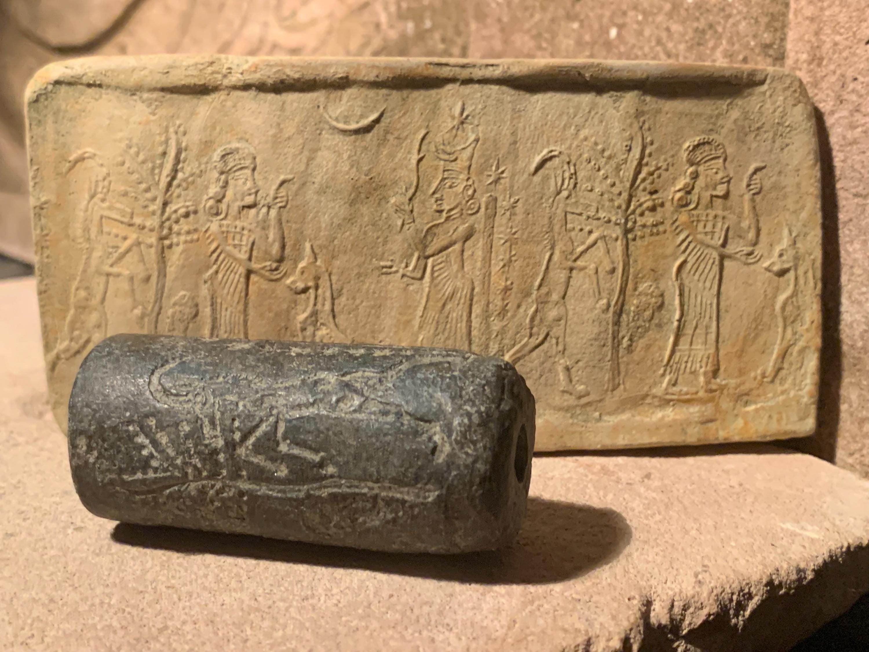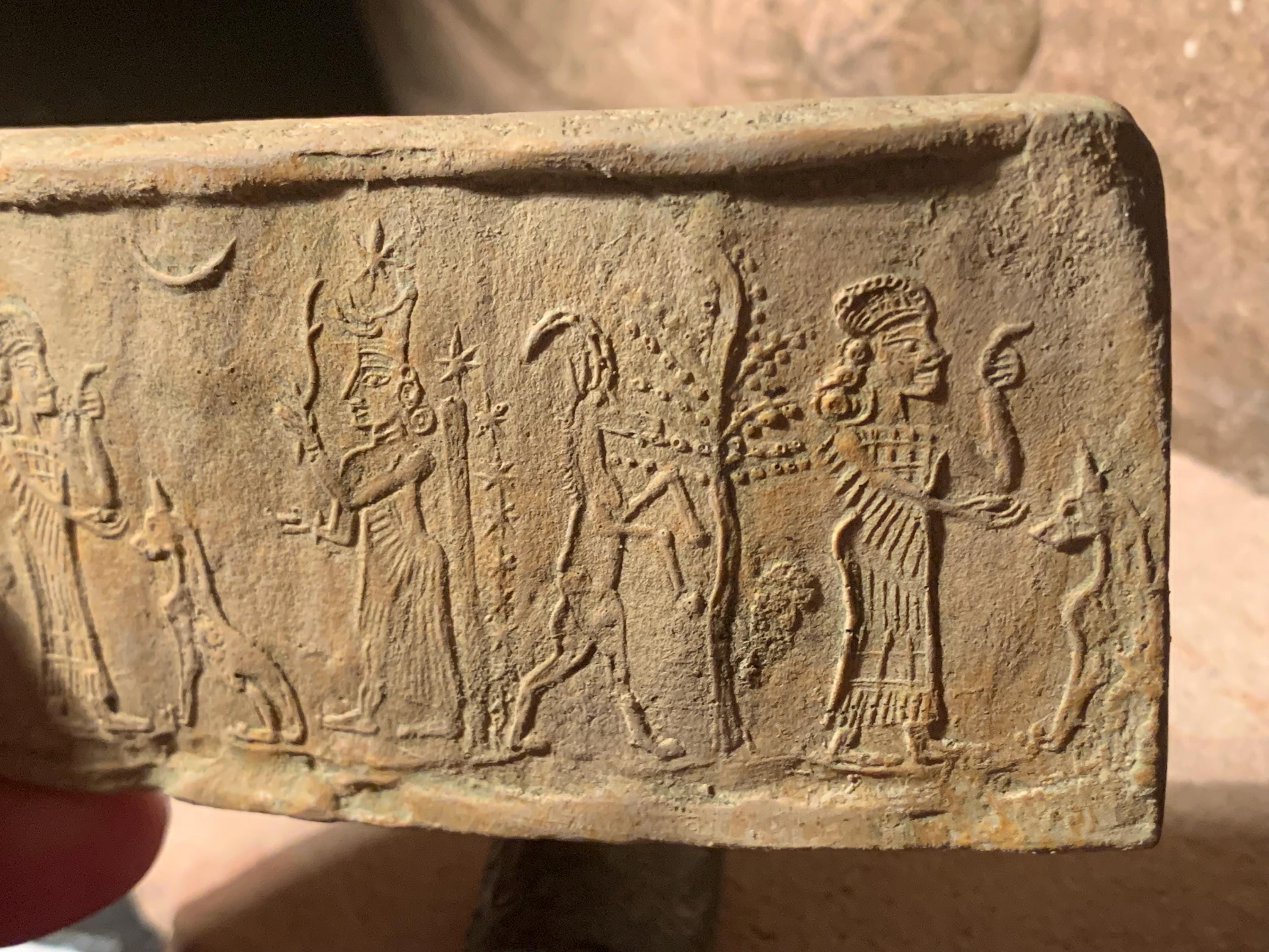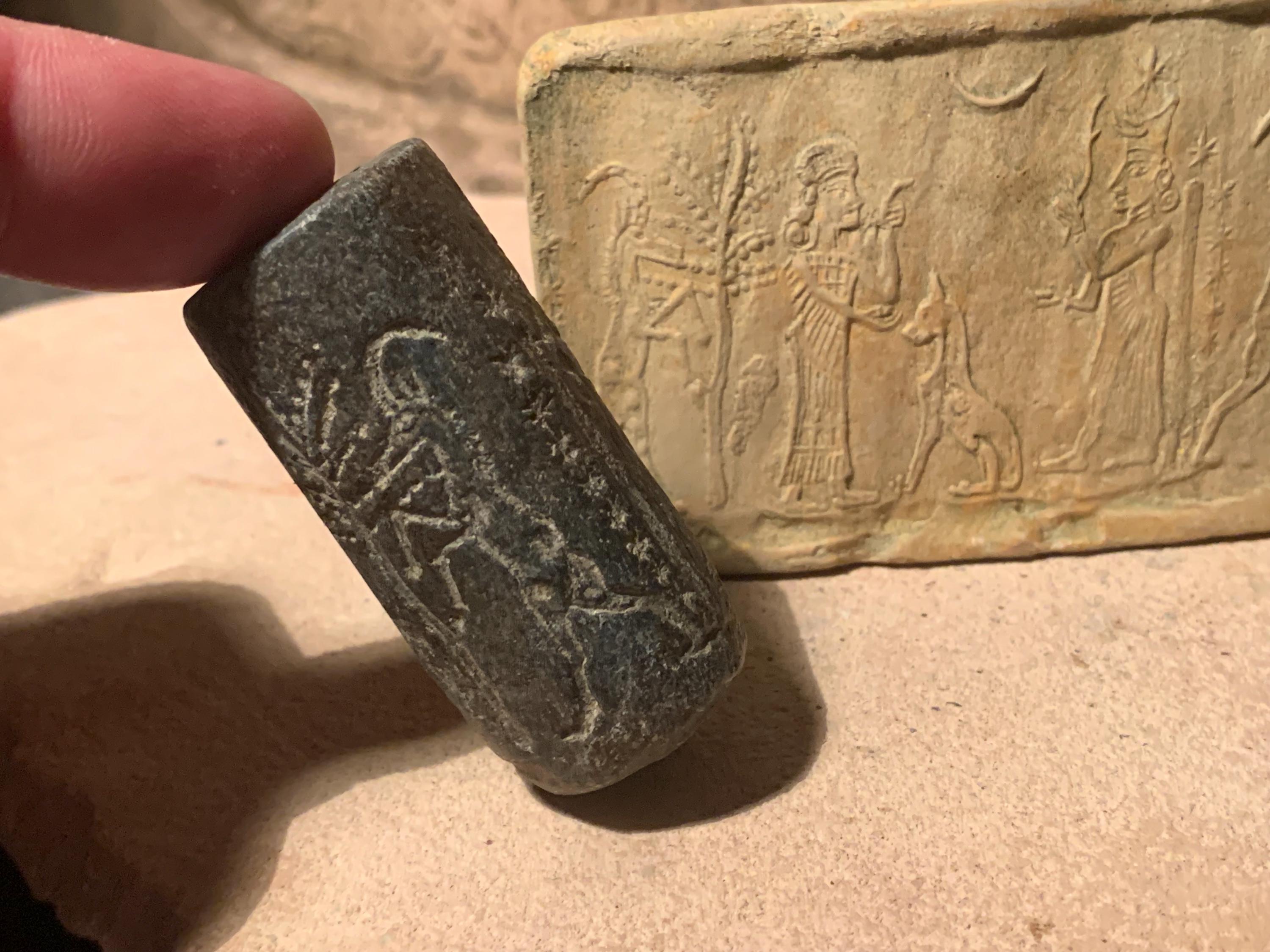The healing Goddess Gula. Available here is a charming cylinder seal replica with an impression of the design it creates.