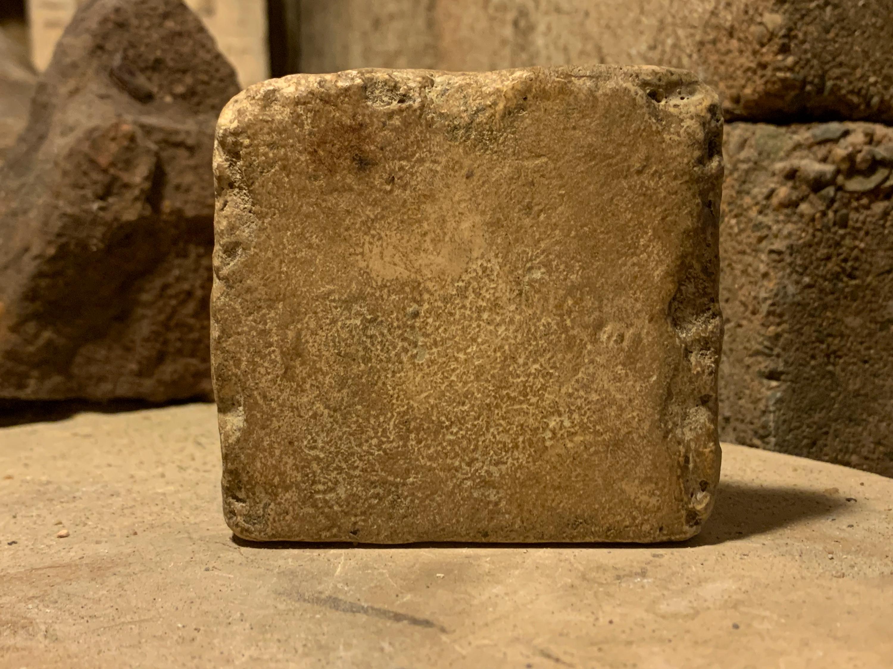 Made of a limestone and quartzite composition stone, it has an aged, earthy patina.