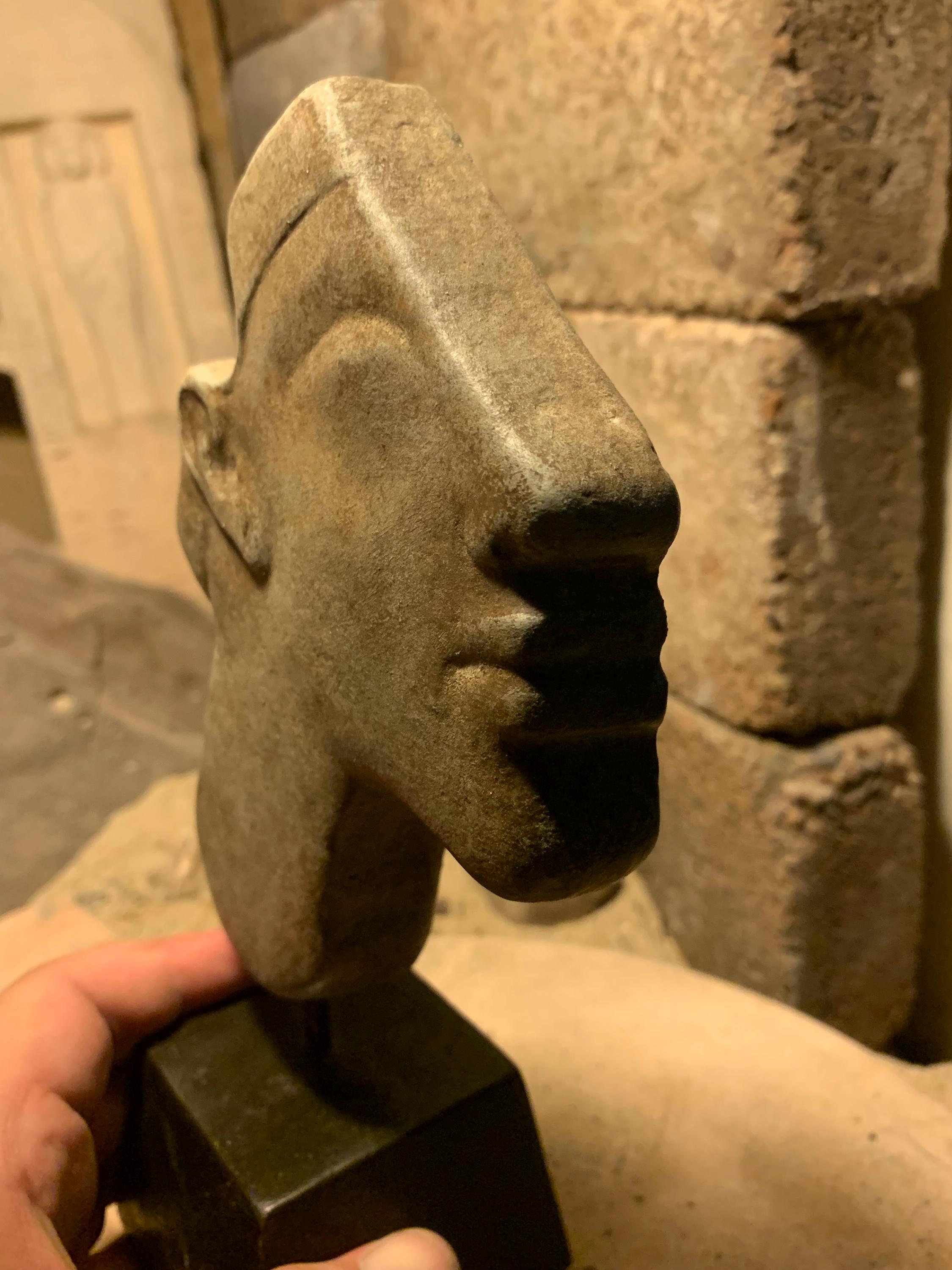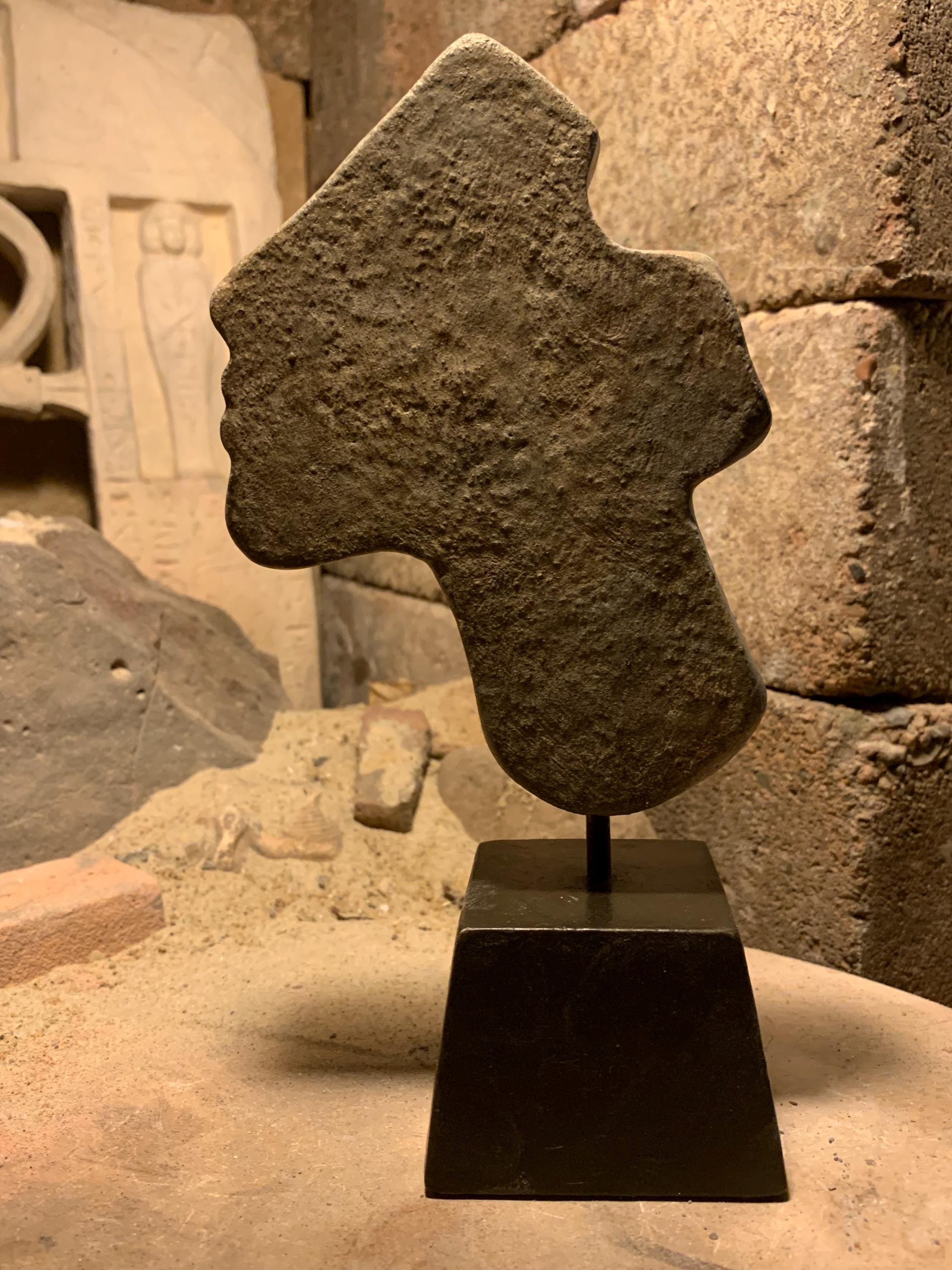 Made of a limestone and quartzite composition stone it has a well developed aged ochre patina and is mounted on a stand offering a striking display effect.