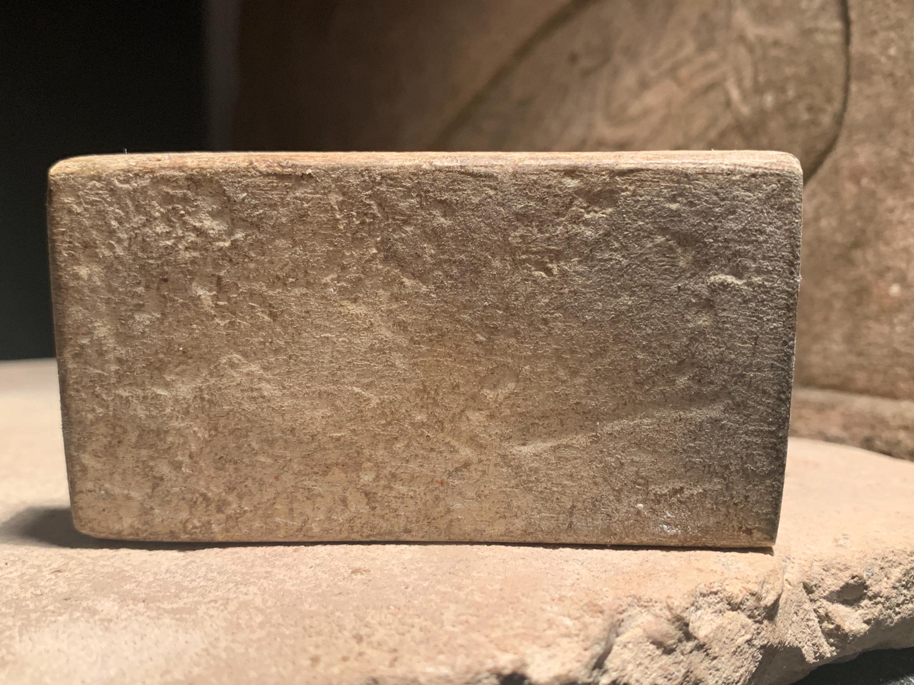 Made of a limestone and quartzite composition stone it has an aged patina with a light polish.