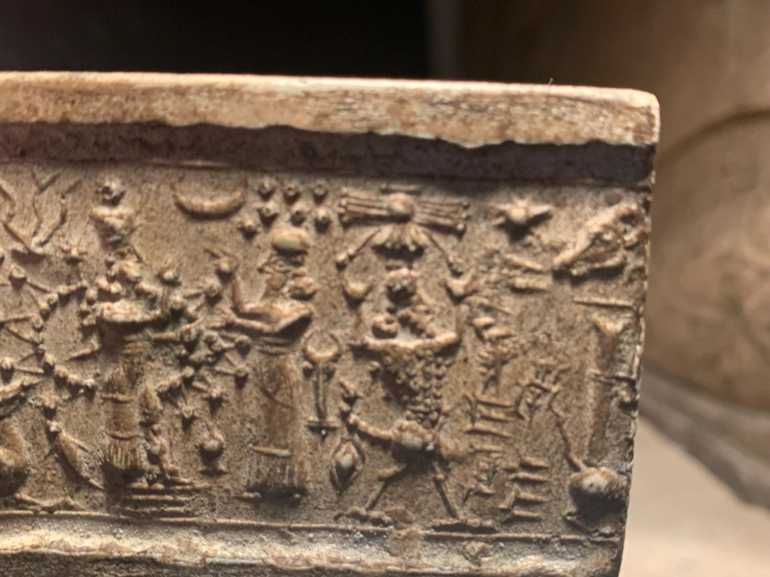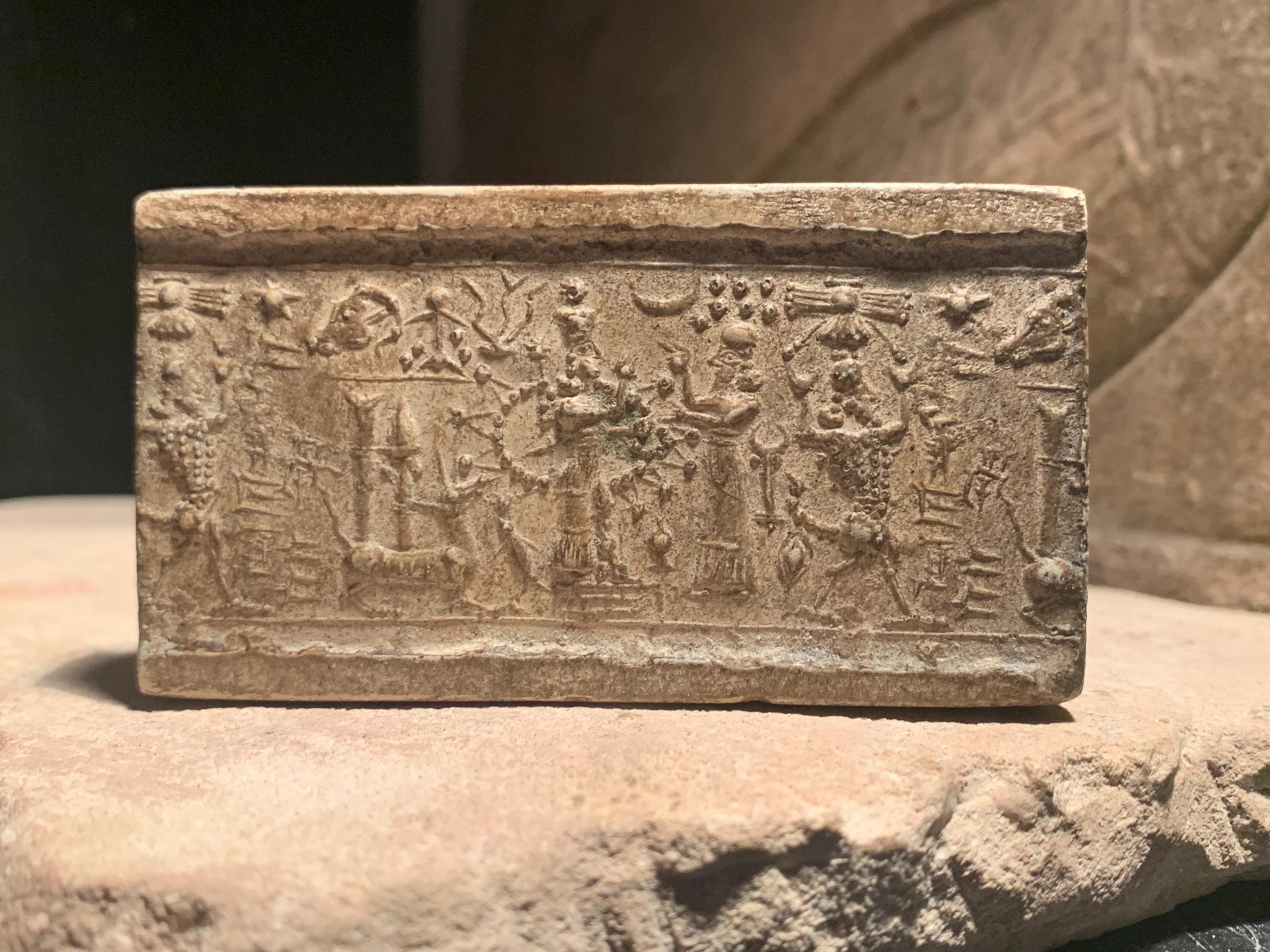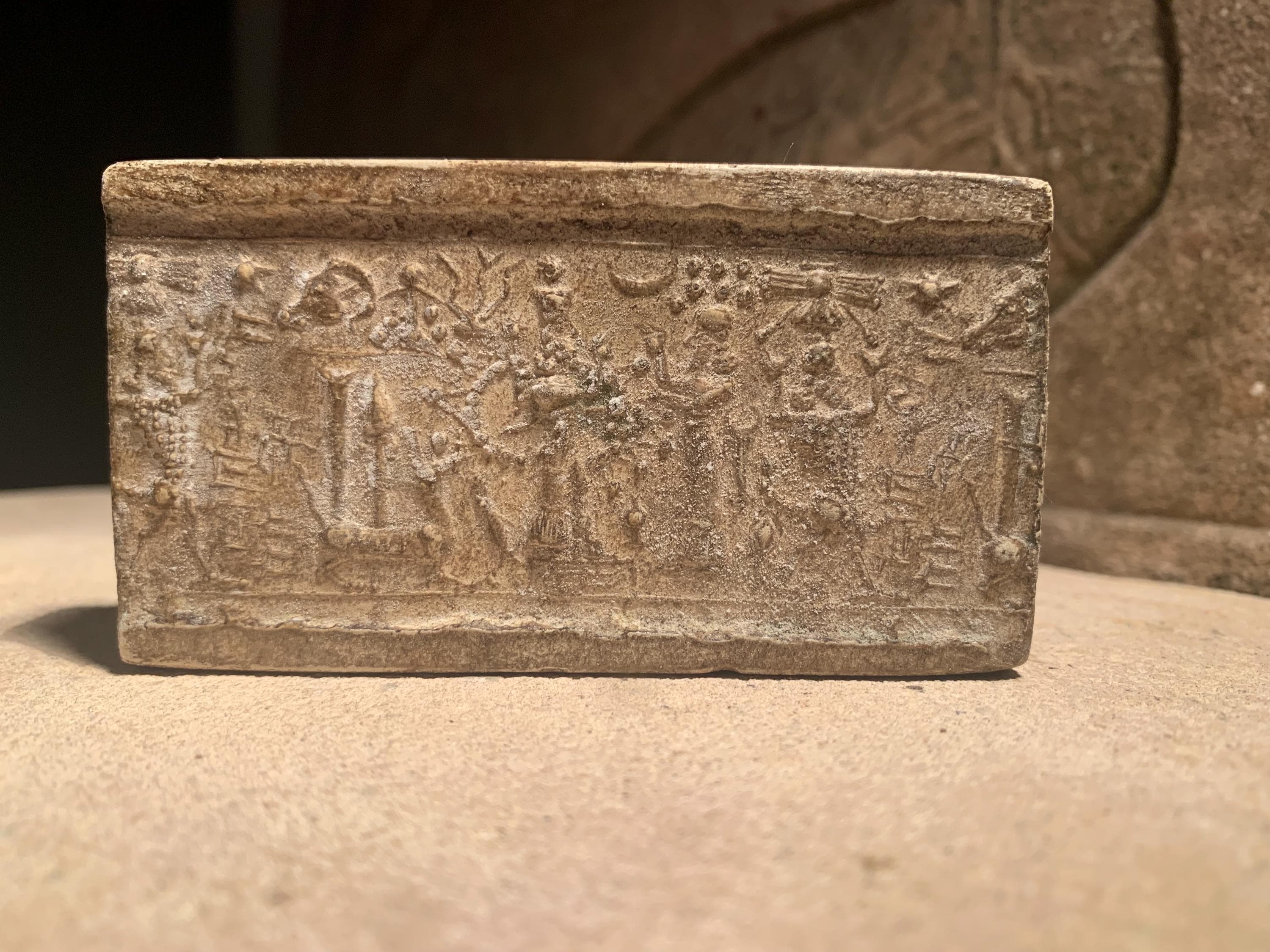 On offer here is an Assyrian cylinder seal impression replica featuring the Goddess Ishtar amidst a complex design of astronomical relevance.