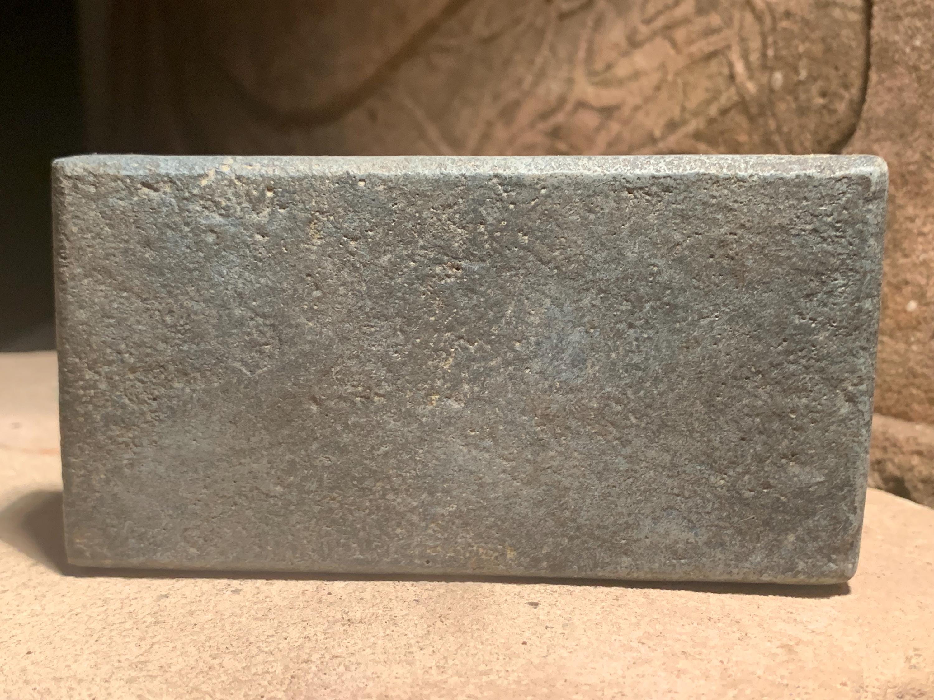 Made of a limestone and quartzite composition stone this piece has an aged slate black patina with a light polish.
