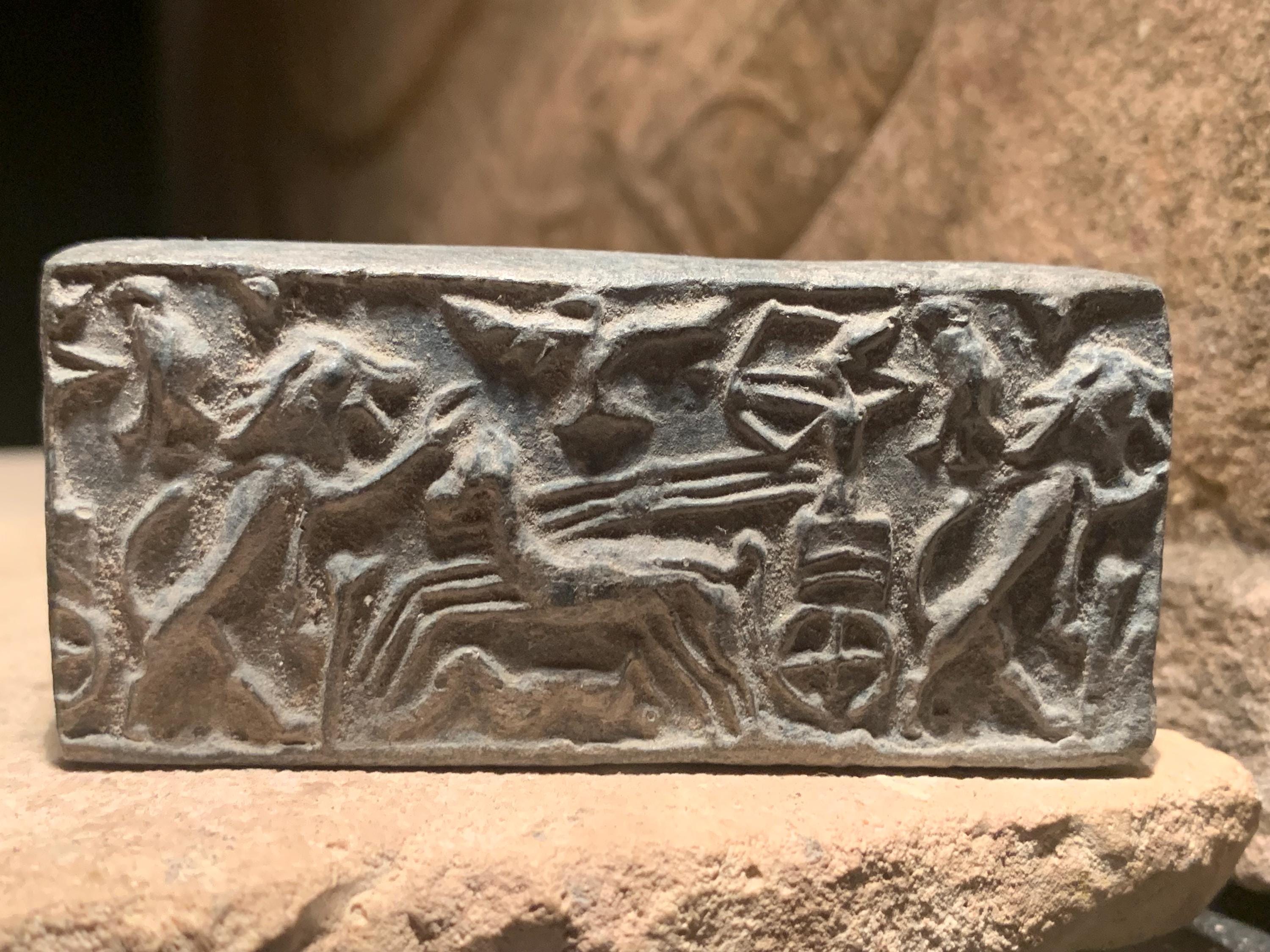 The seal impression depicts an Ugarit king hunting a lion in a chariot, one of the earliest depictions of the vehicle. Beneath the wheels can be seen a vanquished enemy emphasizing the power and might of the king.