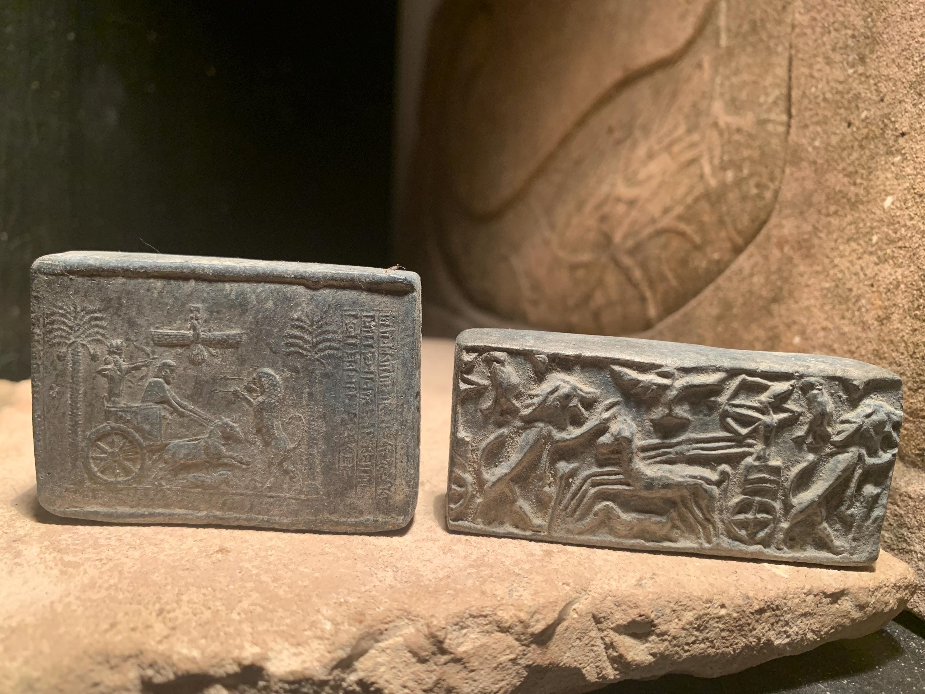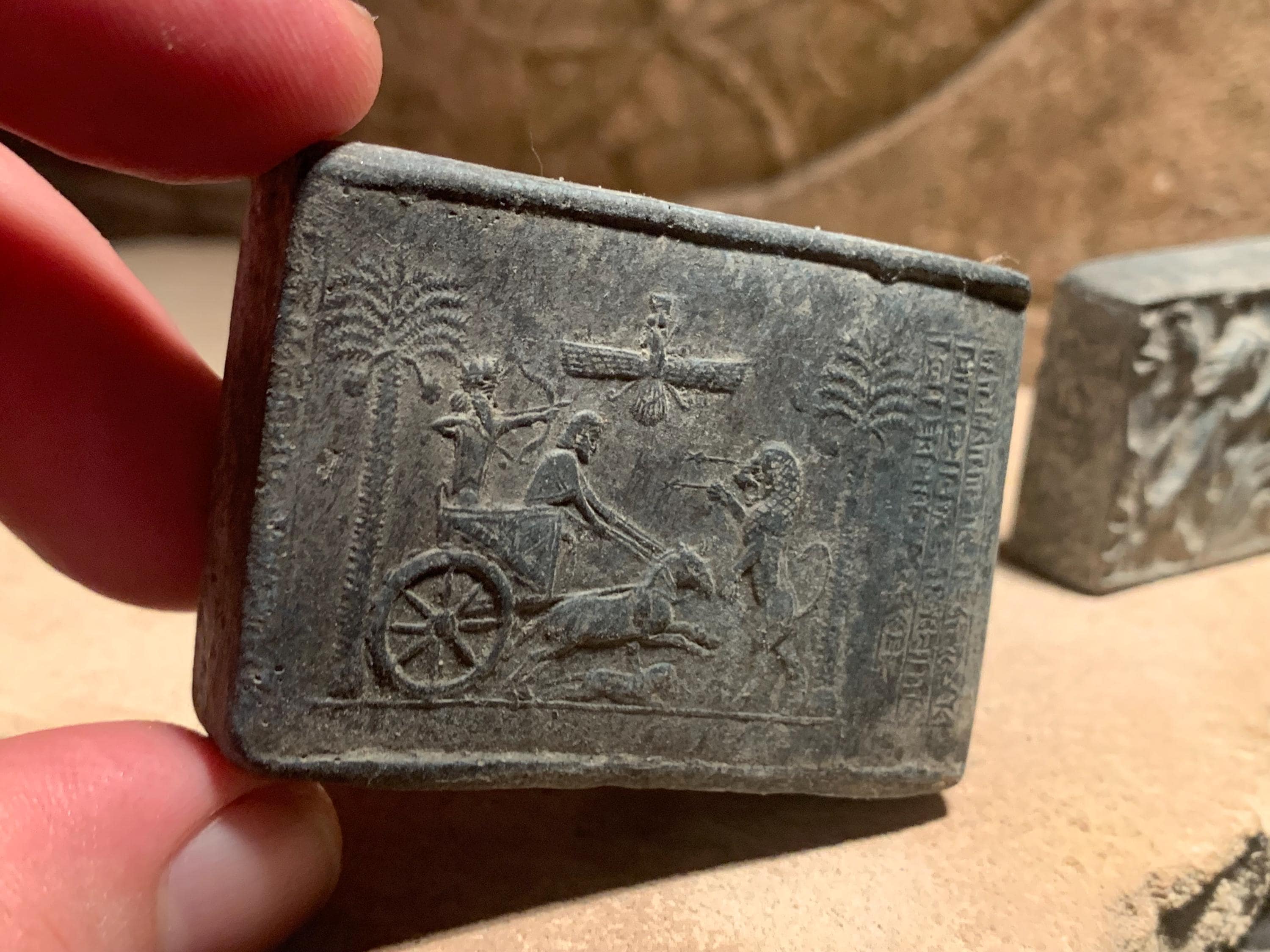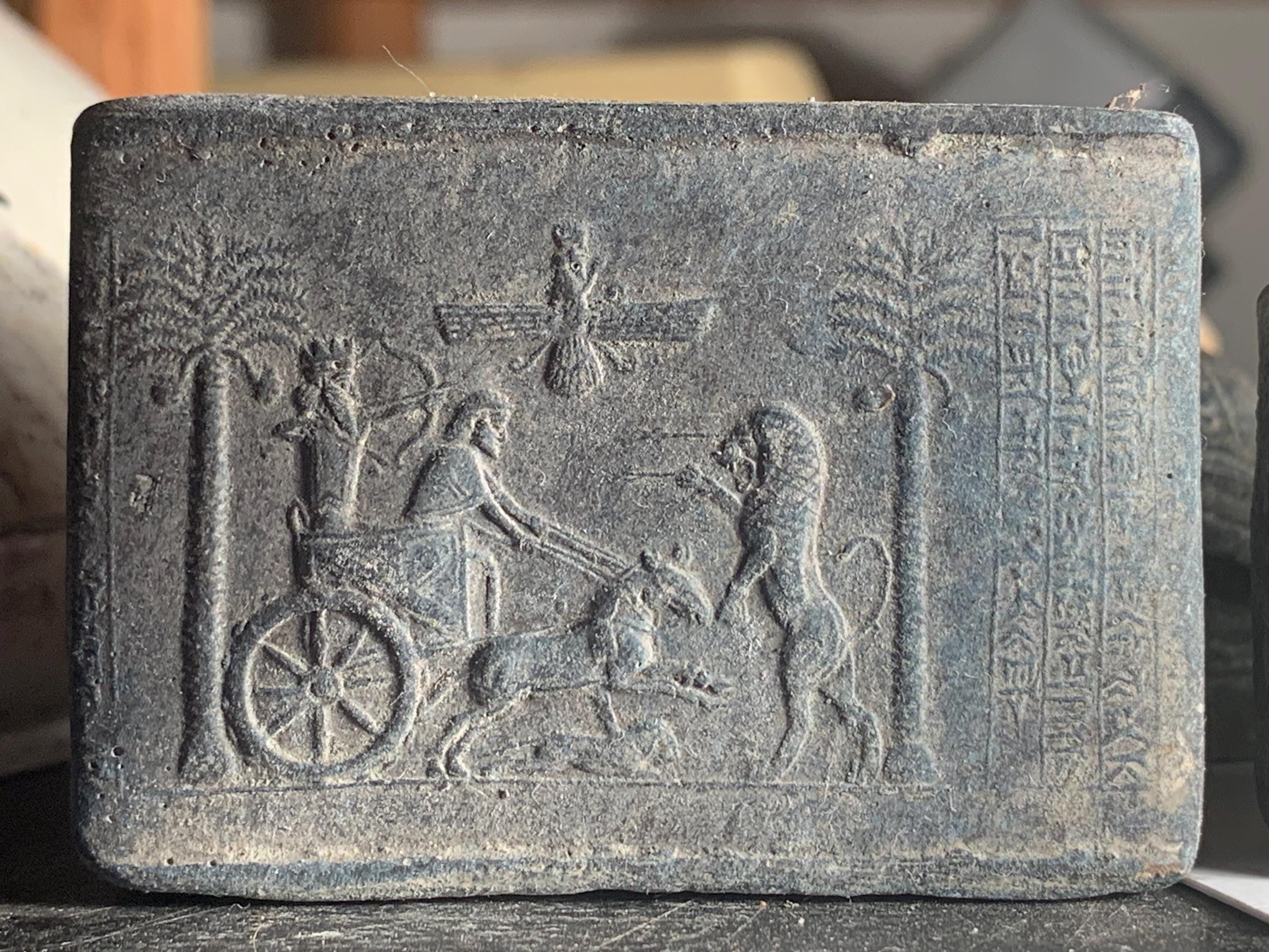 The Darius impression shows similar iconography however Ahuru Mazda hovers above as king Darius hunts a raging lion in a palm grove. The cuneiform script details King Darius’s exploits which is symbolic of mastery over chaos.