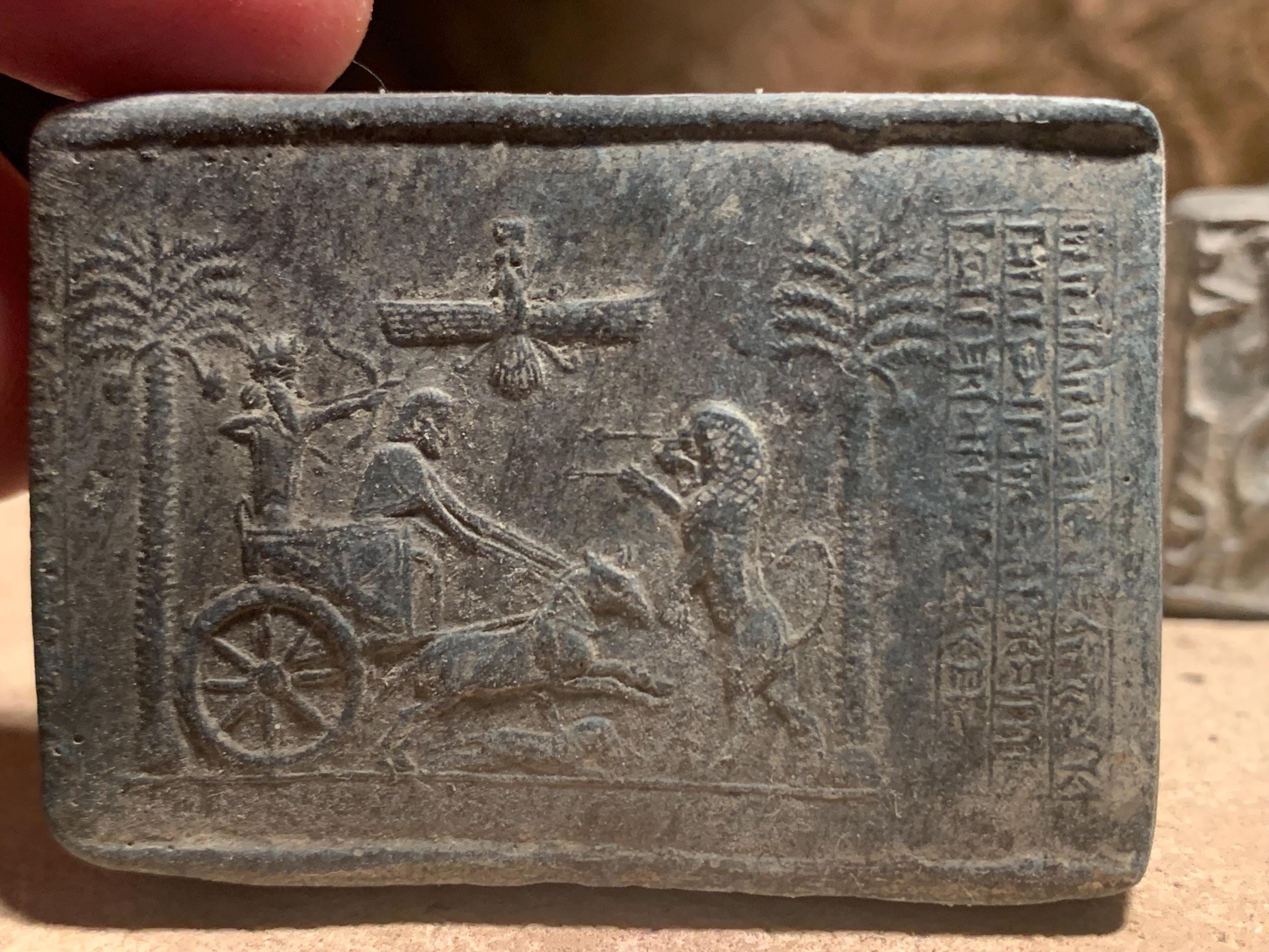 On offer here are a pair of replica cylinder seal impressions which feature the chariot at different stages of development and refinement. The early Ugarit version and the later Persian example maybe separated by many generations, but they share a common pride and desire to advertise the two wheeled marvel of the age.