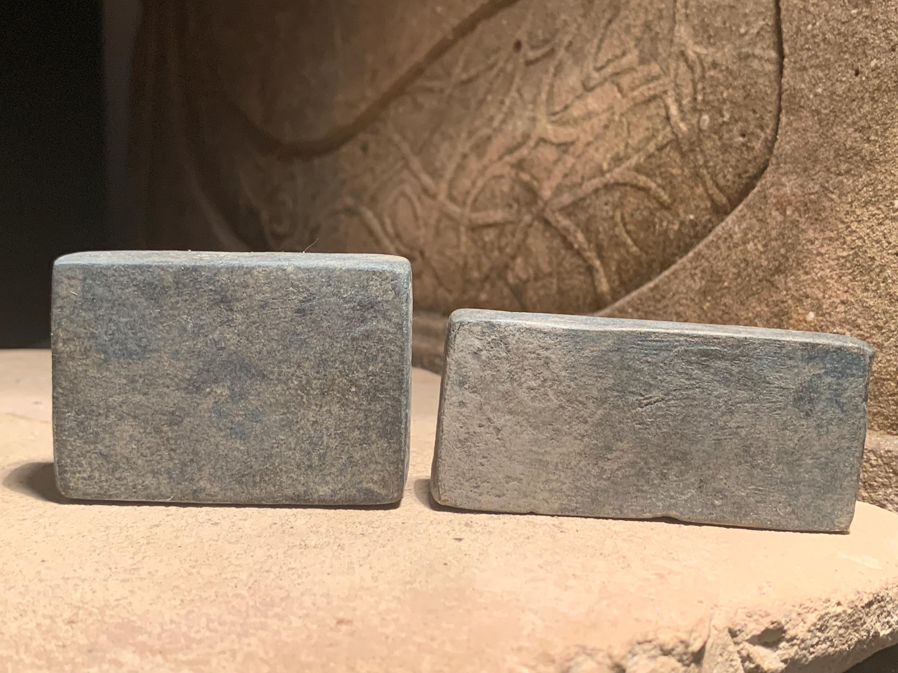 Made of a limestone and quartzite composition stone it has an aged patina.