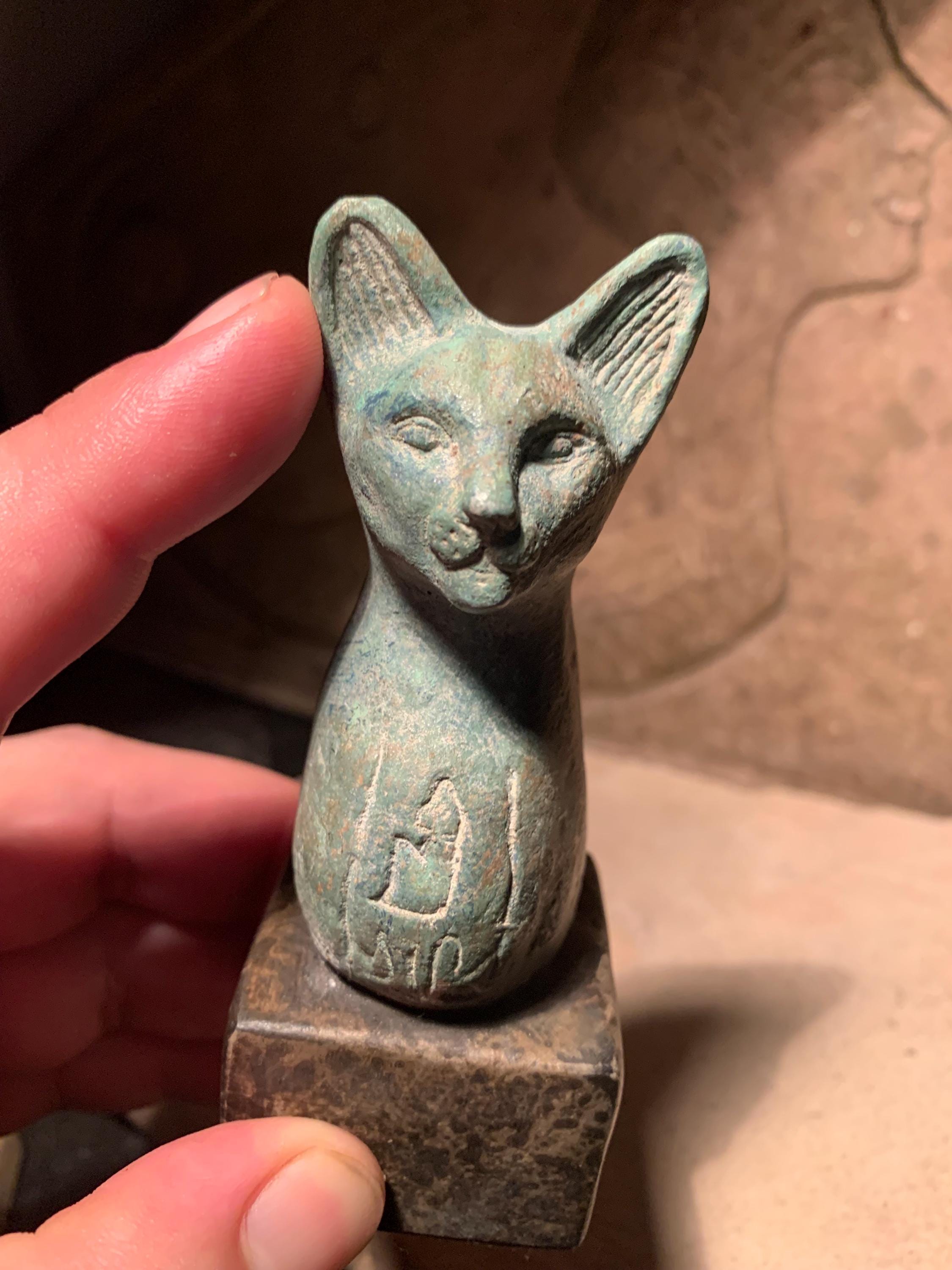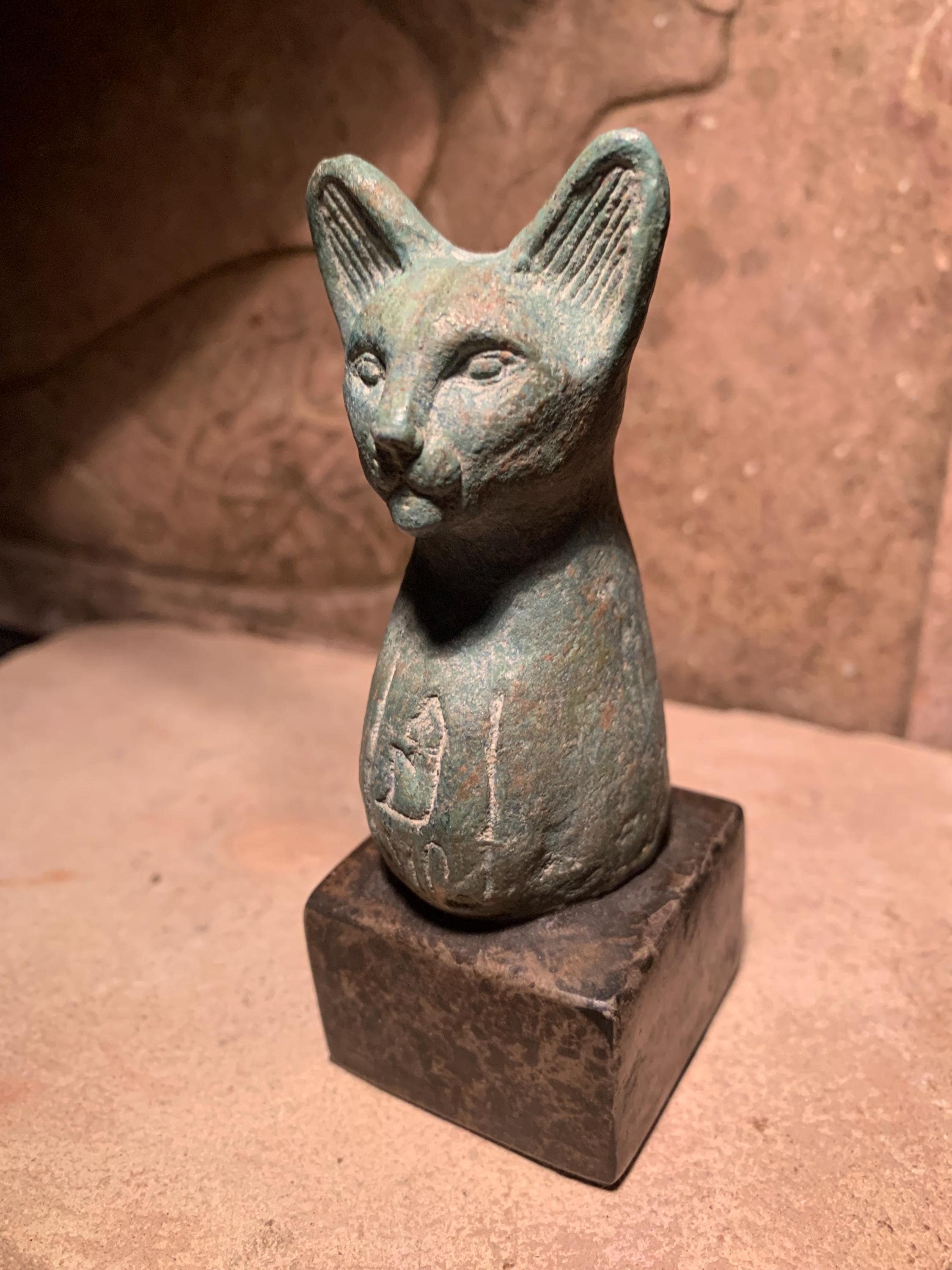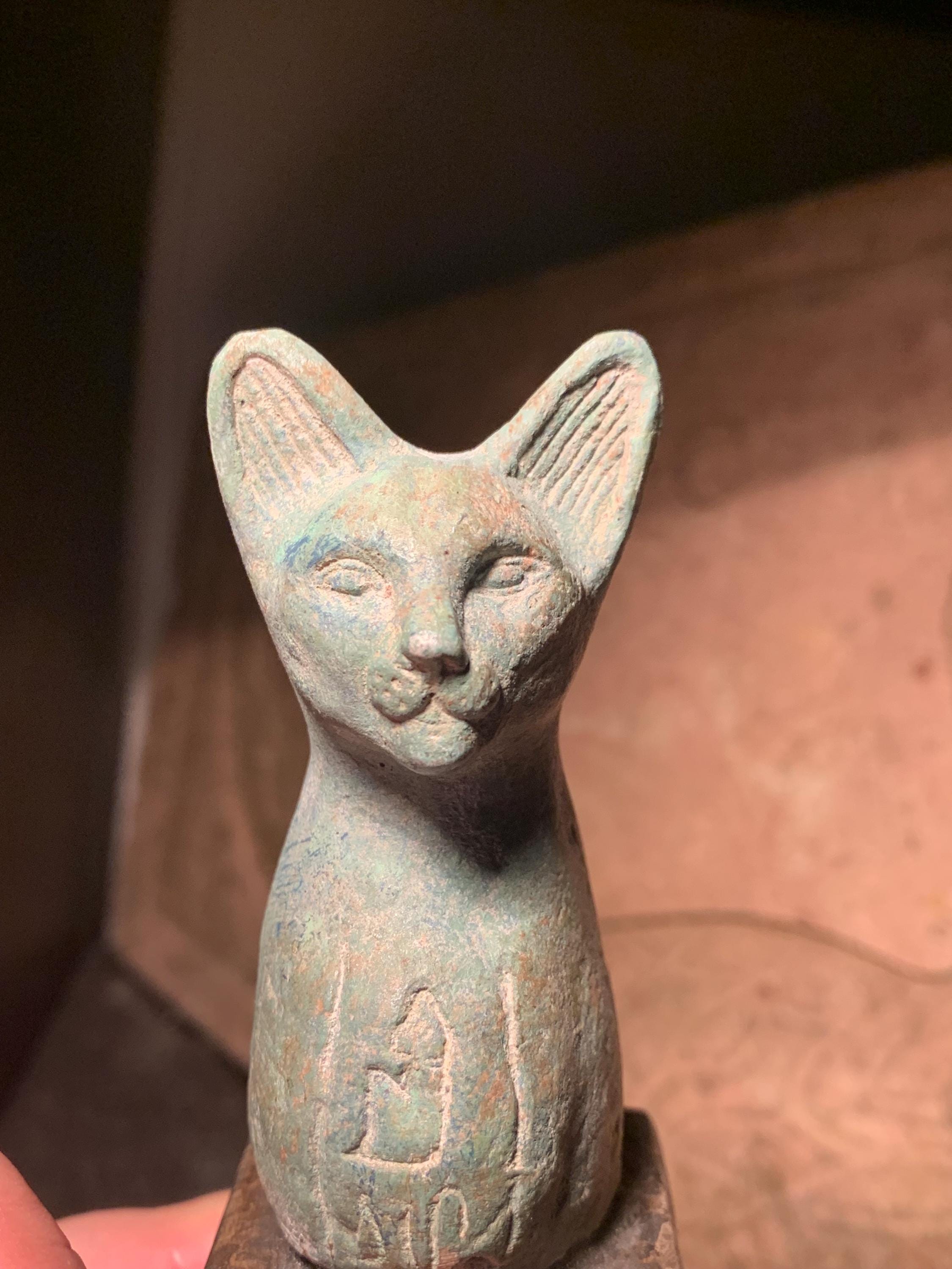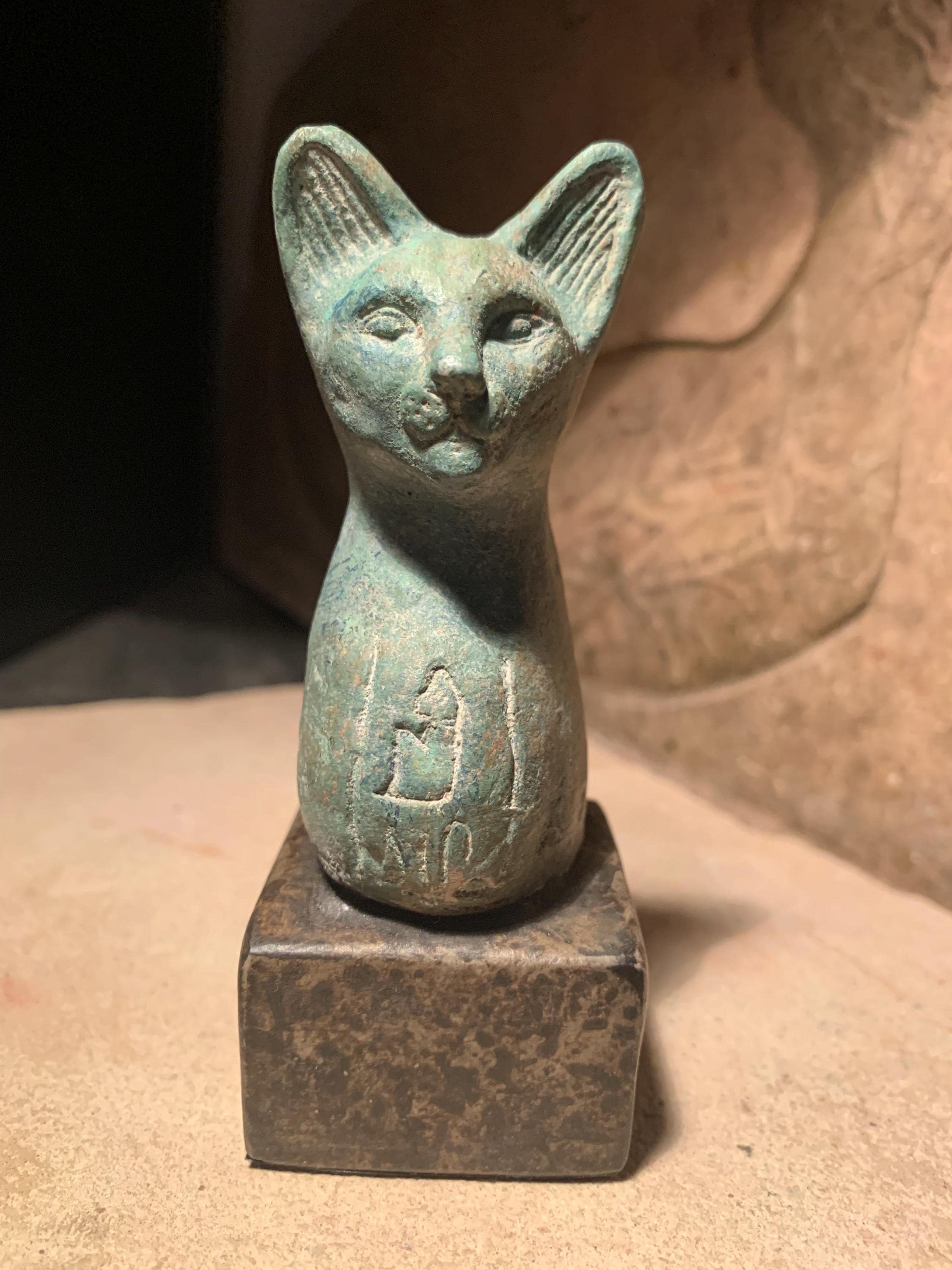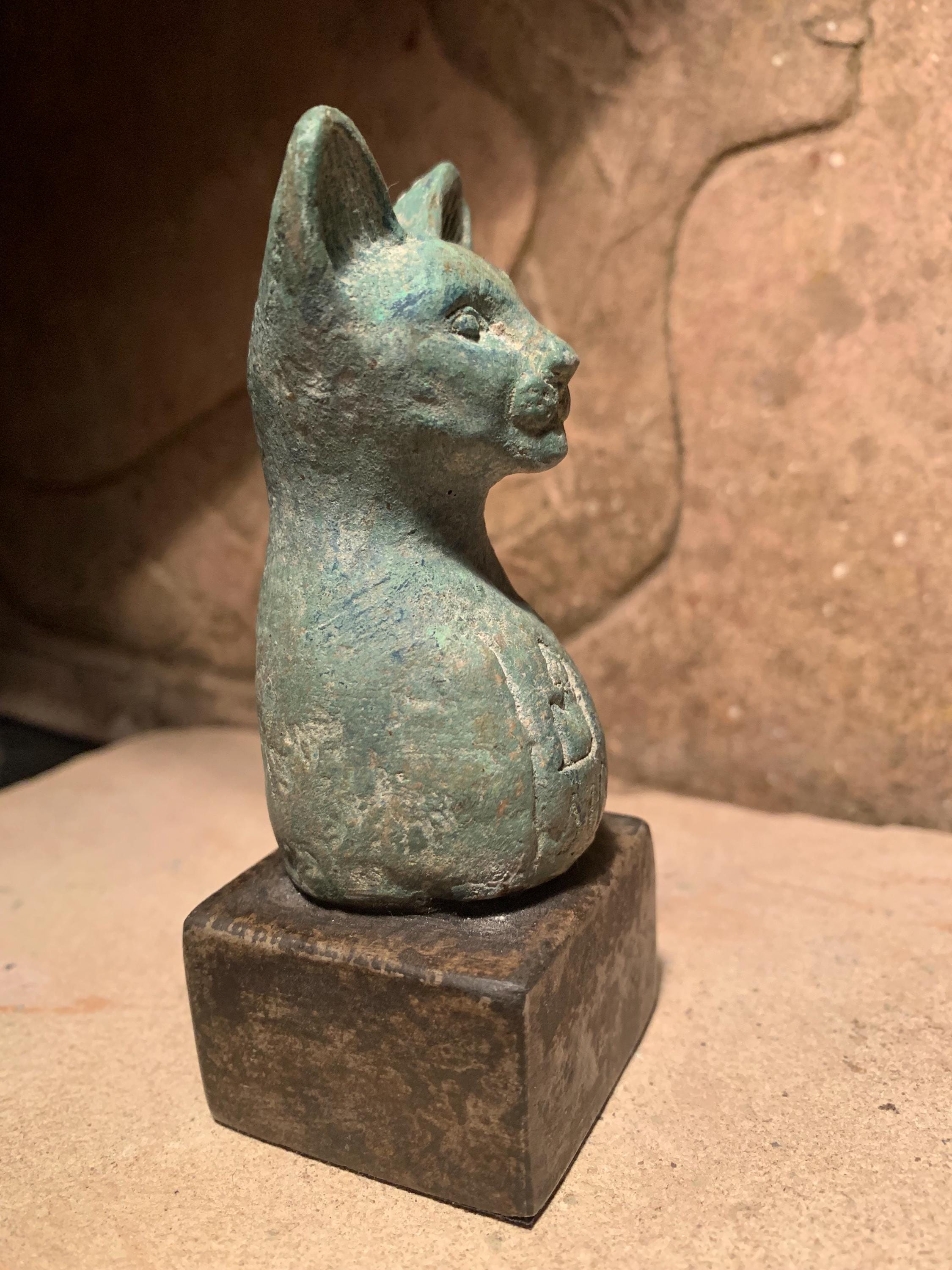 The attributes of Bast are in many ways similar to Hathor with music, dance and all manner of light hearted activity associated with her. She even shakes a Hathor Sistrum when depicted as a womanly figure with a feline head. She could of course be shown as just a cat without the human features. The ancient public would commission people like myself to make for them a statue or at least a votive head, to place in a temple as an offering to the goddess.