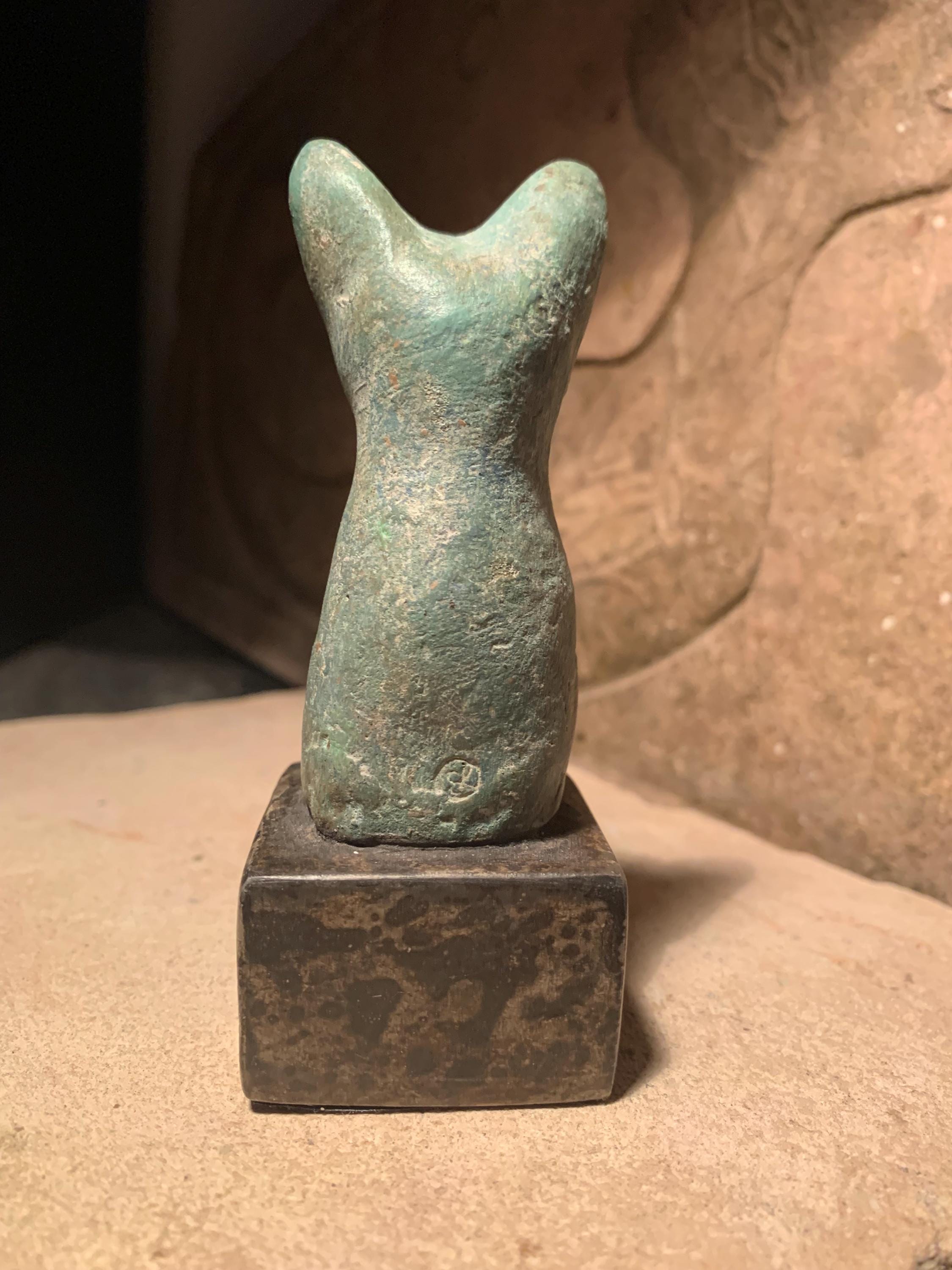 Mythology- Certainly a very popular figure in ancient Egypt from the earliest times when the domestic cat proved a worthy advantage to have protect the hard won food stuffs of the ancient pantry or temple storehouse. By dynasty number 2 she was already known and revered before a single pyramid was built. In the pantheon of Egyptian divinity she was both wife and a daughter of Ra the sun god. She had a son named Maahes who had the body of a man and the head of a lion wearing an atef crown. (See listing -'miniature Osiris wearing Atef crown') If available.