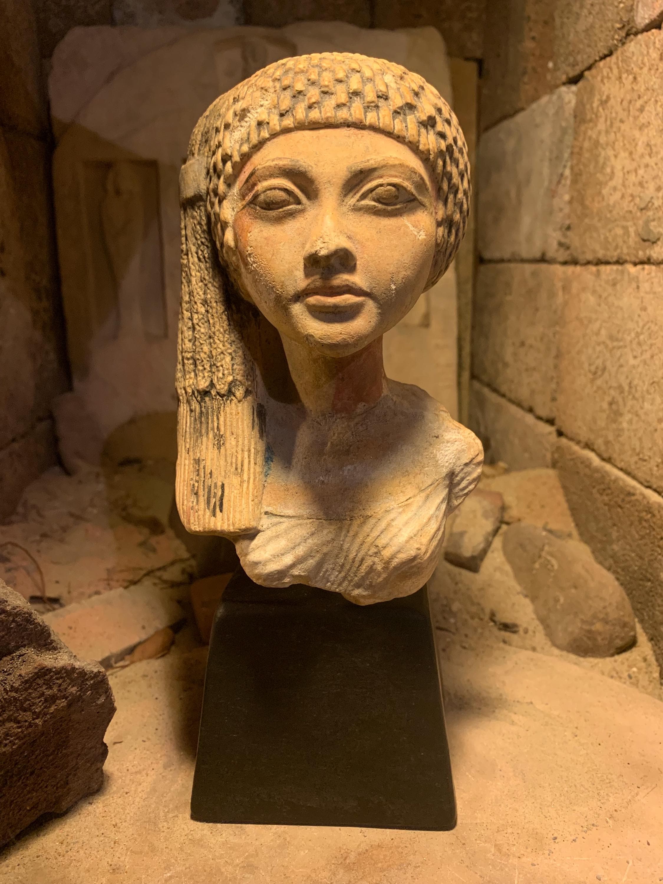 Available here is a fine version of the Amarna princess with sidelock. This replica is made of a limestone and quartzite composition stone and it has carefully painted details to offer an authentic look akin to the original fragment.